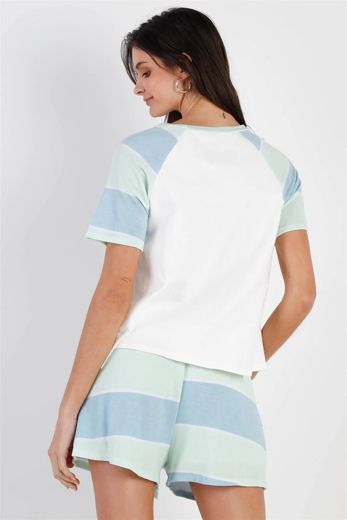 White & Mint Blue Stripe T-Shirt Top & Short Set /2-2-2