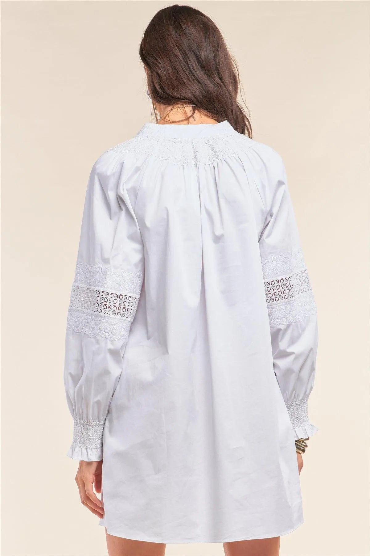White Long Sleeve Mock Neck Lace Embroidered Poplin Mini Dress /1-2-2-1