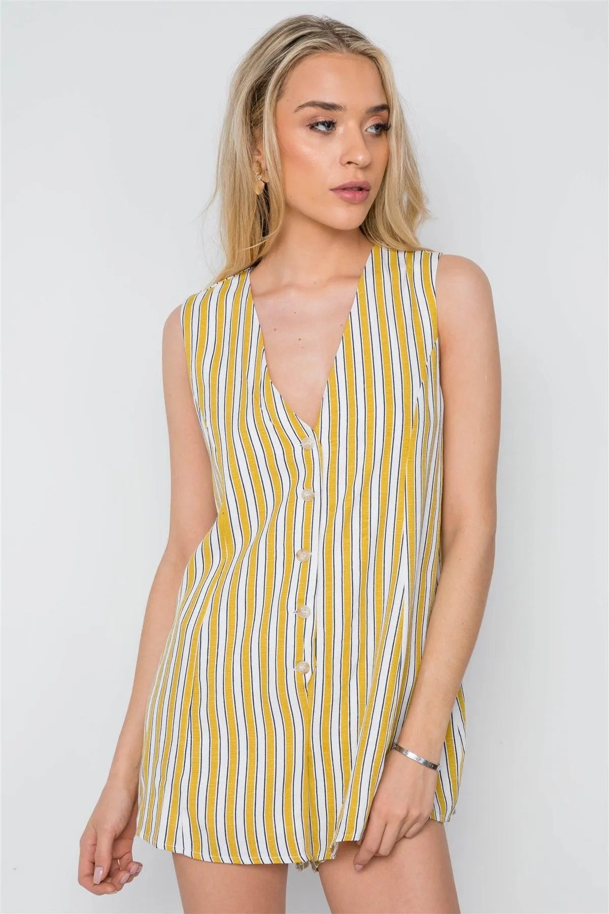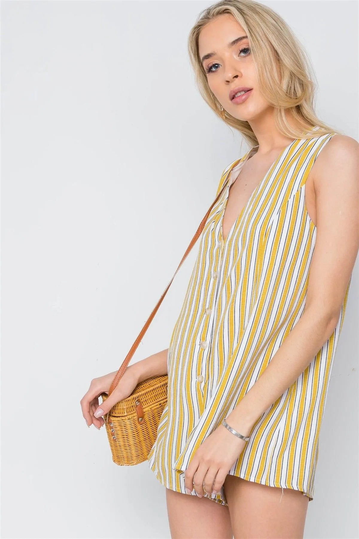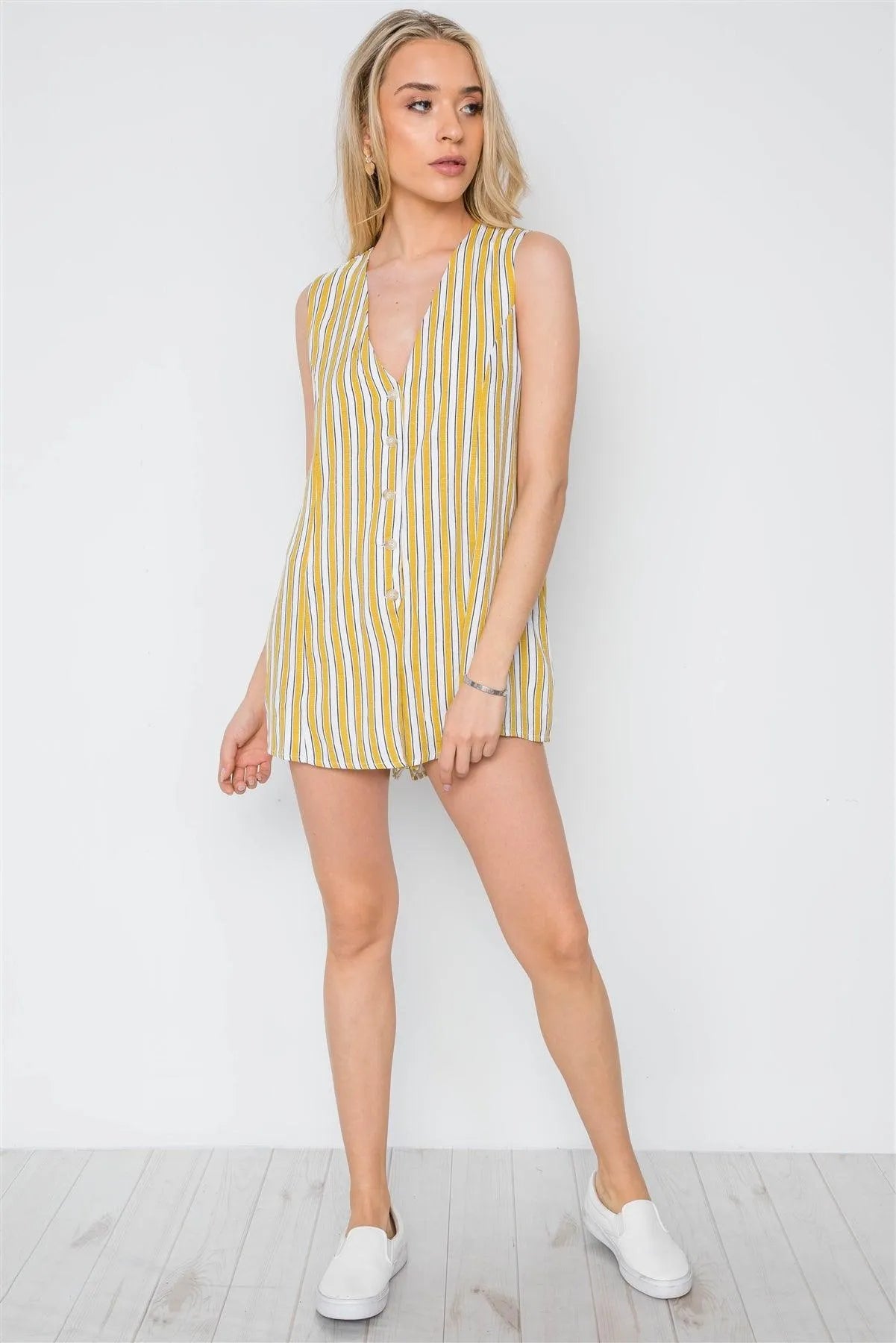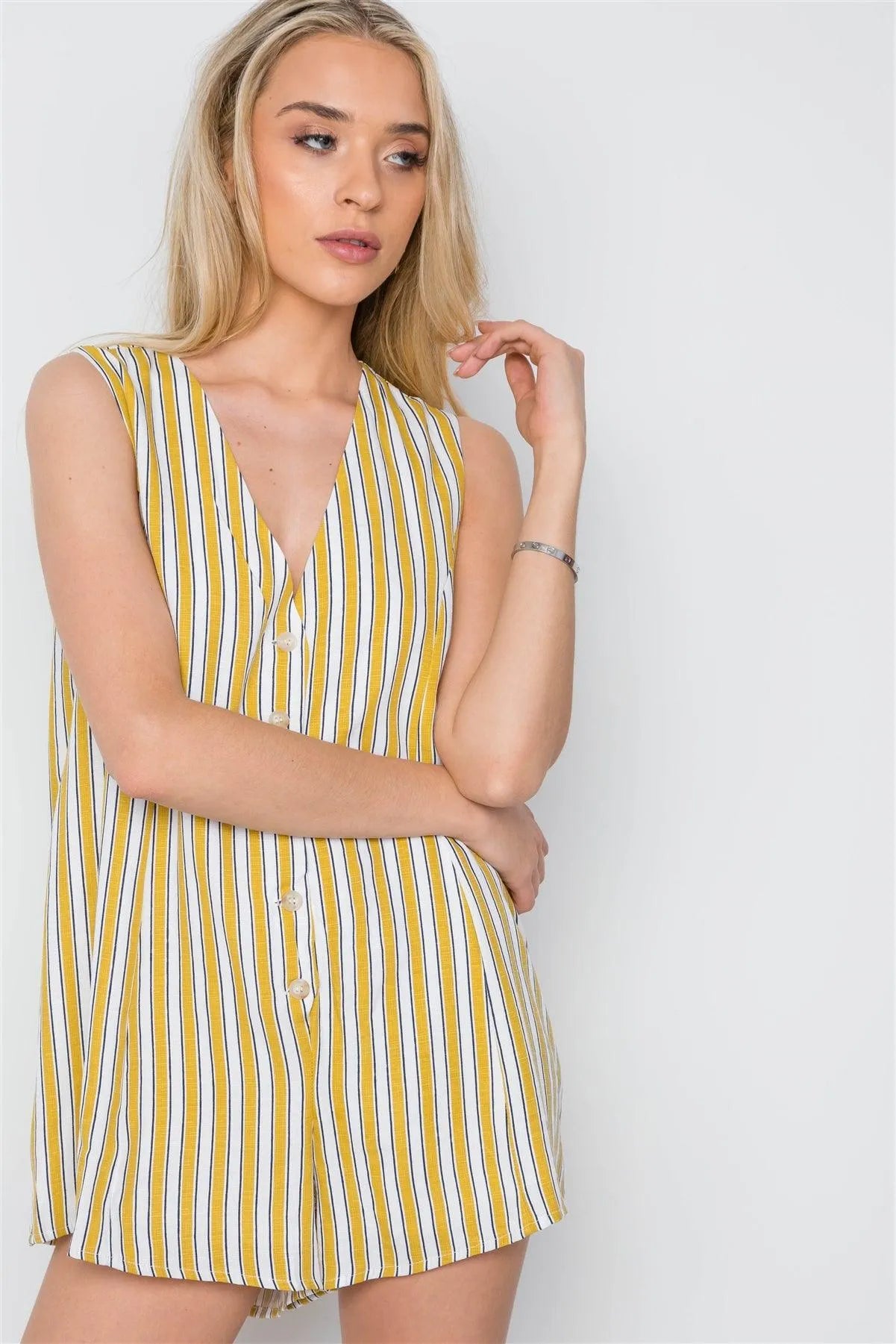 White Mustard Stripe Button Down Casual Romper /2-2-1