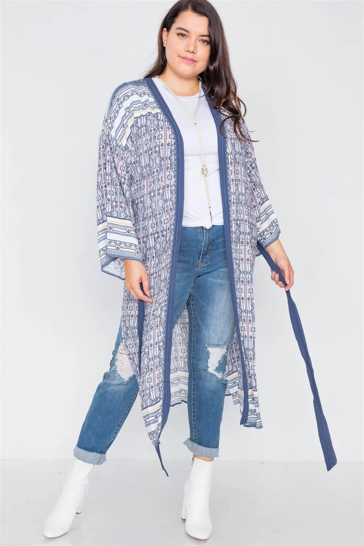 🖤 Item Features: white navy pink & yellow mix boho western festival print, unlined, kimono sleeves, side slits, waist tie.