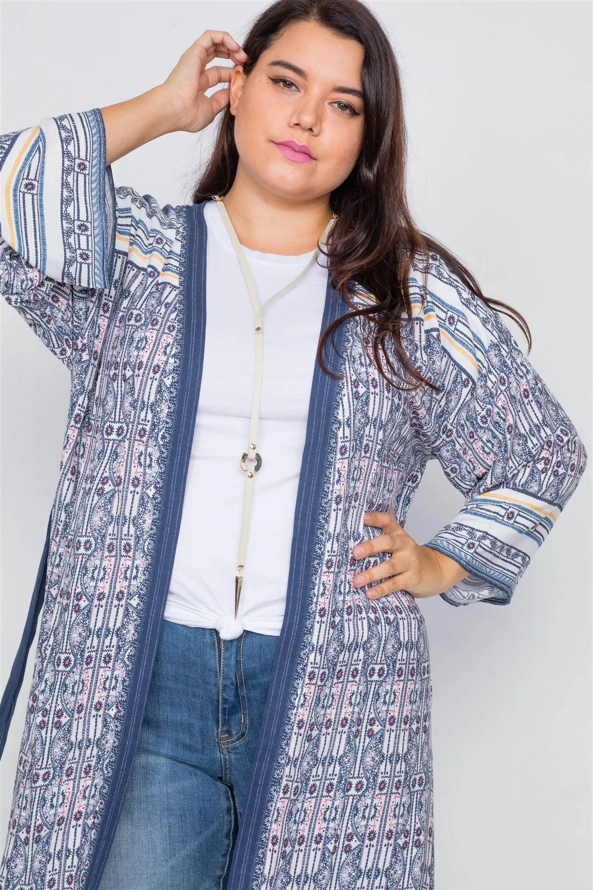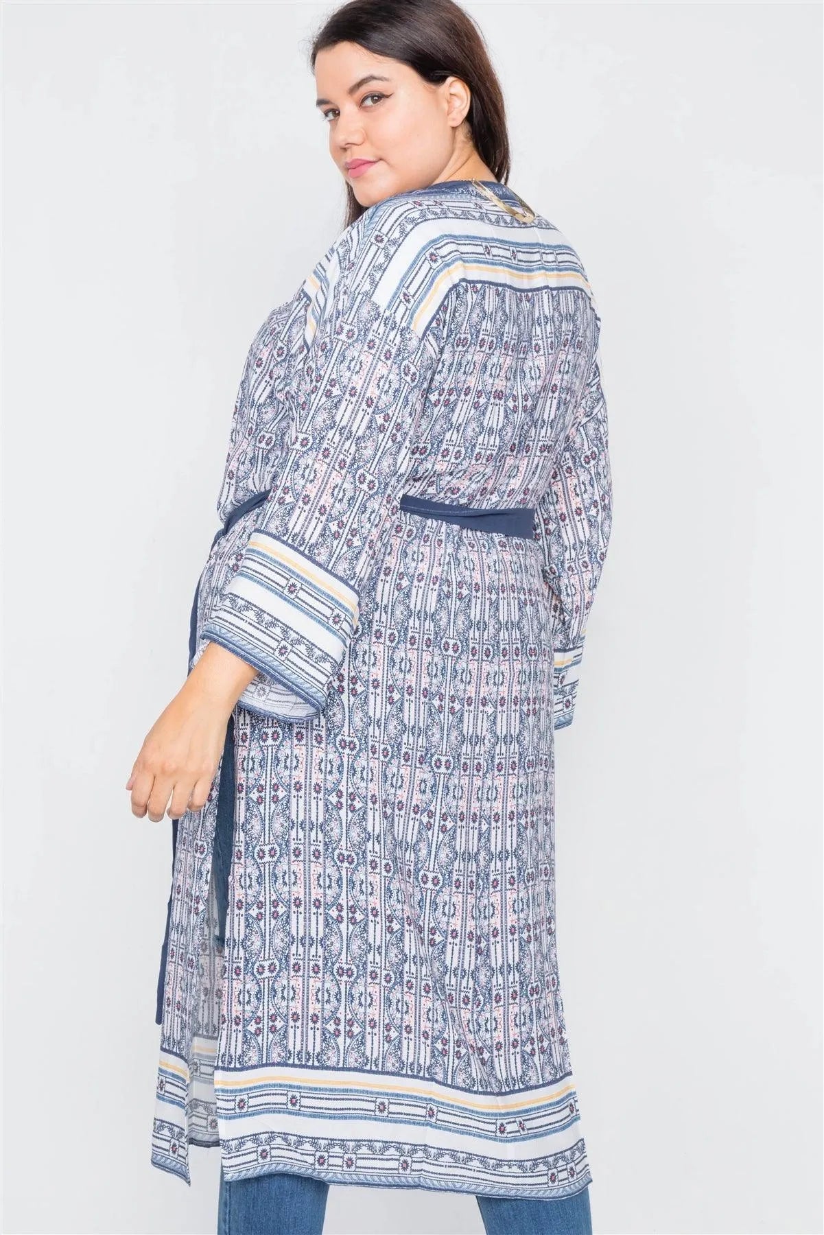Plus Size White Navy & Pink Festival Boho Print Maxi Kimono /2-2-2