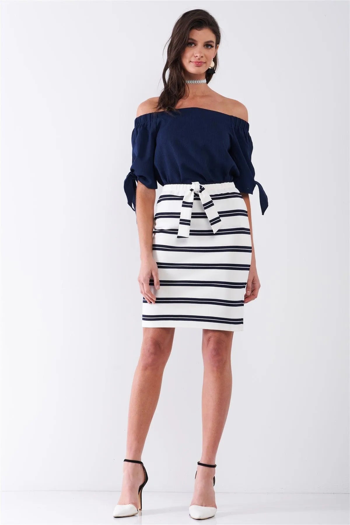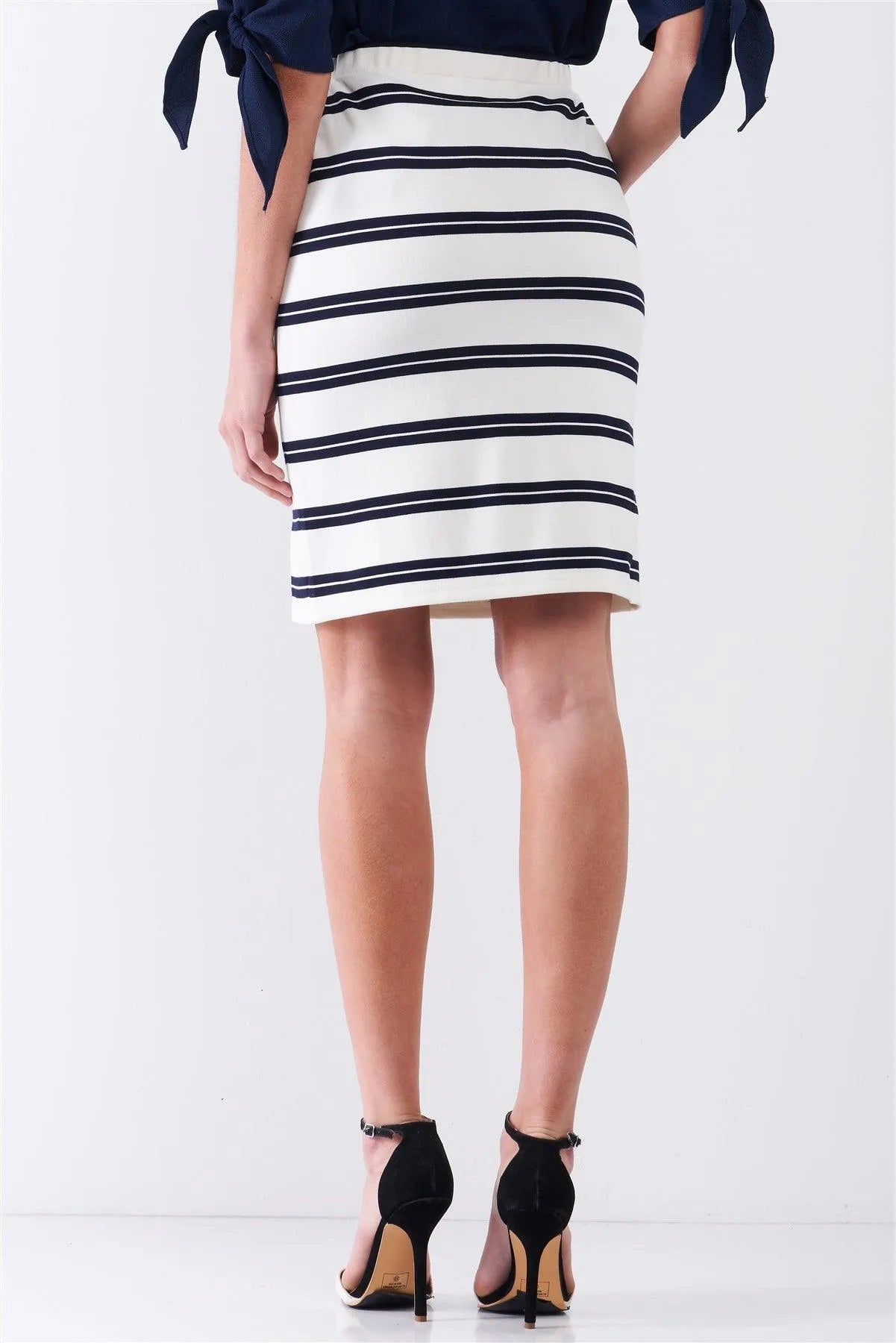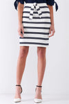 White & Navy Striped Elasticized Self-Tie High-Waist Pencil Skirt /1-2-2-1