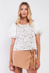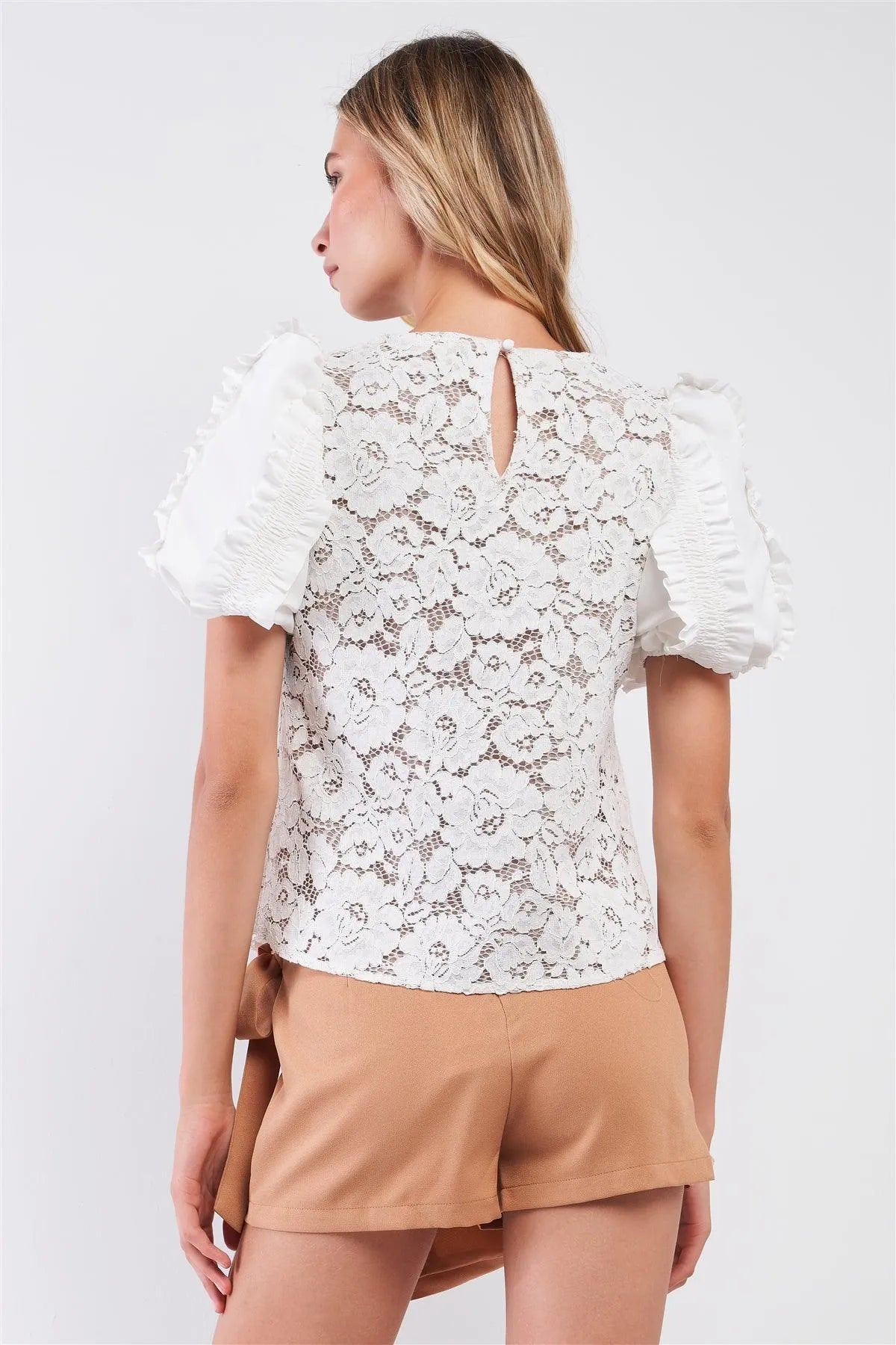 White & Nude Floral Crochet Ruffle Trim Puff Sleeve Top /2-2-2