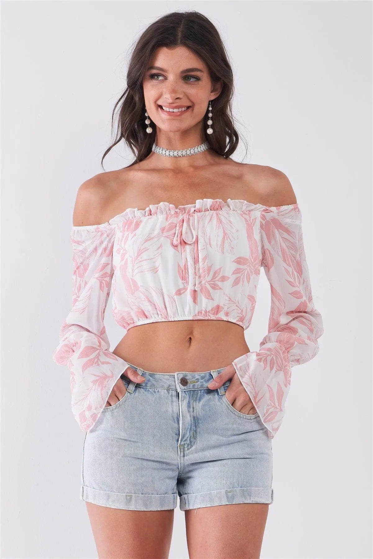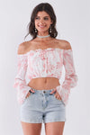 White & Pink Leaf Print Off-The-Shoulder Long Flounce Sleeve Self-Tie Front Cropped Top