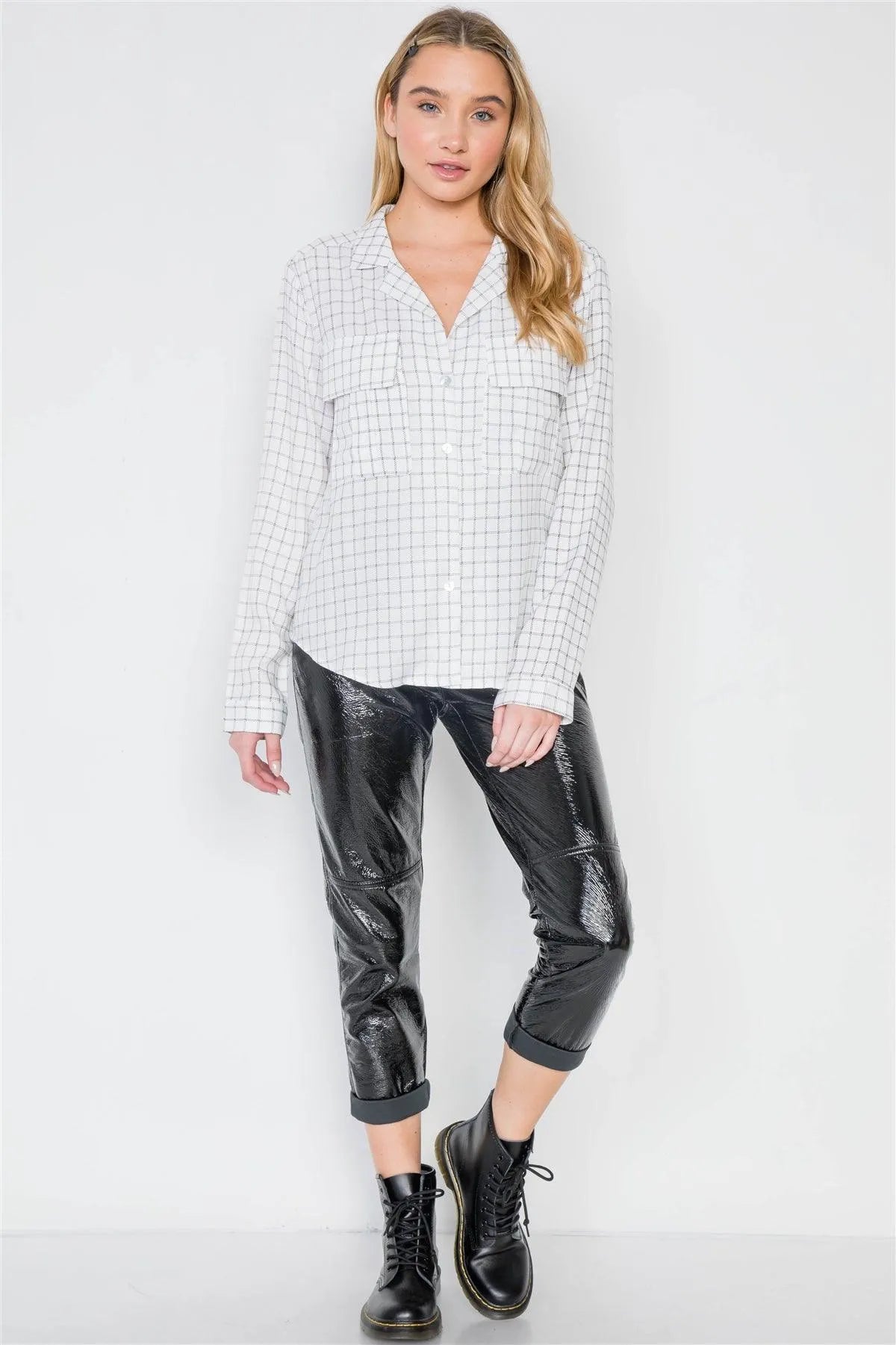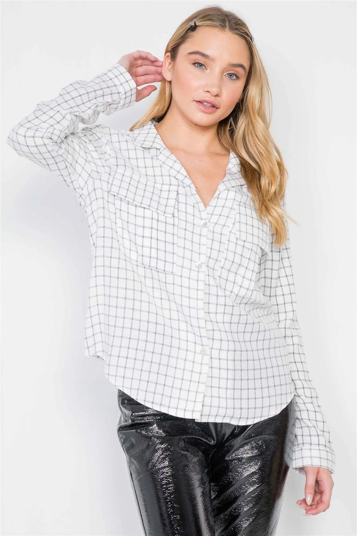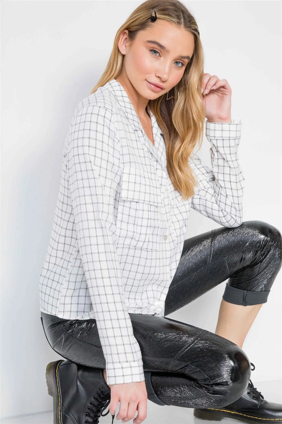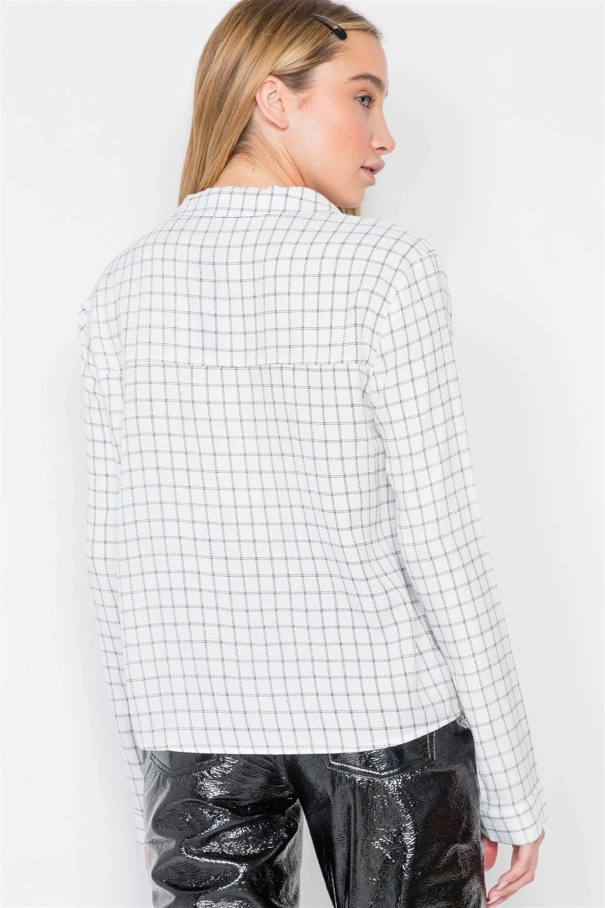 White Plaid Button Down Long Sleeve Top /2-2-2