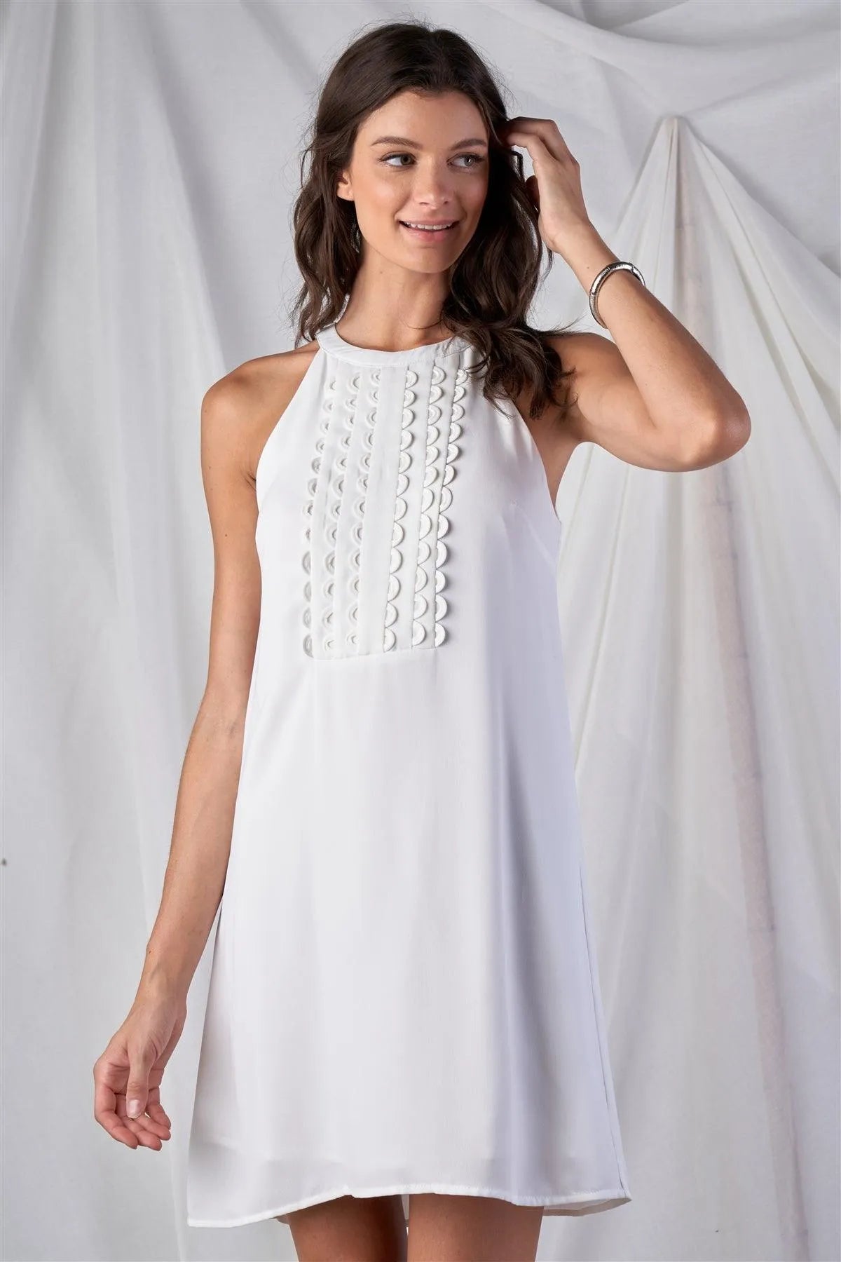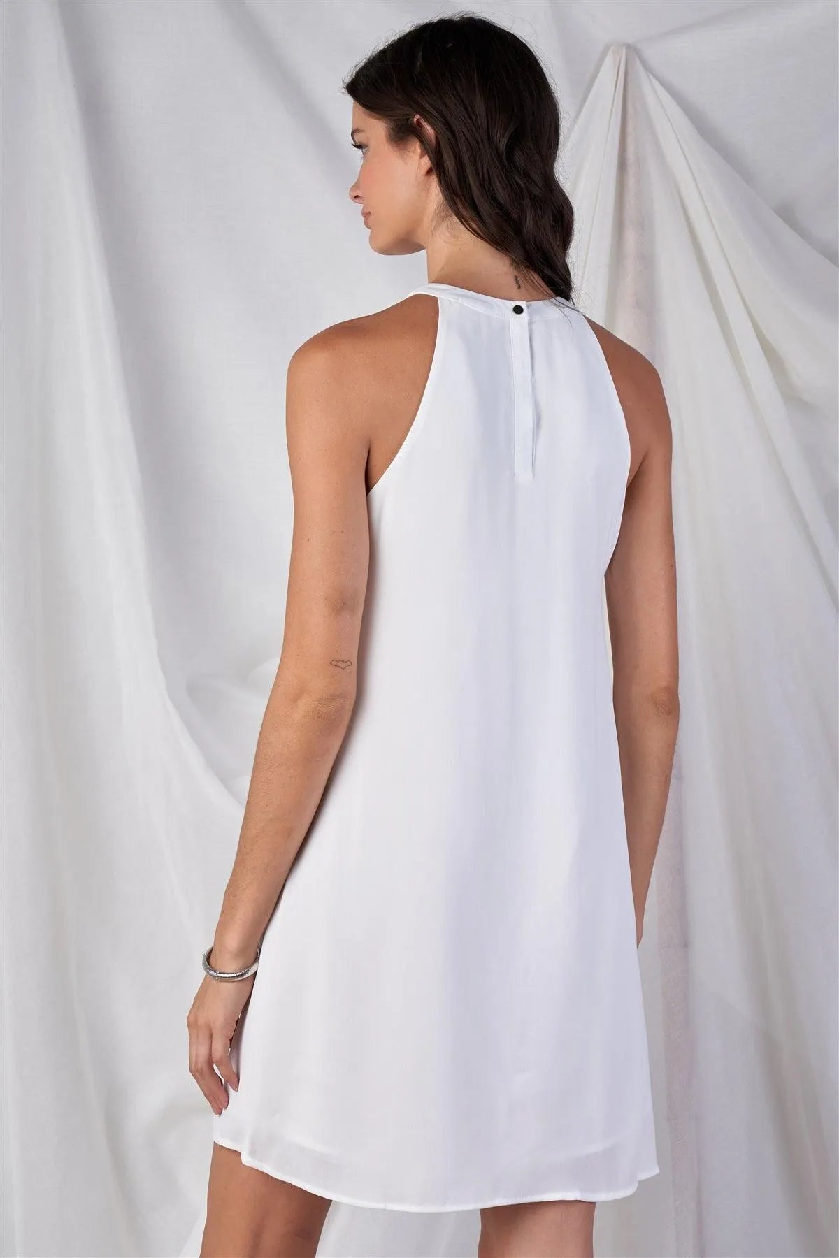 Solid White Pleated Front Mock Tuxedo Trim Loose Fit Sleeveless Round Neck Mini Dress
