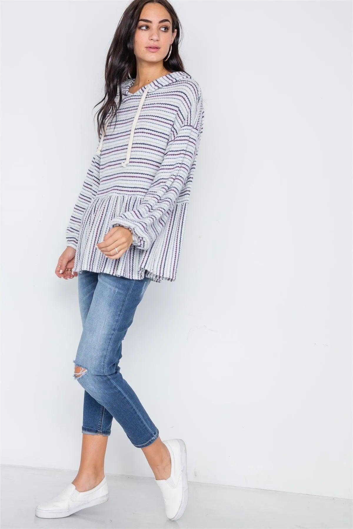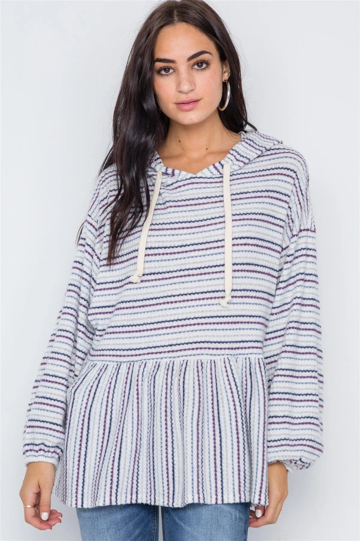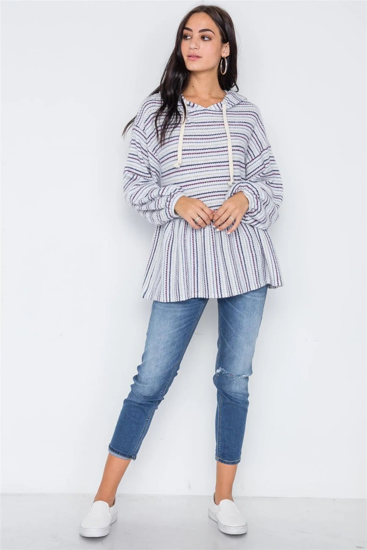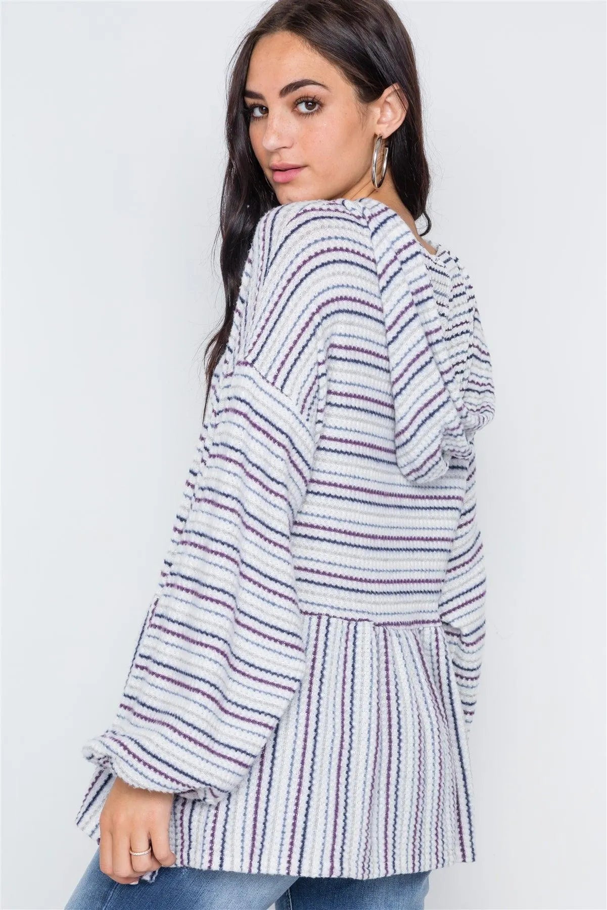 White Purple Stripe Long Sleeve Hooded Soft Sweater /2-2-2