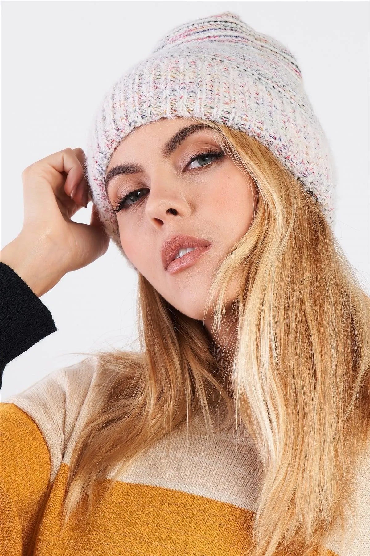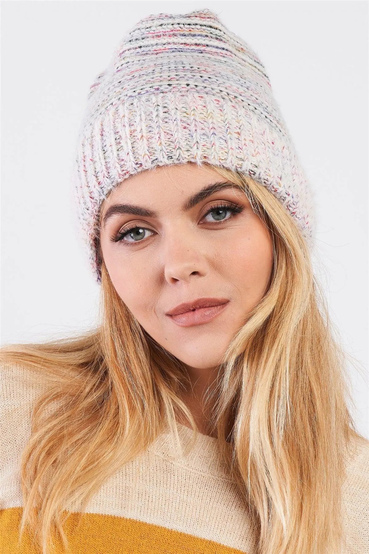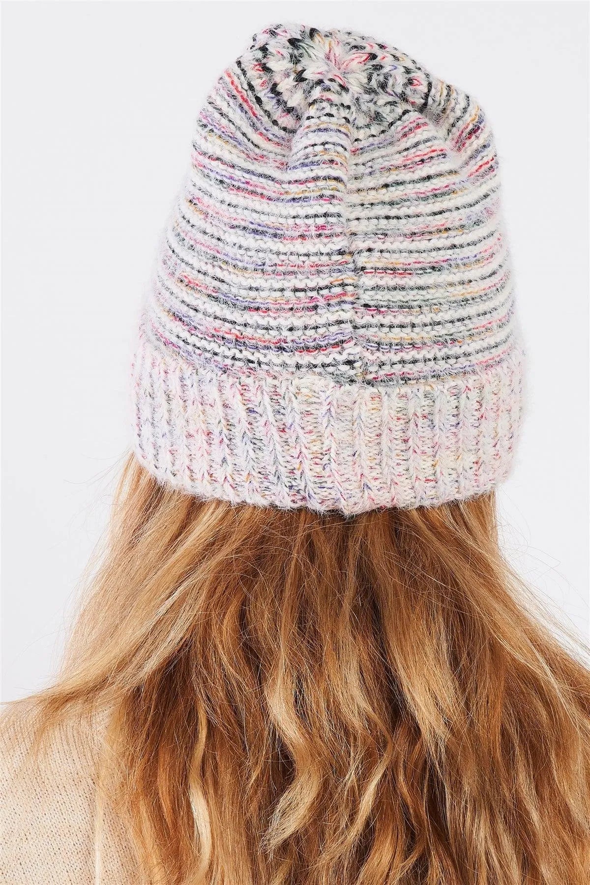 White Rainbow Knit Fuzzy Woven Beanie /3 Pieces