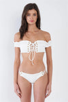 White Retro Off-The-Shoulder Lace Up Two Piece Bikini Set /2-3-1