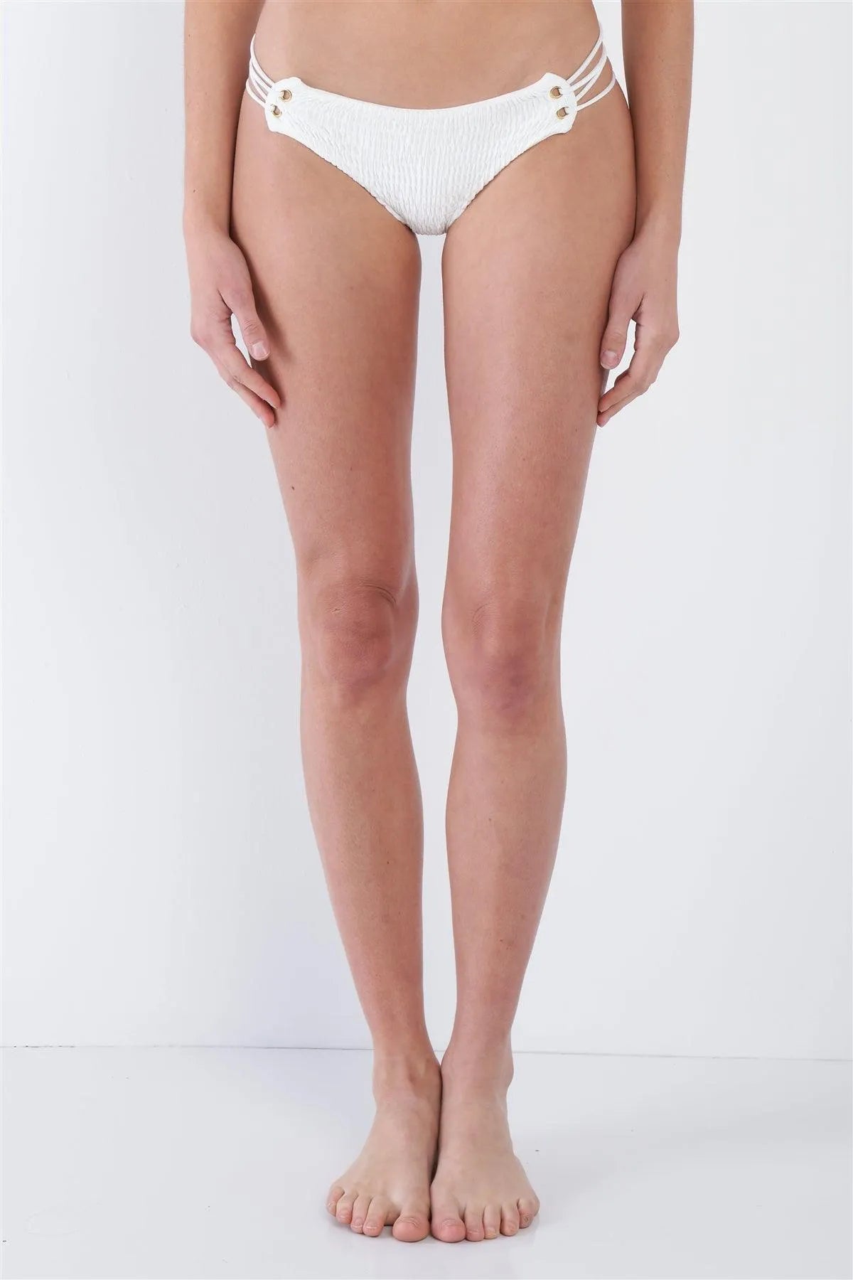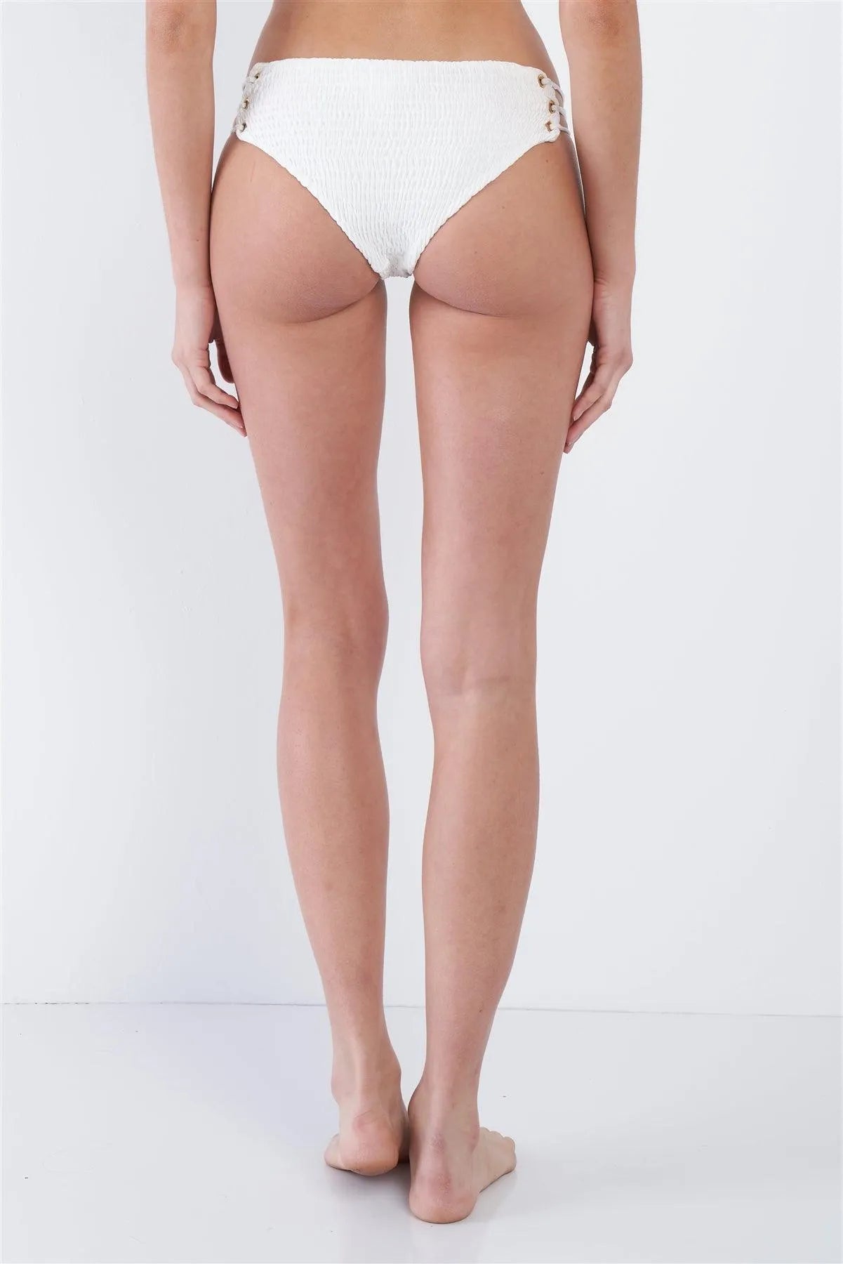 Top Features: off-the-shoulder, gold eyelet, lace up front, self tie string, frill trim, ruffle bodice, elastic, swim wear, chic, vintage, unlined, super stretchy.Top Measurements: Length: 5.5", Bust: 27"Model is 5'9 wearing a size Small ( Waist: 23.5", Bust: 32B, Hips: 36")Bottom Features: elastic lace up side, gold eyelet hardware, ruched, mid rise, mini, bikini, swim wear, solid, vintage, chic, unlined, elastic waist, super stretchy. Bottom Measurements: Length: 9", Waist: 22"Item comes pre-packed with hang tagsTrue to size