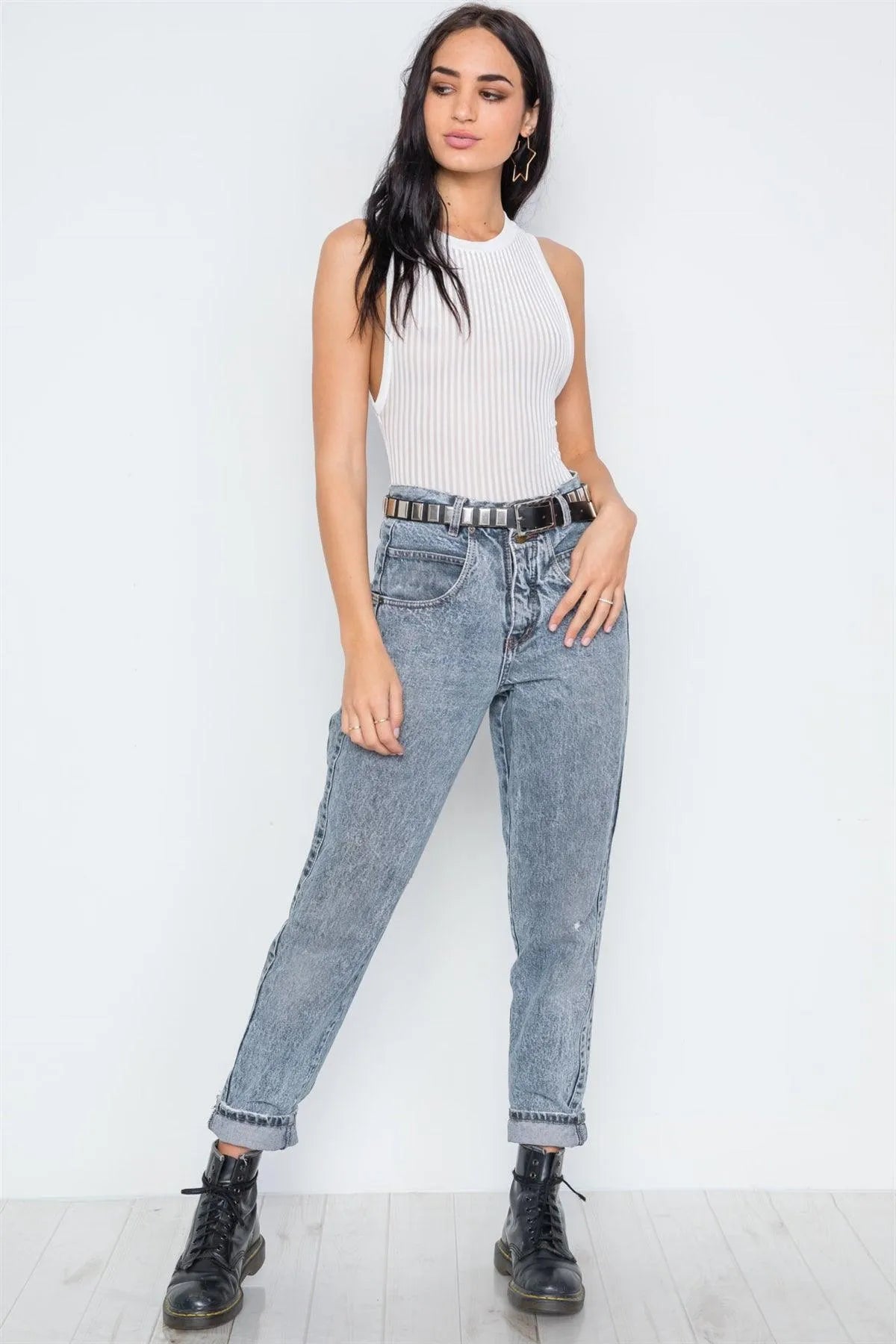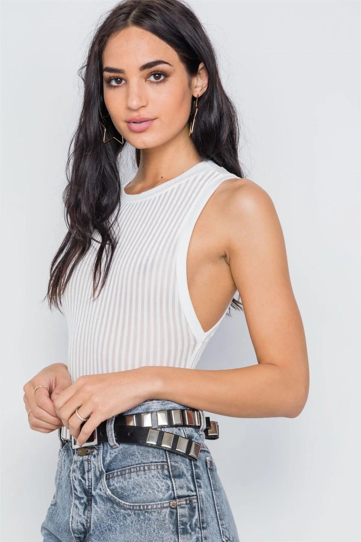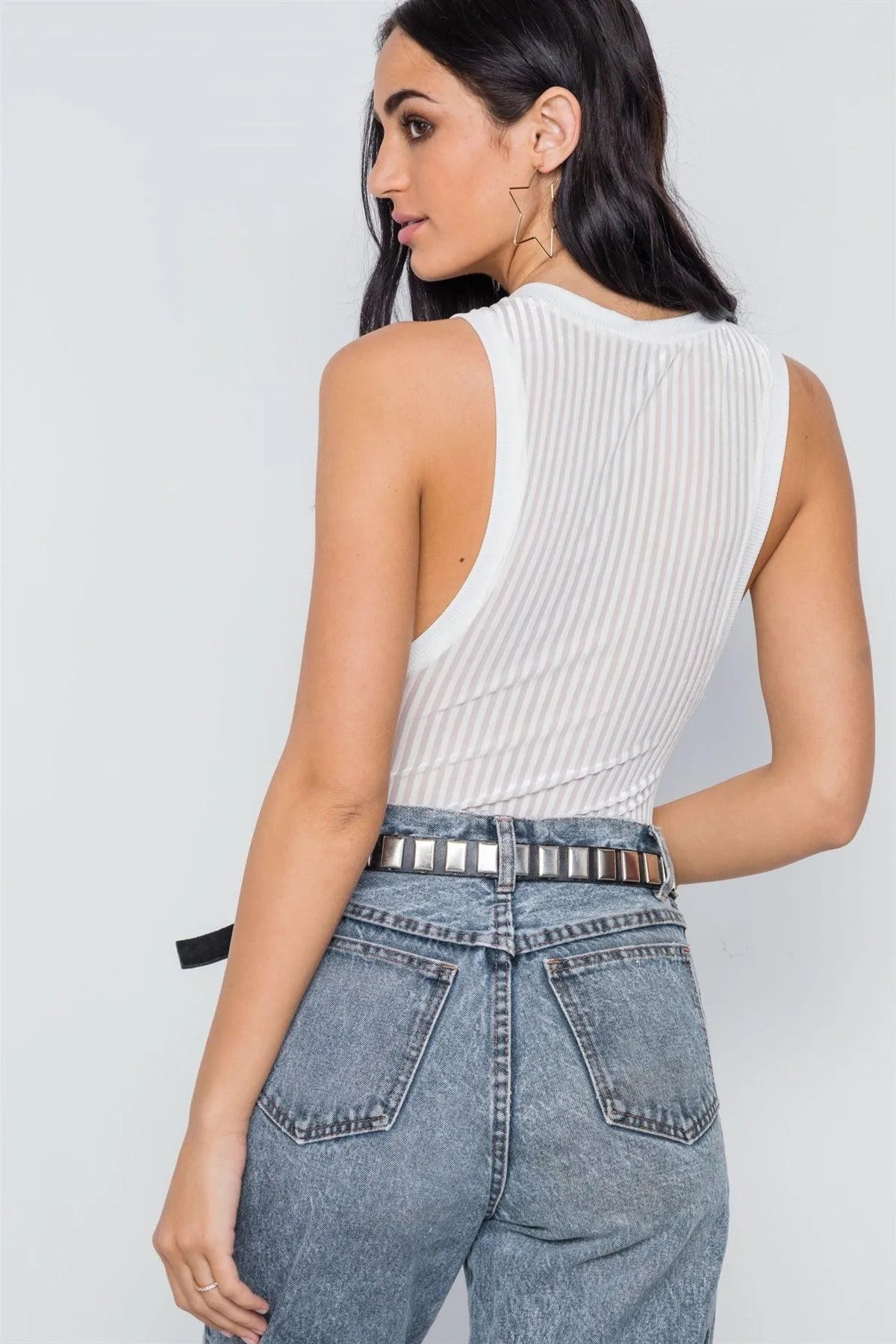 White Ribbed Mash Velvet Sleeveless Sheer Bodysuit /1-2-1