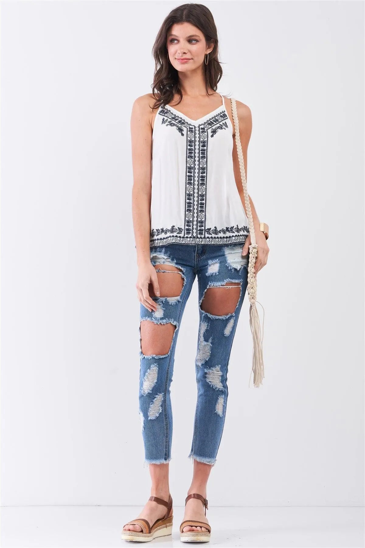White Slavic Inspired Embroidery Detail Sleeveless V-Neck Babydoll Top /1-2-1-1