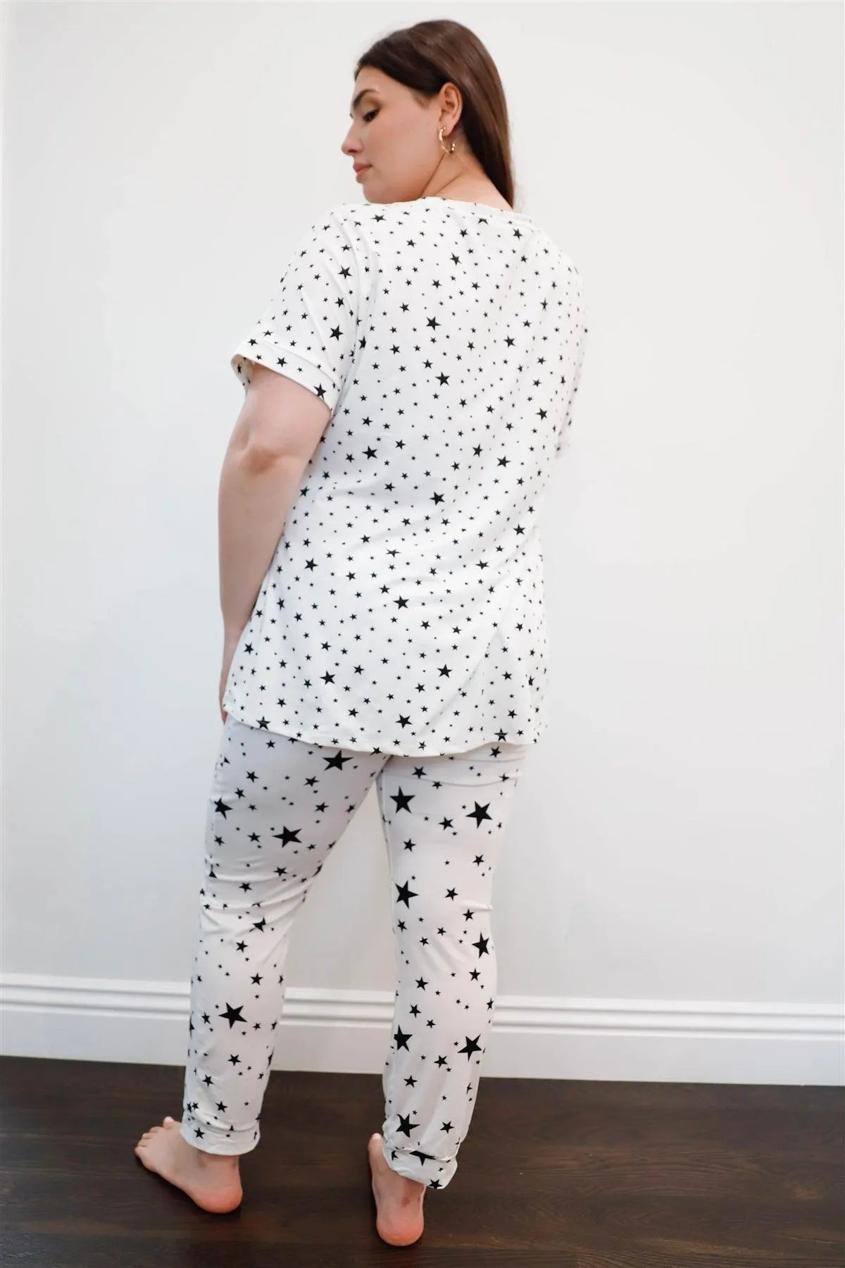 🖤 Item features: White, star print, loose fit t-shirt, crew neckline, cuffed short sleeves, slim fit sweatpants, elasticized waistline with drawstring, cuffed hem, two side pockets, stretchy, unlined, comfy, loungewear, stylish, trendy, must have