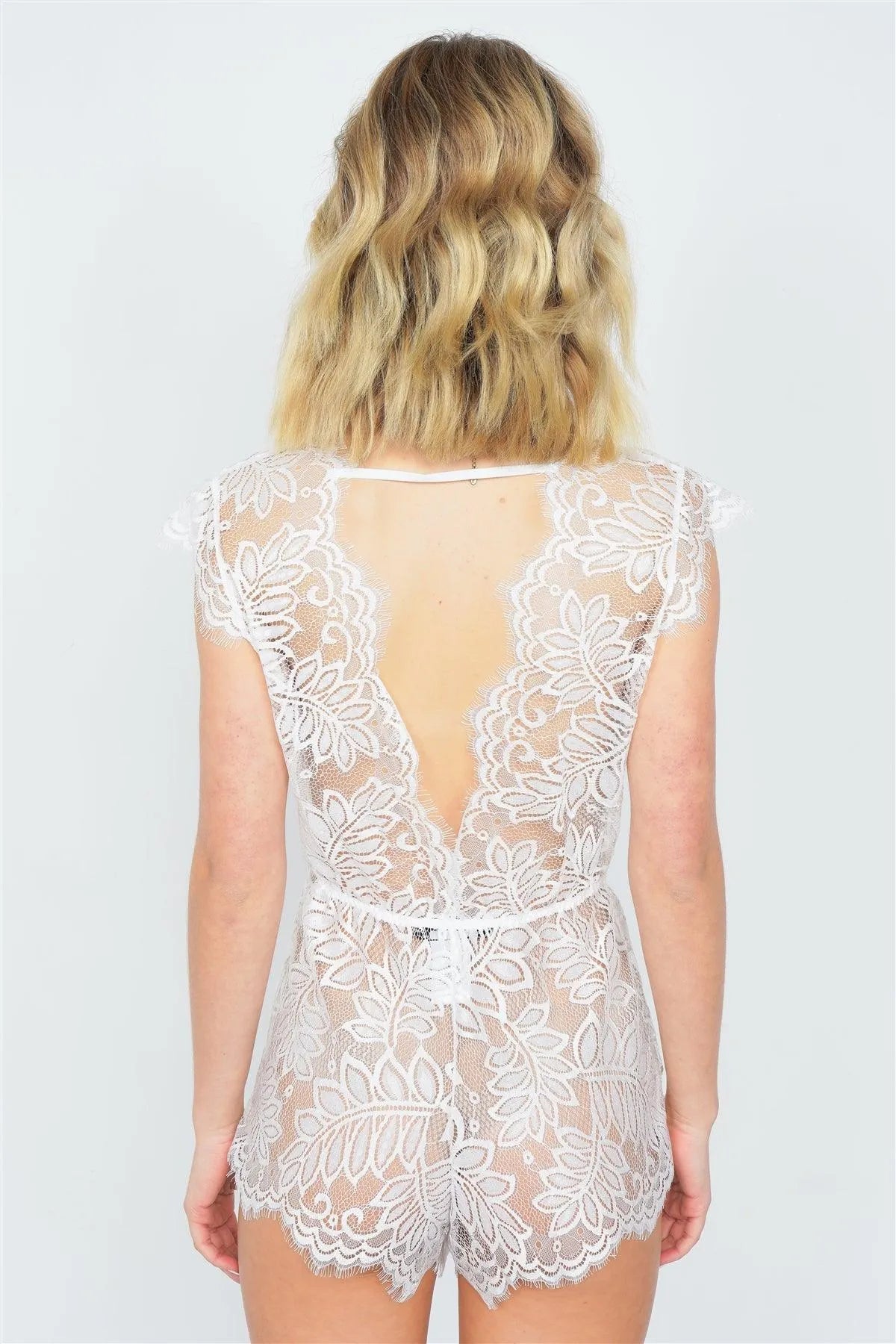 White V-Neck V-Back Floral Lace Sexy Romper Bodysuit