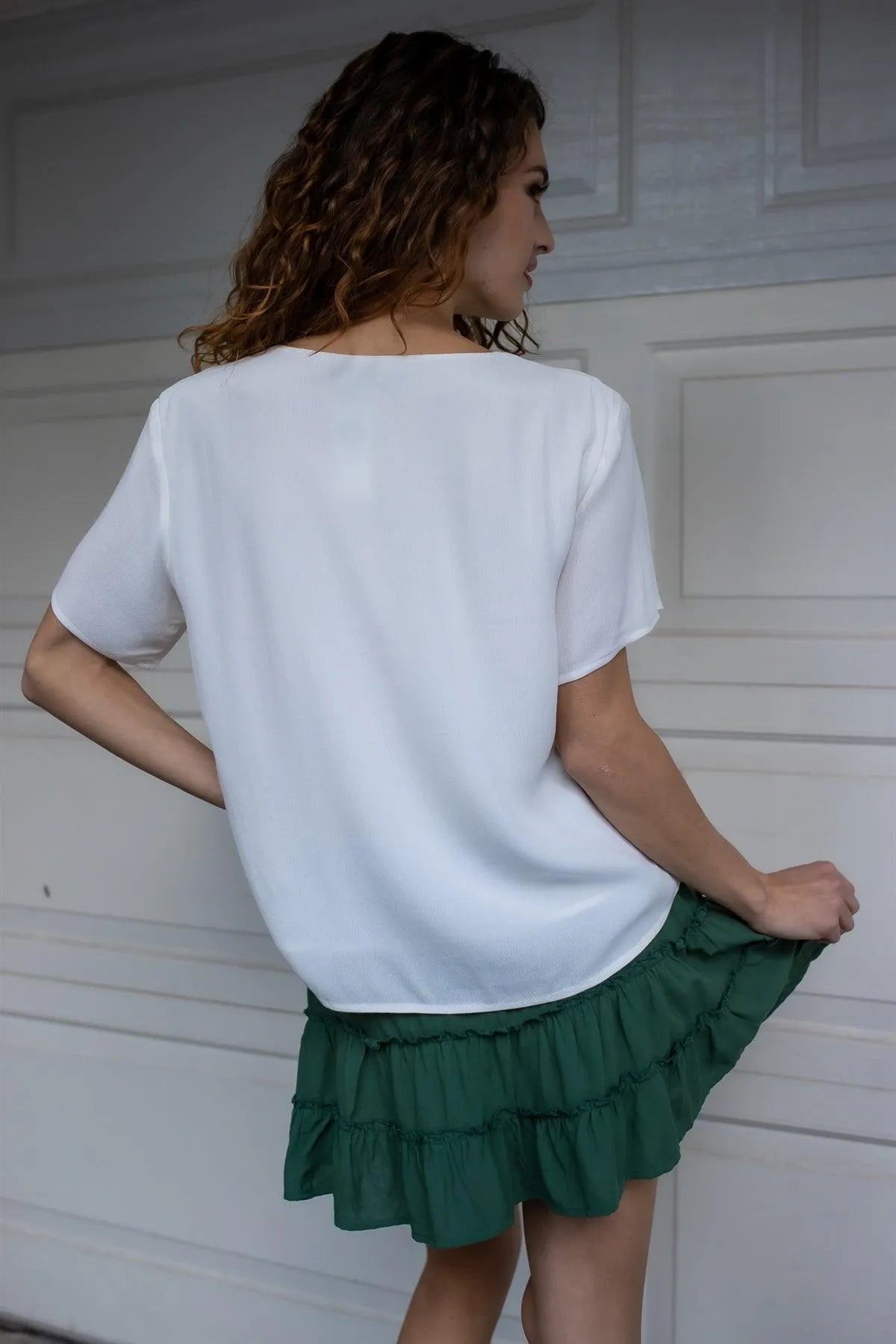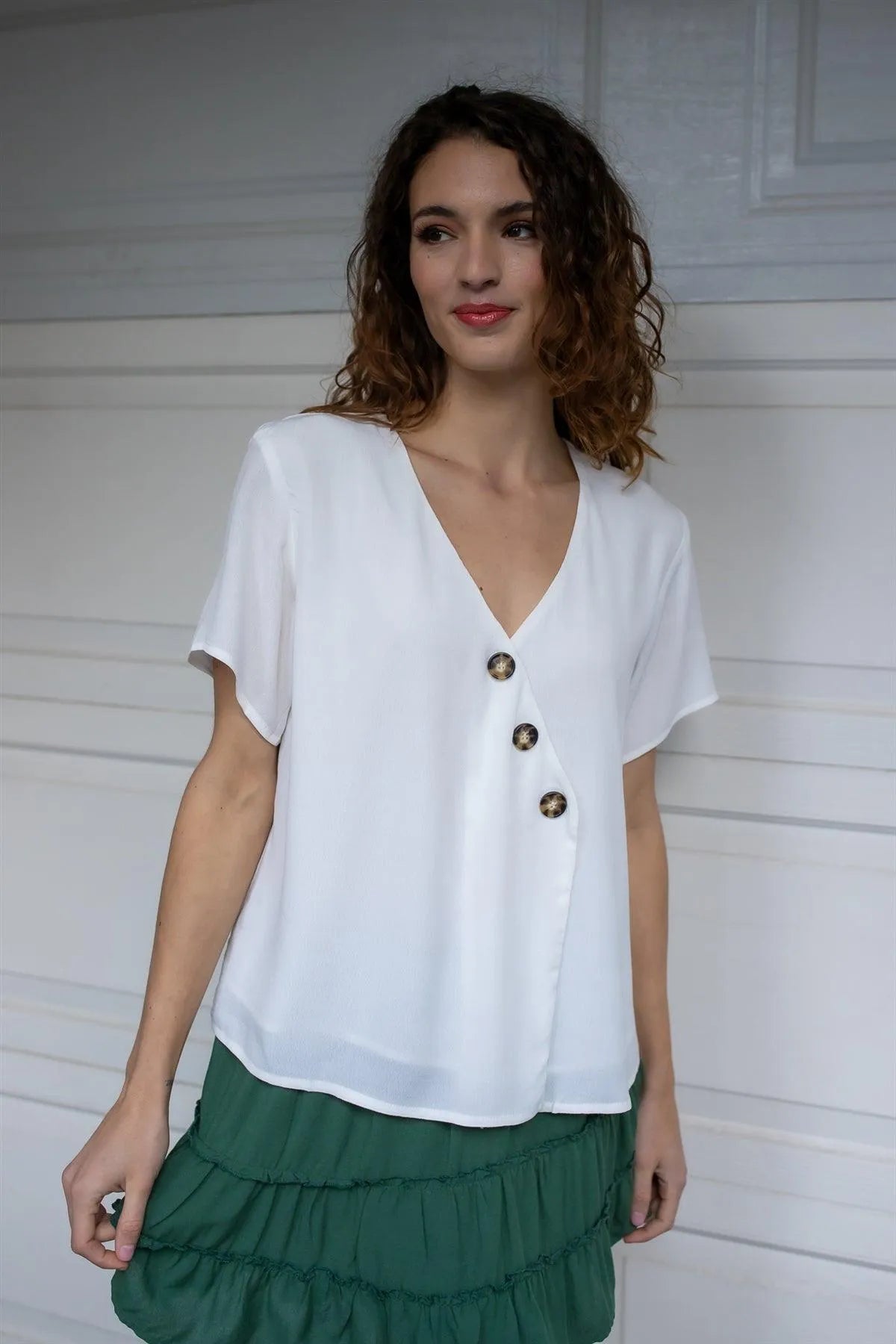 White Viscose Contrast Button Up Detail V-Neck Top /2-2-1
