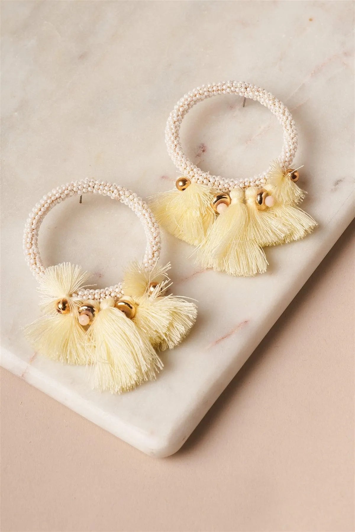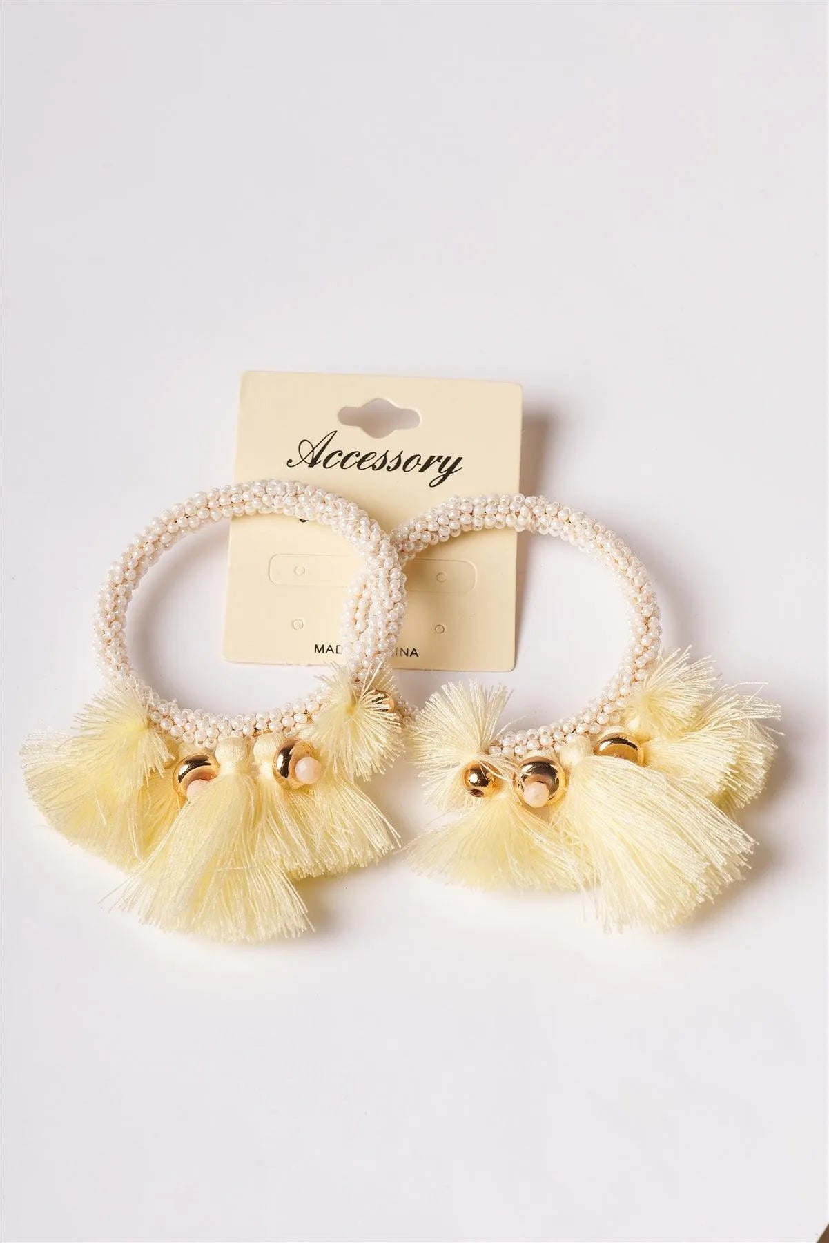 White Yellow Beaded Hoop Tassel Earrings /6 Pairs