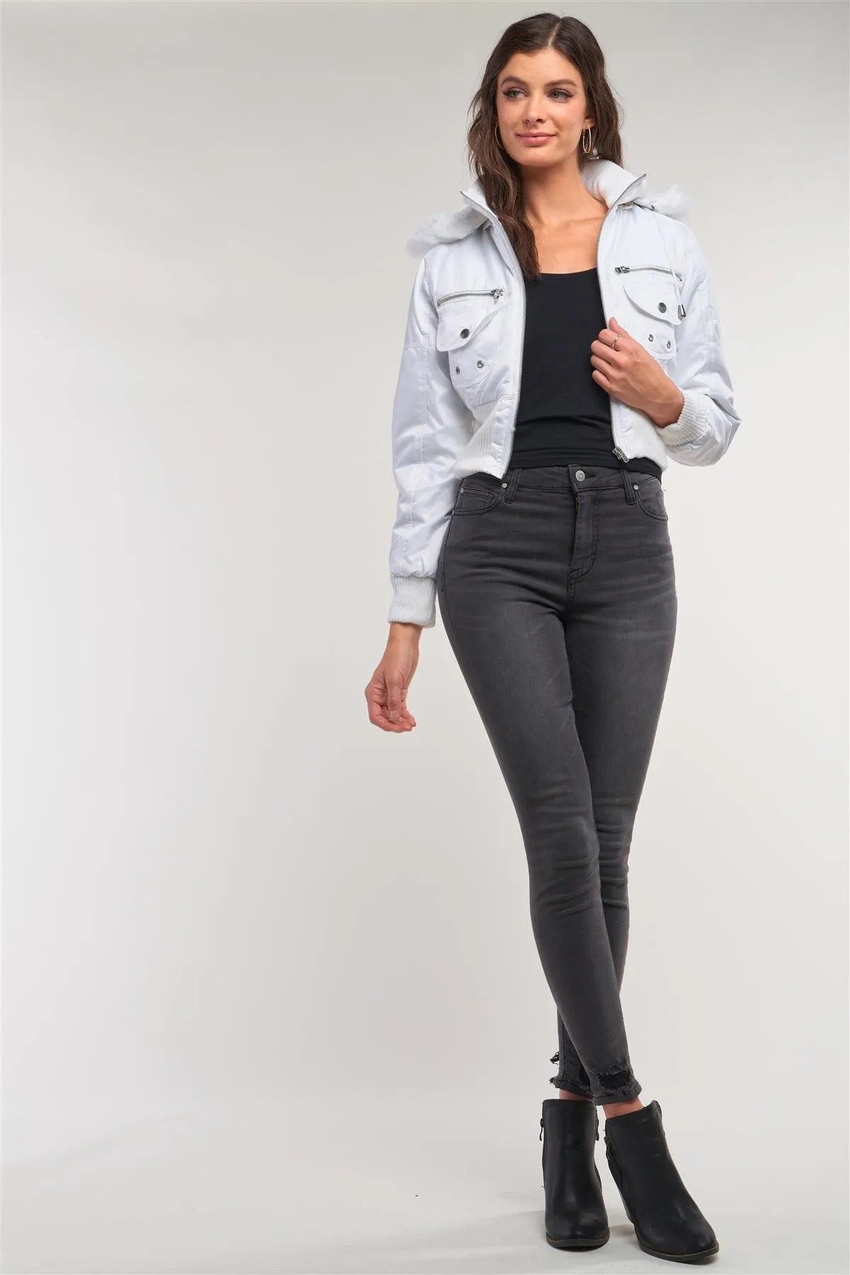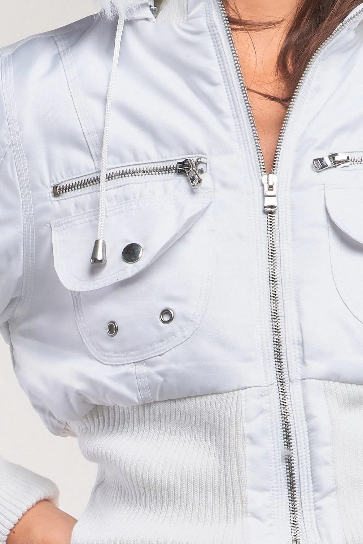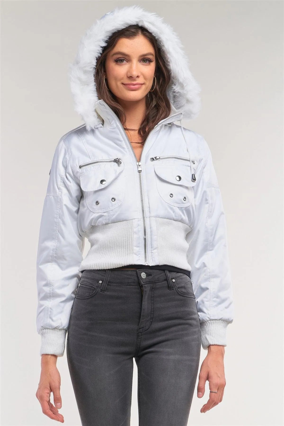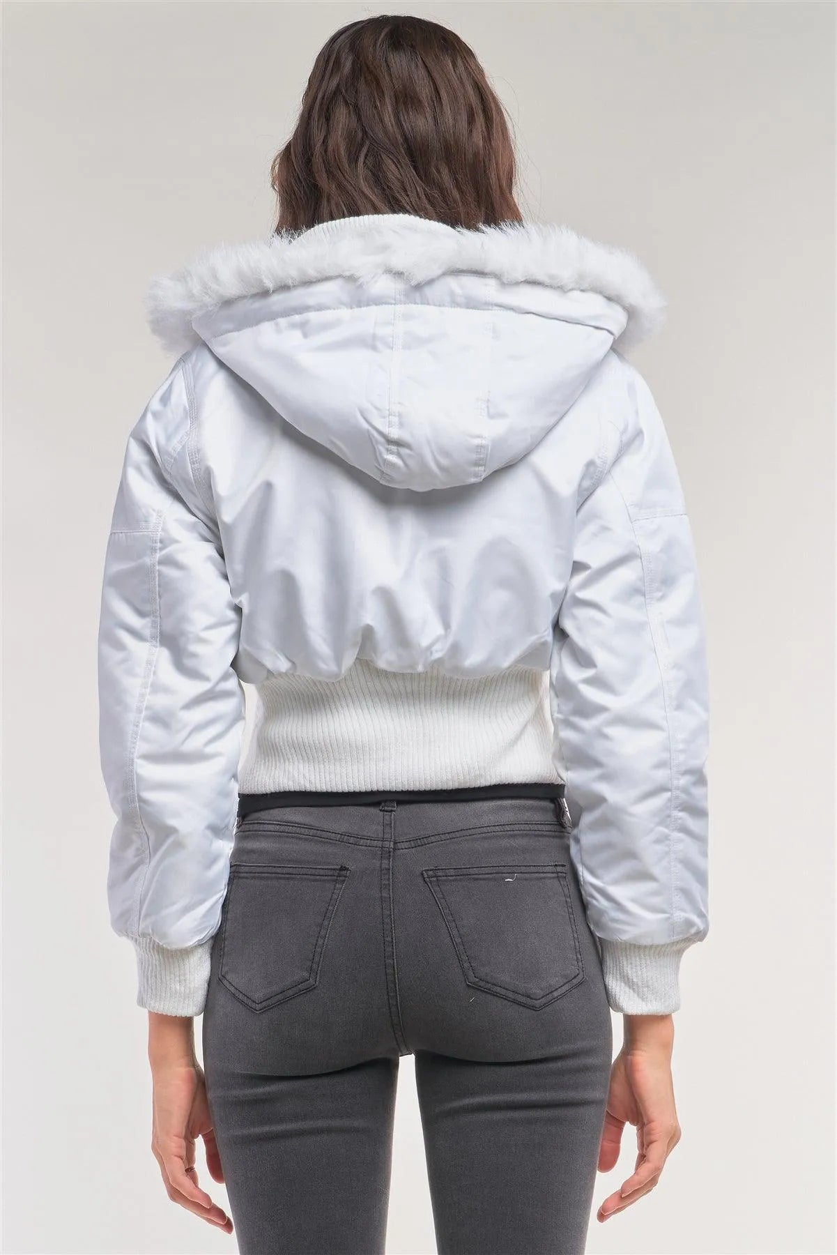 Snow White Zip-Up Faux Fur Hood Detail Cropped Winter Bomber Jacket /1-2-2-1