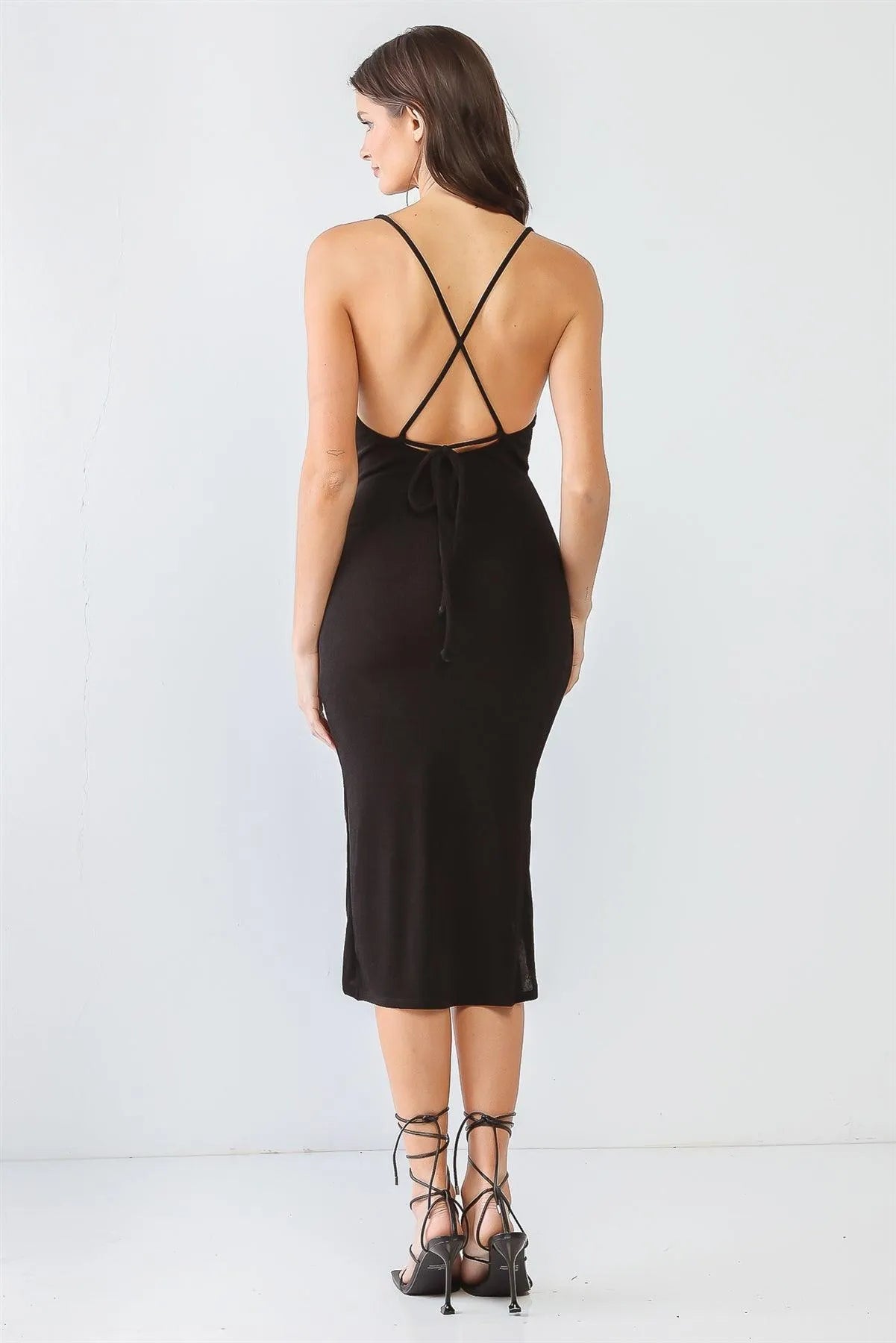 🖤 Item Features: Black, solid color, cowl neckline, strappy, wrap hem, midi length, semi-stretchy, unlined, not see through, cute, girlish, hot, sexy, elegant, must-have