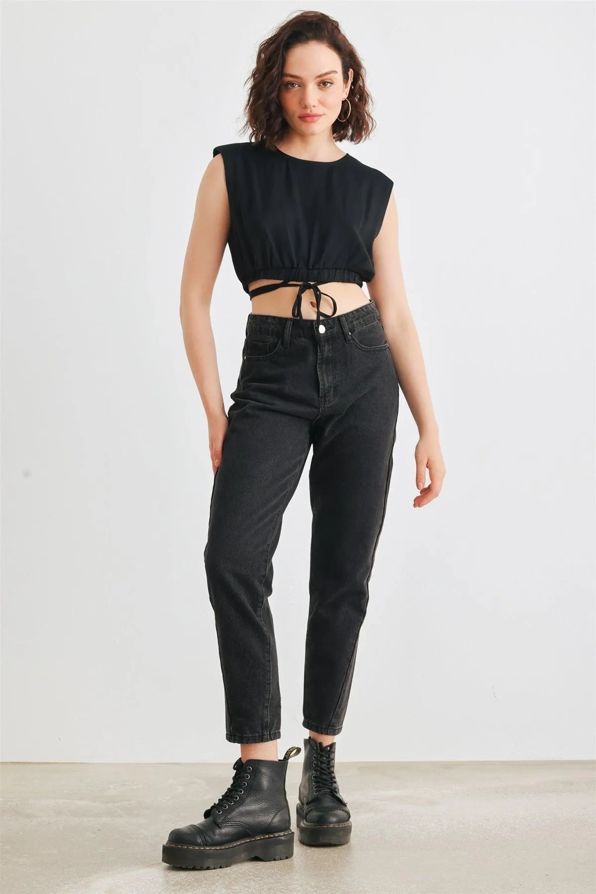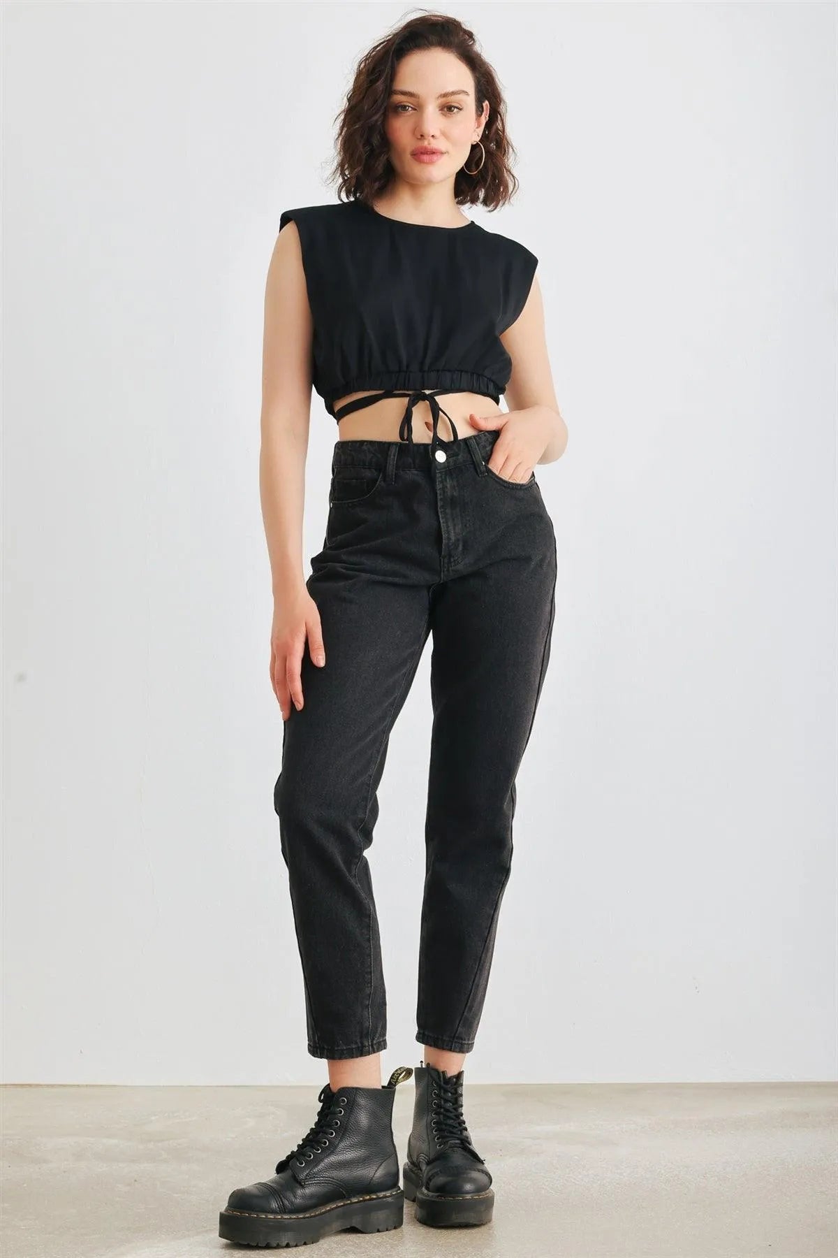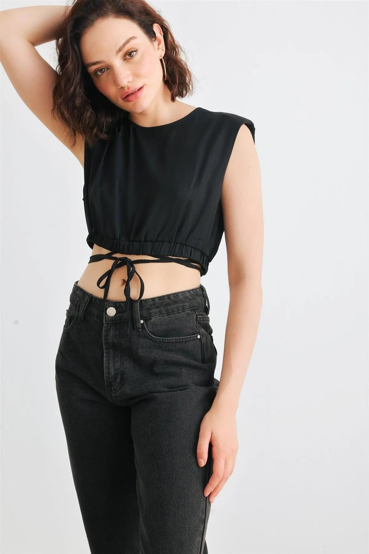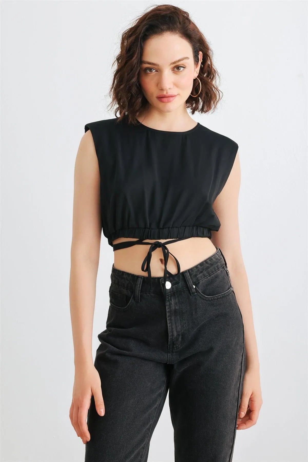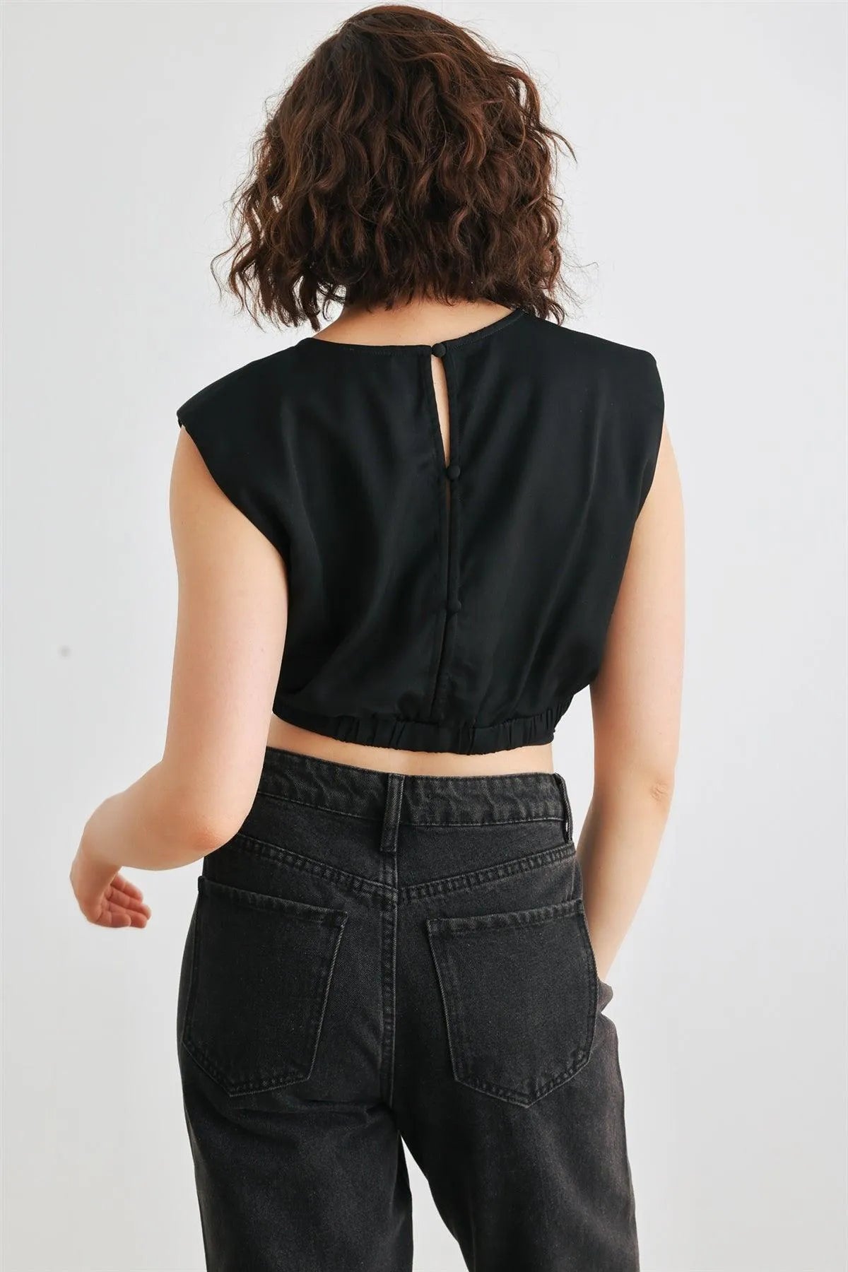 🖤 Item Features: Black, solid color, sleeveless, shoulders pads, crew neckline, back buttons closure, drawstring hem, cropped length, semi-stretchy, not see through, unlined, stylish, cool, must-have, lifestyle