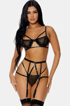 🖤 Item Features: Black, 3pc. Mesh lingerie set features underwire cup bra with flocked heart detail and vinyl contrast paired with matching garter belt and panty, semi-stretchy, unlined, sexy, hot, cool