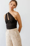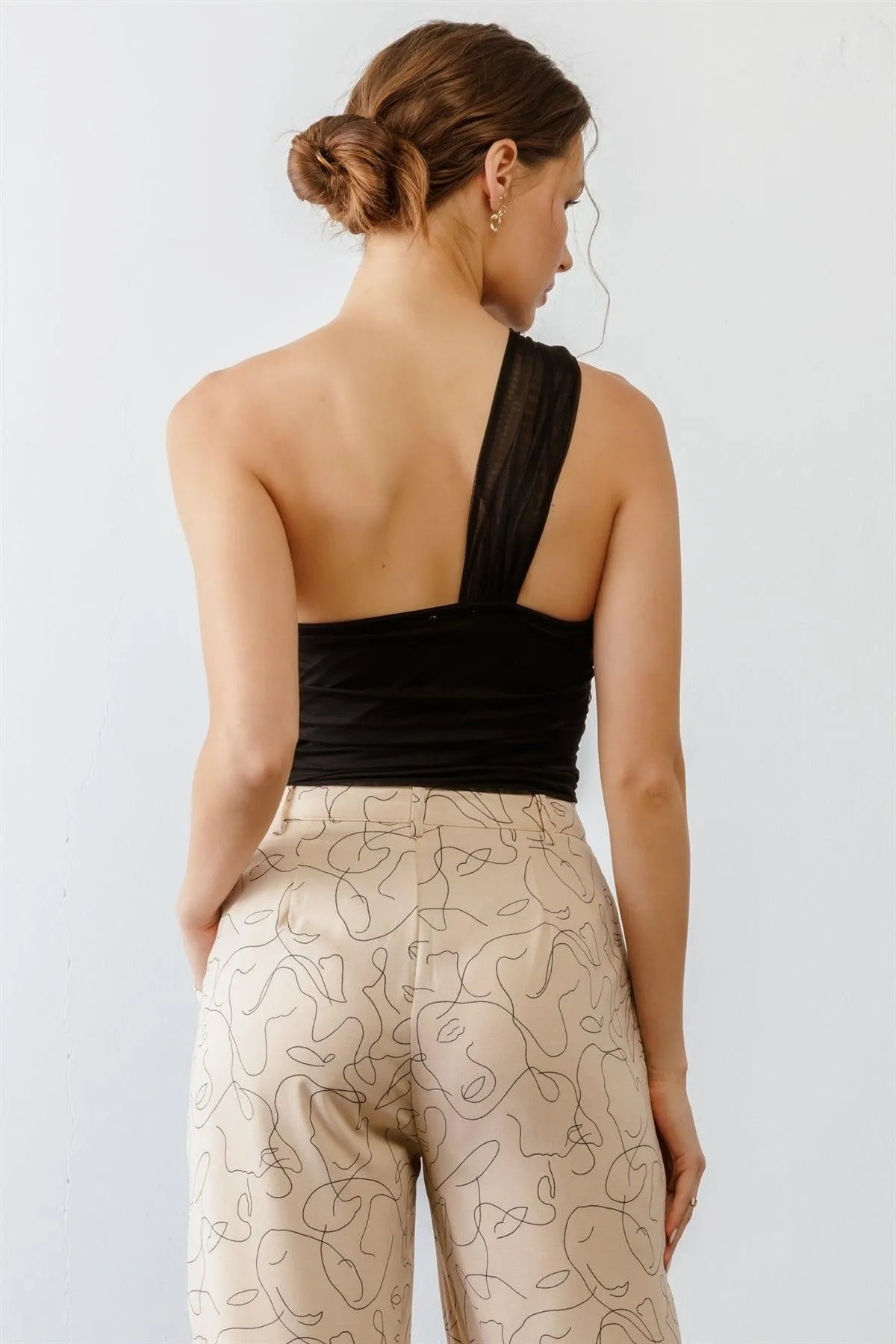 Black Mesh Bustier Ruched One Shoulder Bodysuit /3-2-1
