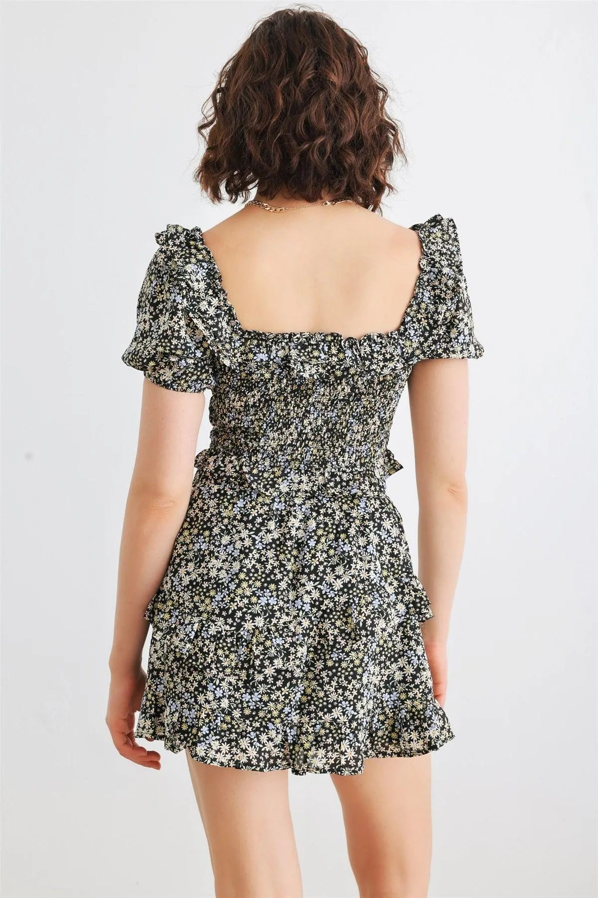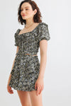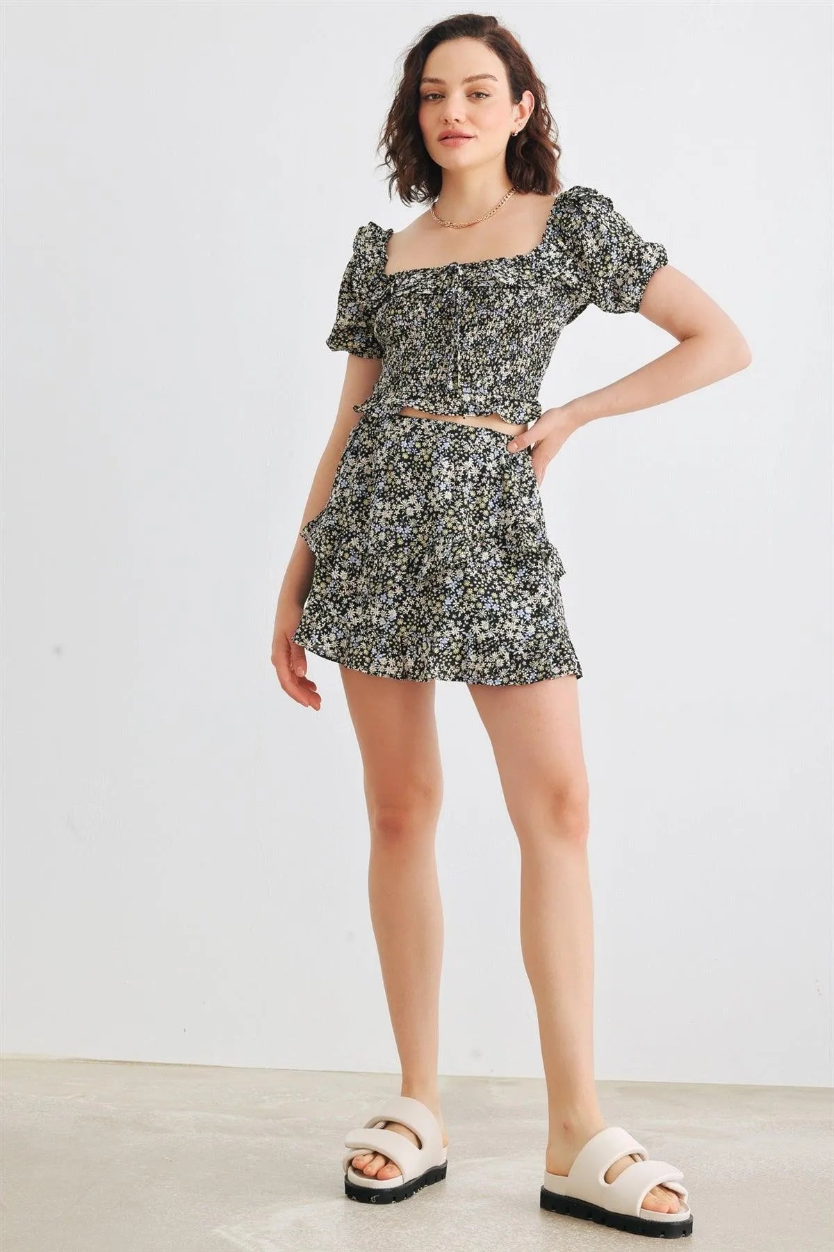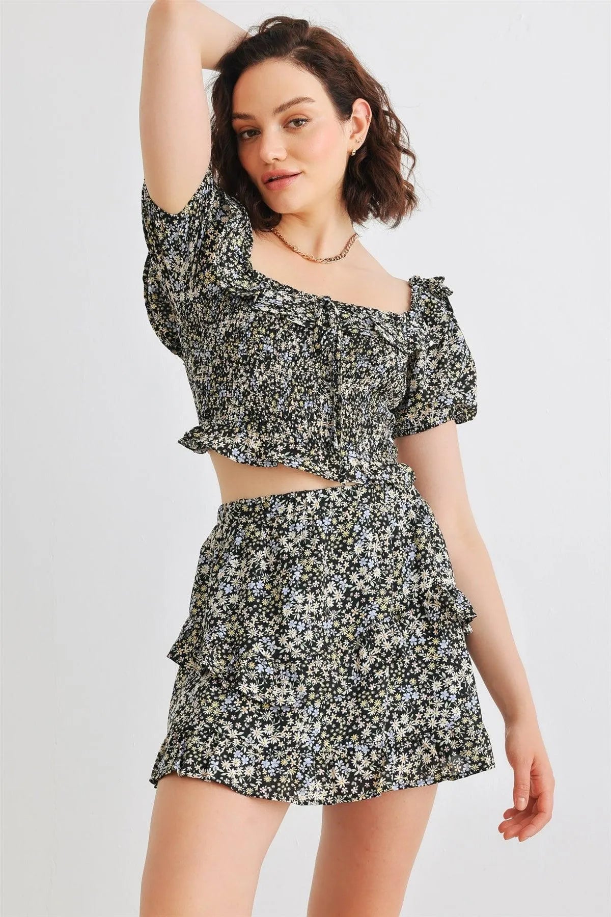 🖤 Item Features: Black, floral print, smocked bodice, front bow, collared neckline, short sleeves, cropped length top, elasticized waistband, high waist, tiered, lined skirt, semi-stretchy, not see through, lined, cute, stylish, trendy, lifestyle, must-have