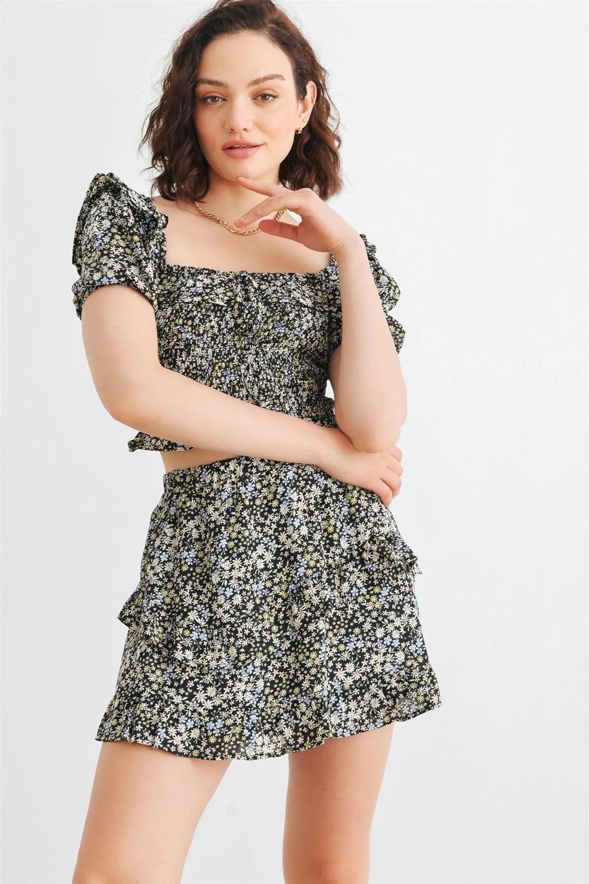 Black Multi Floral Smocked Collared Neck Short Sleeve Crop Top & High Waist Tiered Skirt Set /3-2-1