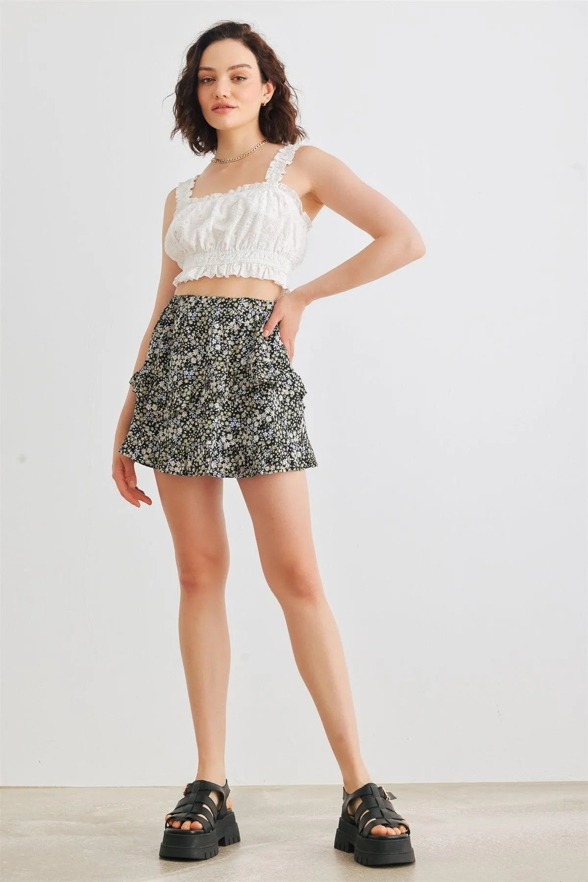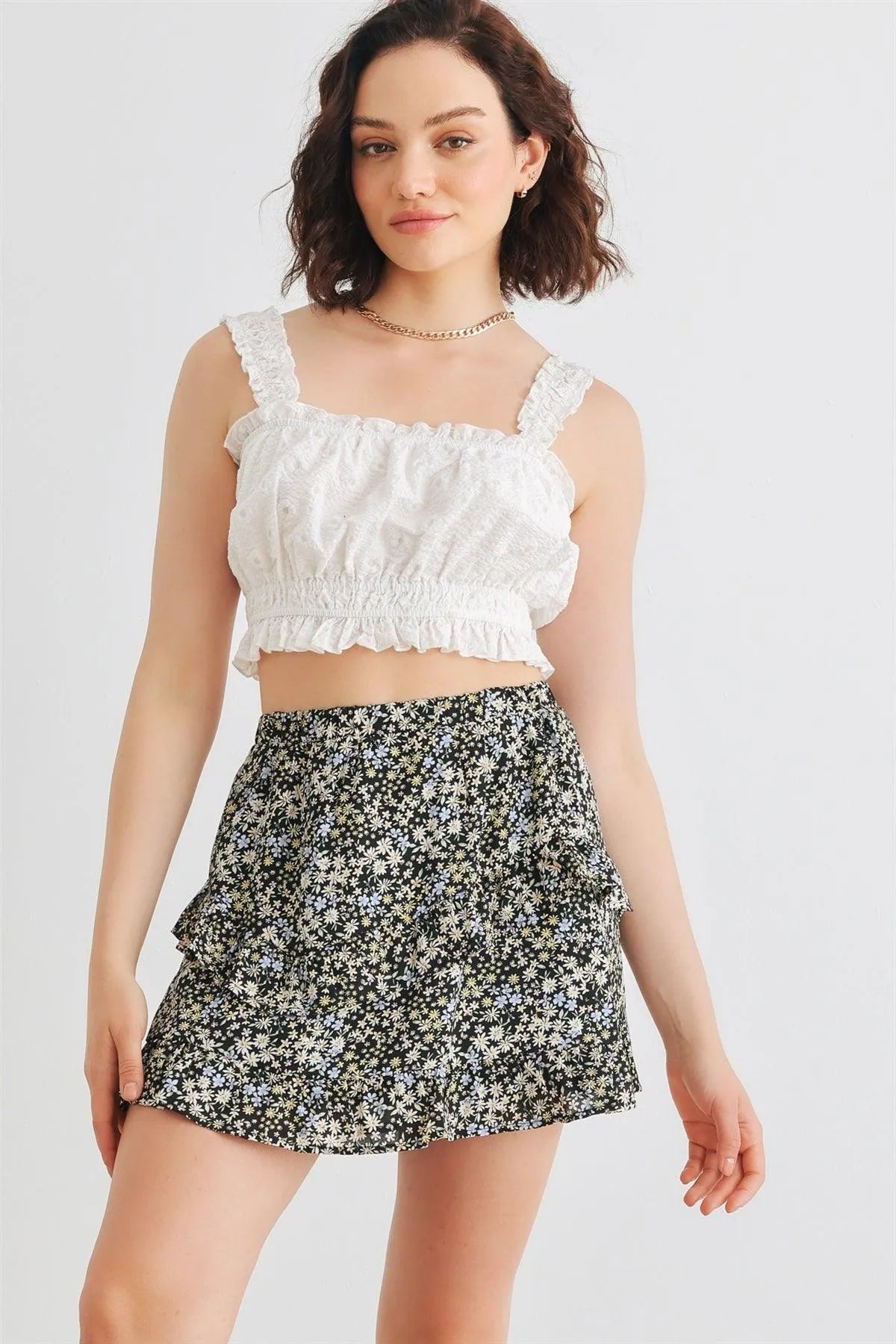 🖤 Item Features: Black, floral print, elasticized waistband, high waist, tiered, lined mini skirt, semi-stretchy, not see through, cute, stylish, trendy, lifestyle, must-have
