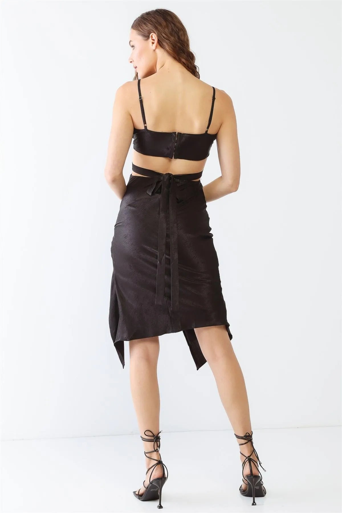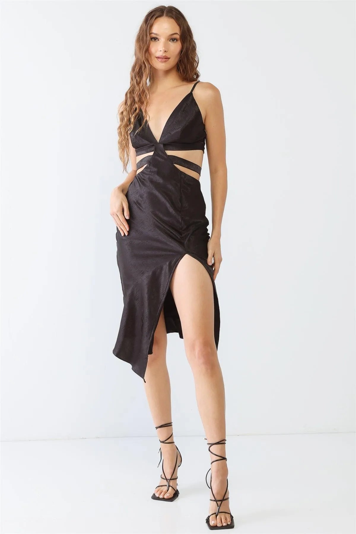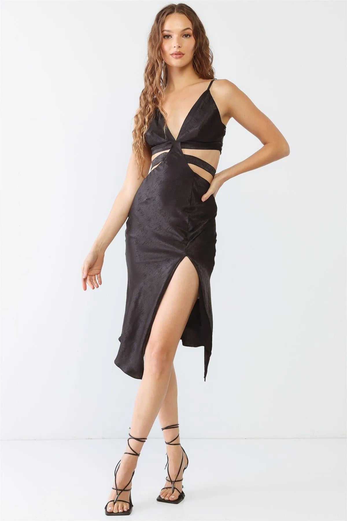 🖤 Item Features: Black, printed, satin effect, v-neckline, adjustable straps, cut-out details, side slit, back eye, self-tie & zip-up closure, midi length, slim fit, non-stretchy, lined, non-sheer, cute, elegant, must-have