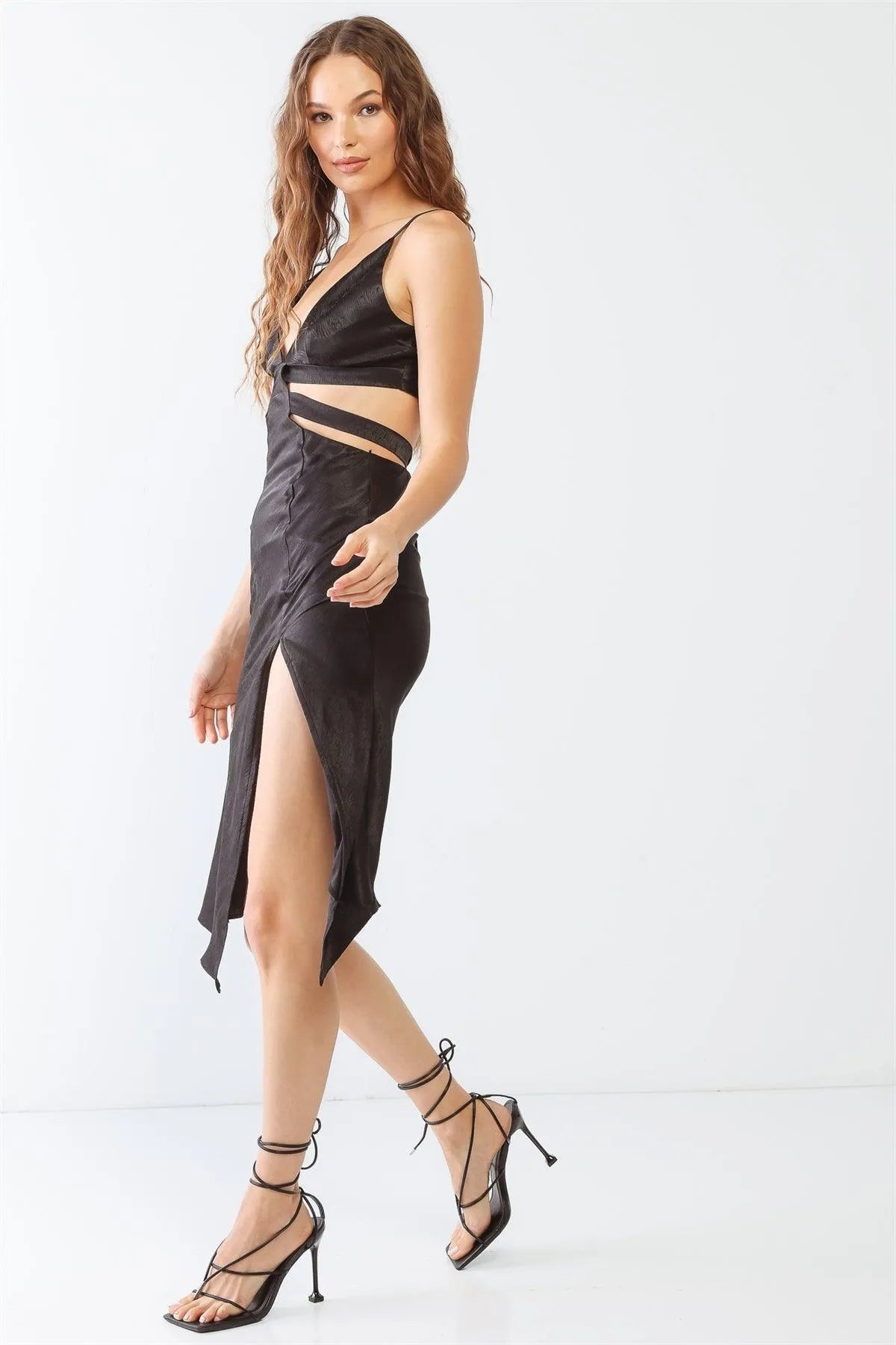 Black Printed Satin Cut-Out Detail V-Neck Self-Tie Side Slit Midi Dress /3-2-1