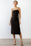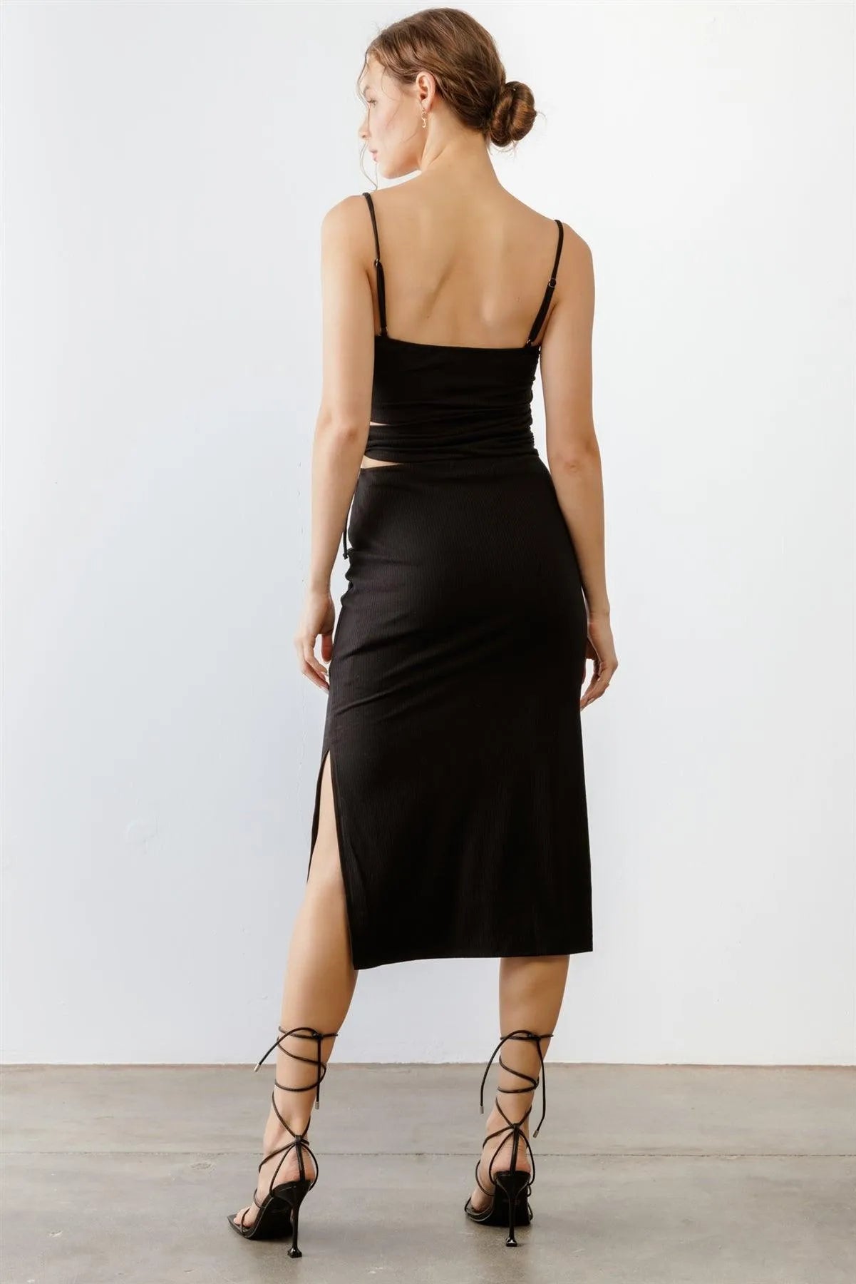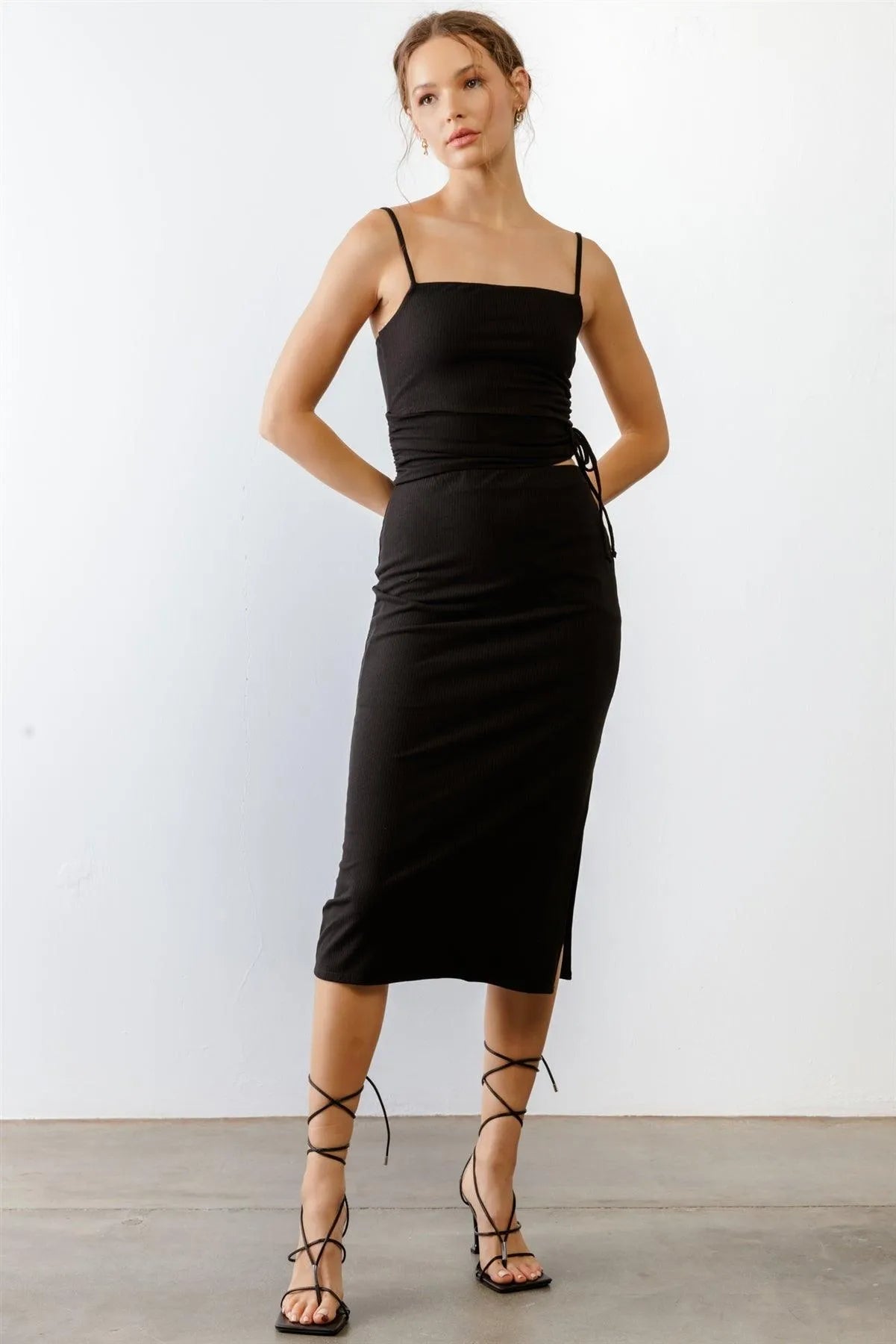 Black Ribbed Cut-Out Drawstring Strappy Midi Dress