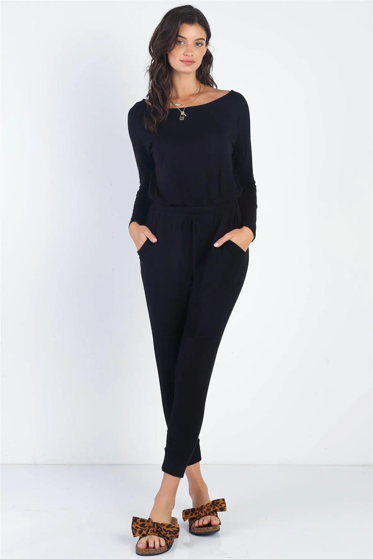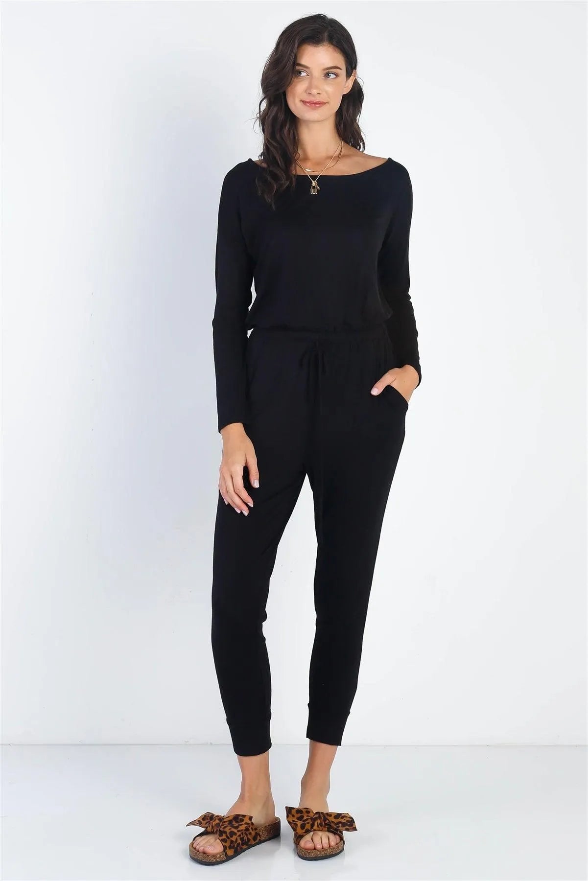 🖤 Item Features: Black, solid color, round neckline, long sleeves, dropped shoulders, elasticized waistband with adjustable drawstring, two side pockets, cuffed hem, unlined, semi-stretchy, non-sheer, casual, cute, trendy, stylish, comfy