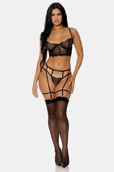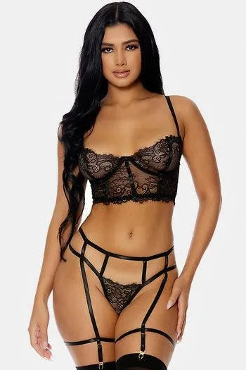 Black Scalloped Lace Bustier & Strappy Panty Set Lingerie