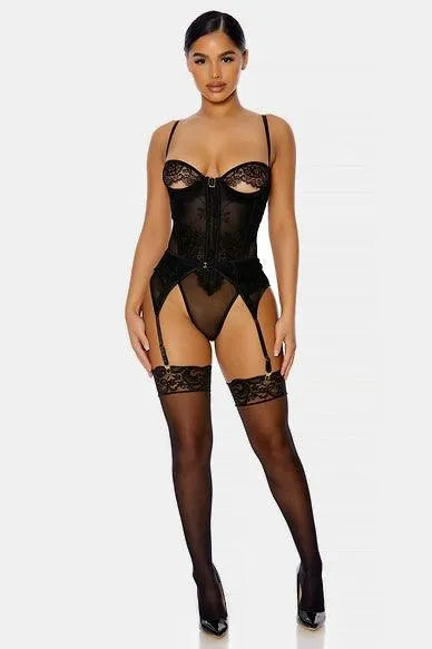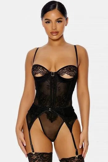 Black Scalloped Lace Teddy Mesh Peel-A-Boo Cut-Out & Garter Belt Lingerie