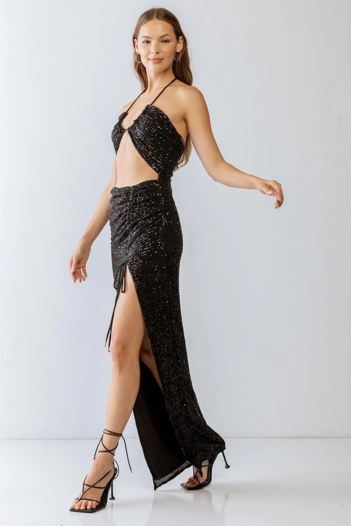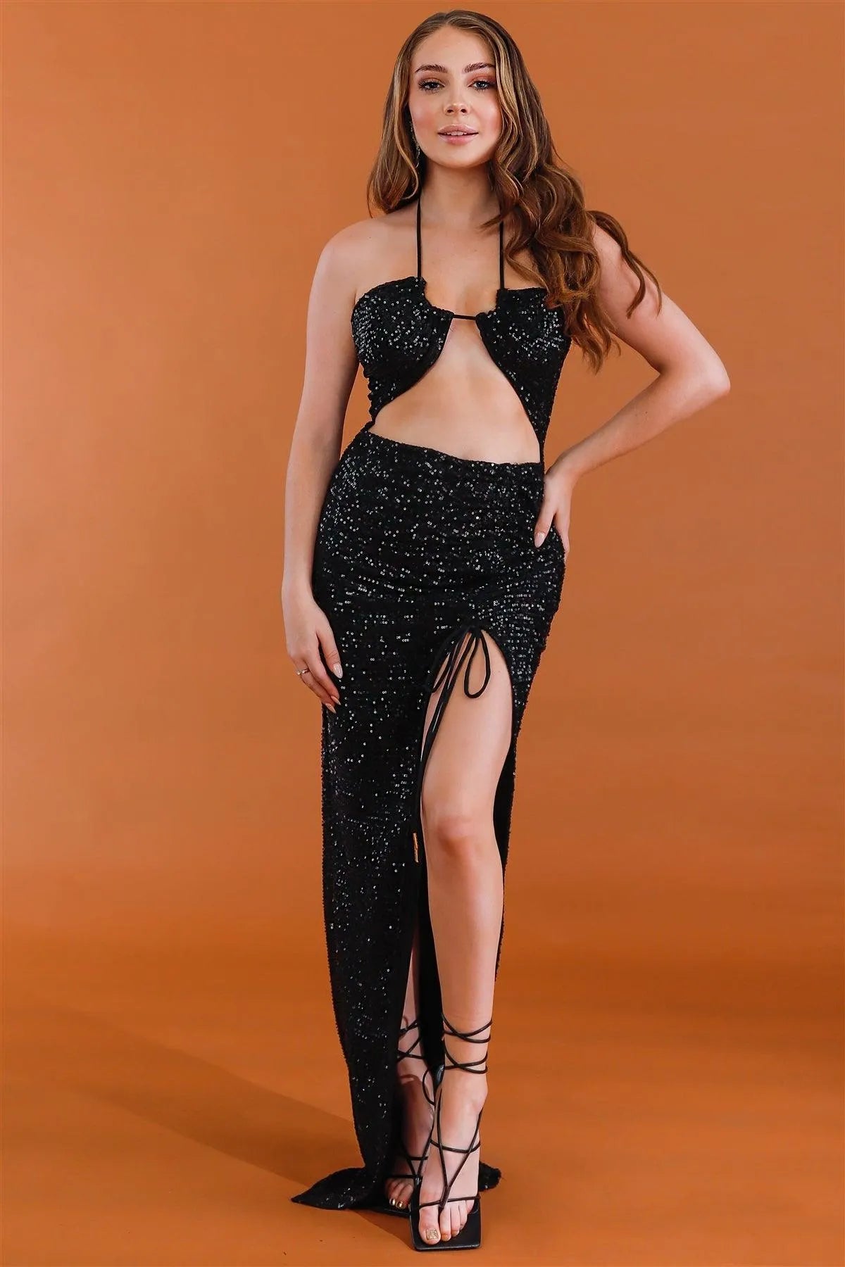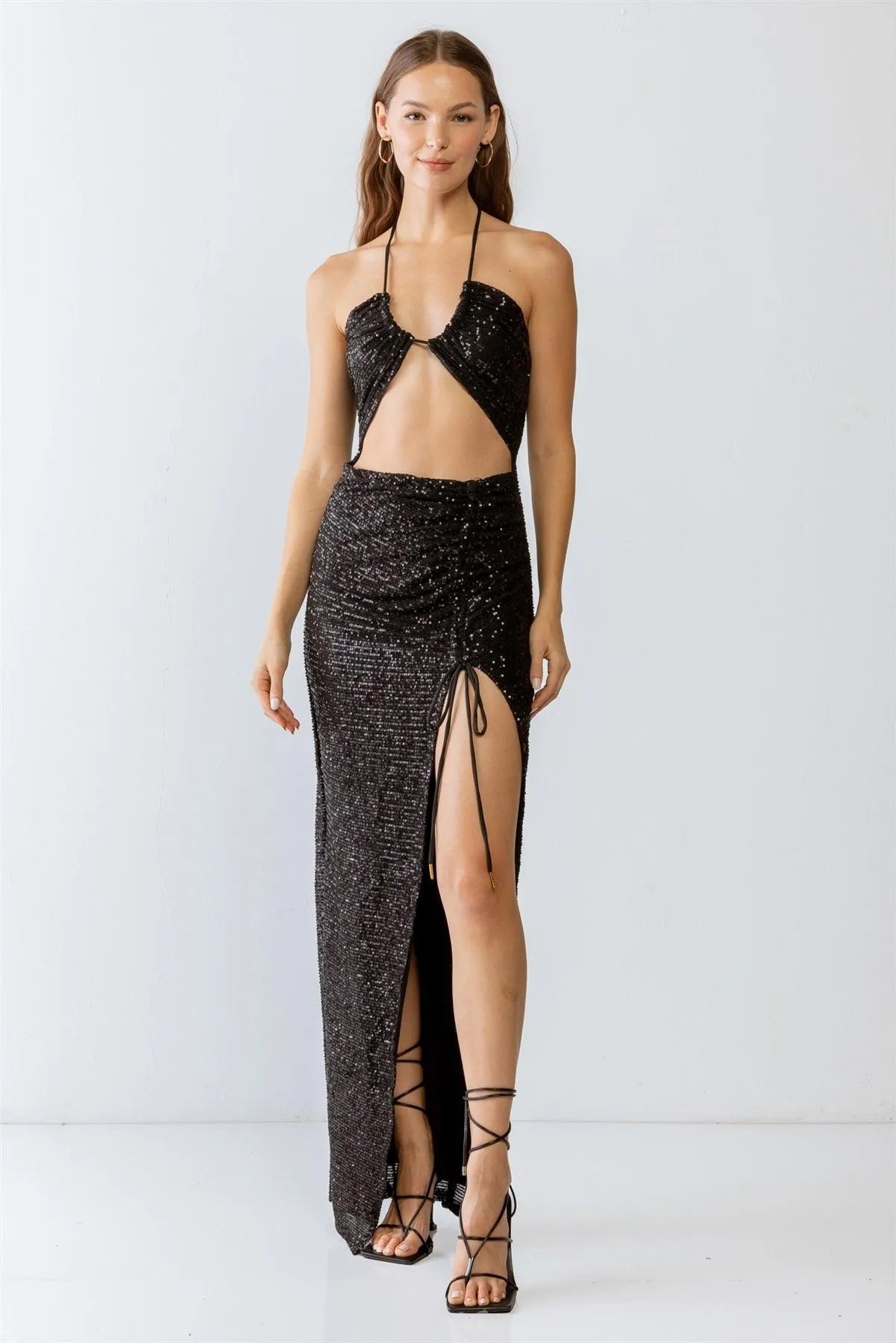 Black Sequin Halter Neck Sleeveless Cut-Out & Ruched Detail Maxi Dress /3-2-1