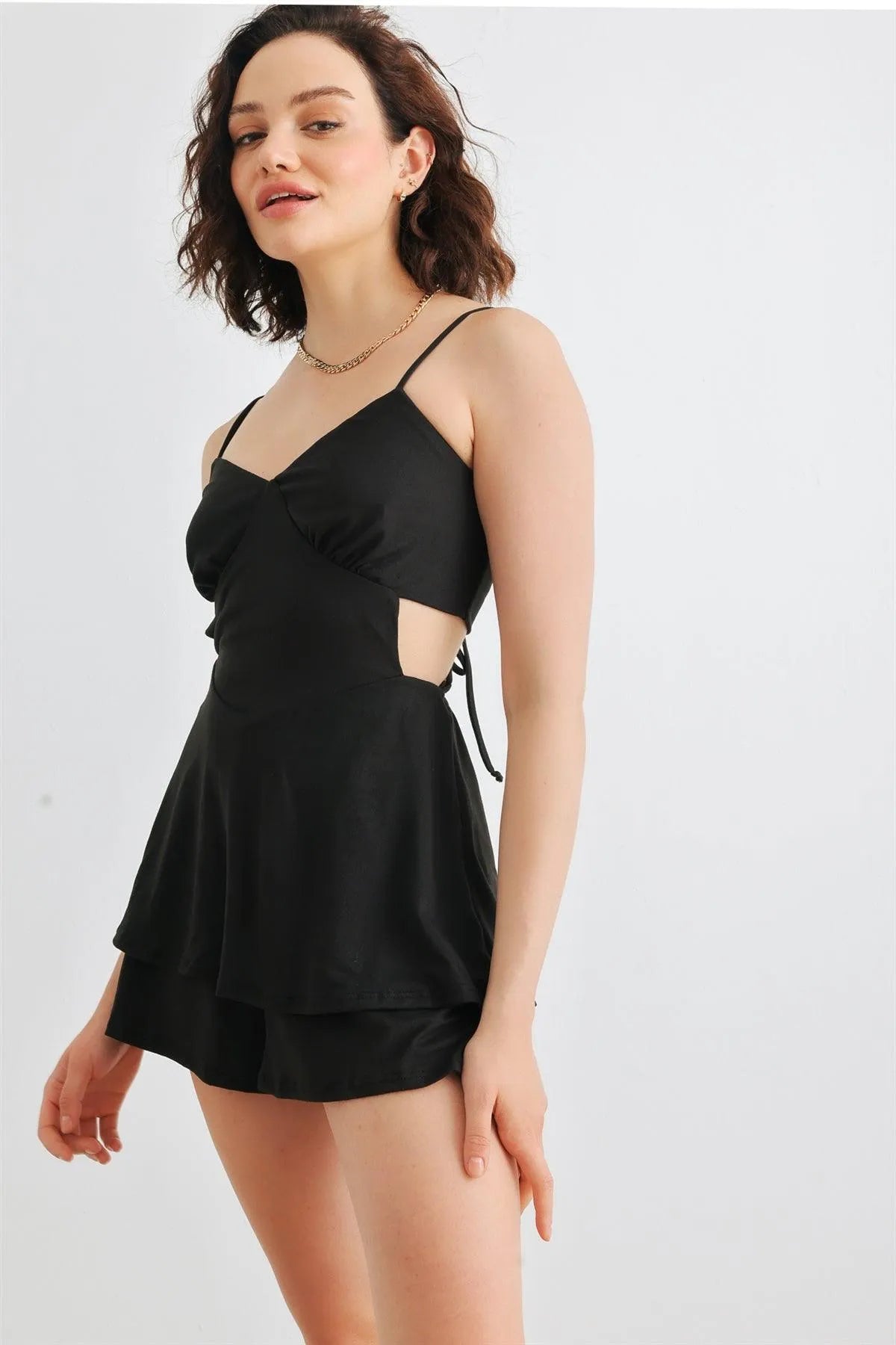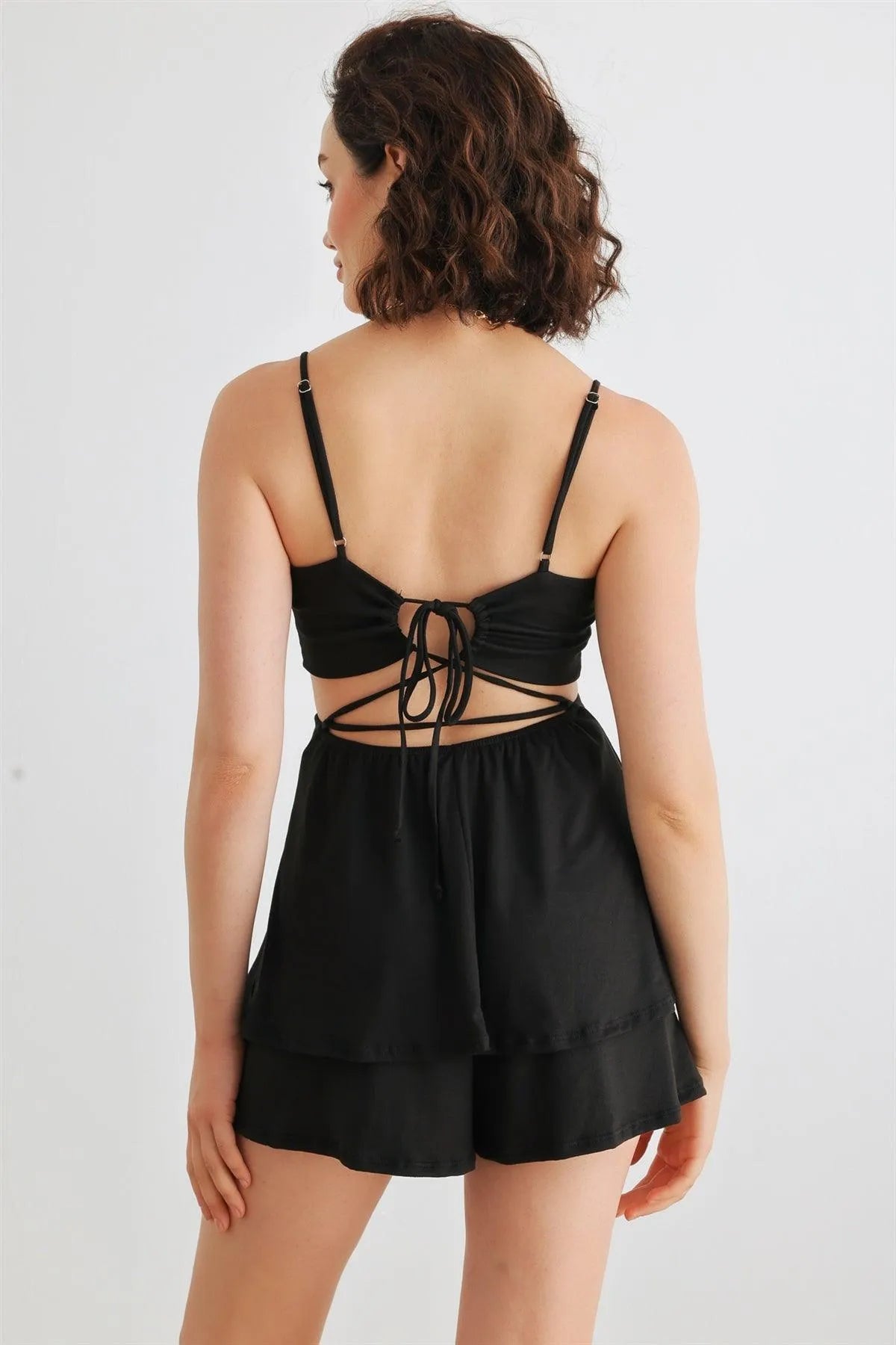 Black Sleeveless Strappy V-Neck Back Lace-Up Romper /1-2-2-1