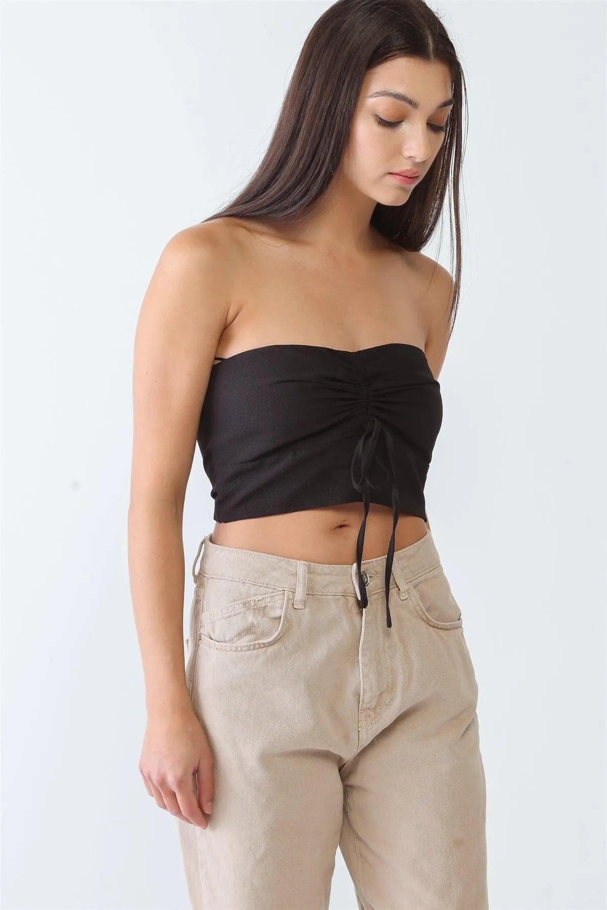 🖤 Item Features: Black, solid color, textured, strapless, front ruched detail with adjustable drawstring, side hidden zip down closure, cropped length top, non-stretchy, lined, not see through, casual, cute, elegant, cool