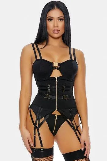 🖤 Item Features: Black, 2 units lingerie set features stretch velor double strap zip front with underwire cups and gold buckle hardware accents, including attached garter straps paired with matching front panty, semi-stretchy, not see through, unlined, hot, sexy