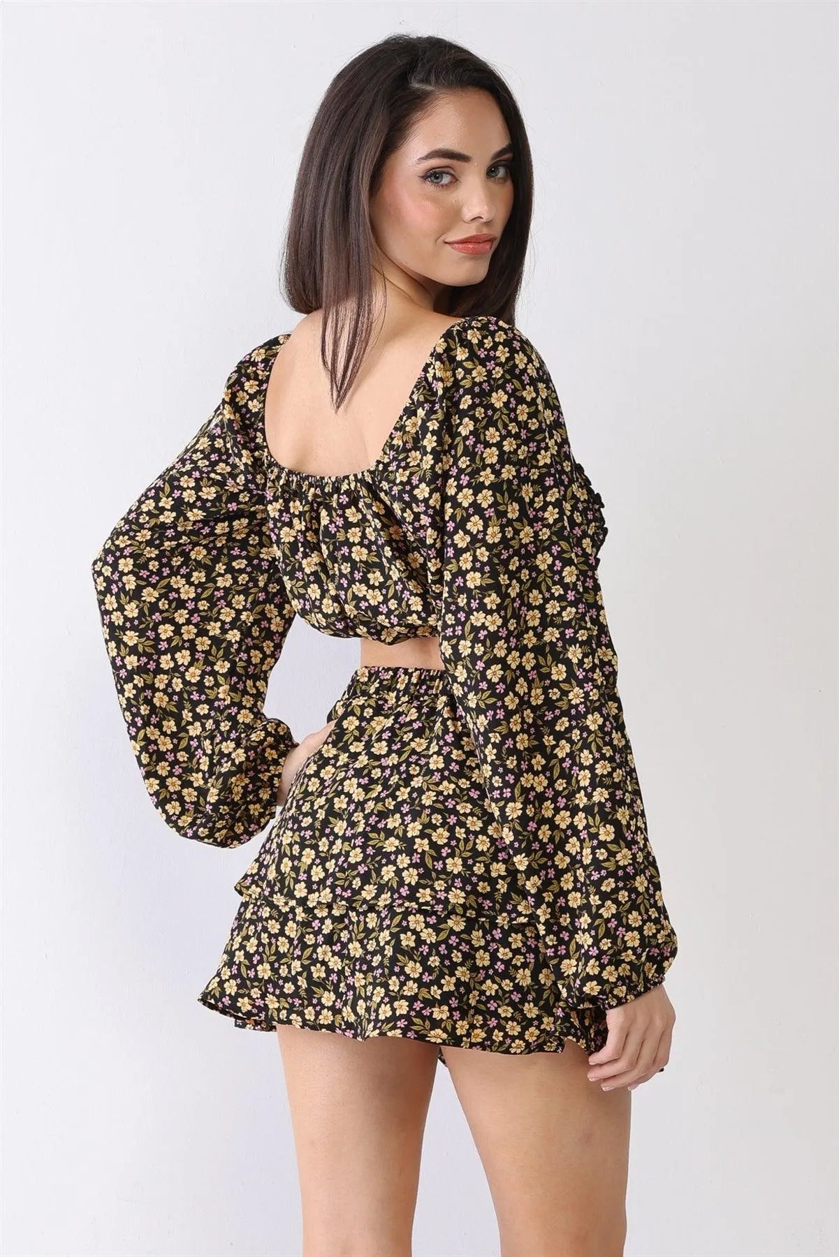 🖤 Item Features: Black & yellow, floral print, sweetheart wrap neckline, puff balloon long sleeves, cropped length top, high waist, layered, elasticized waist, flare hem, mini length skirt, semi-stretchy, lined, non-sheer, casual, cute, girlish, must-have.
