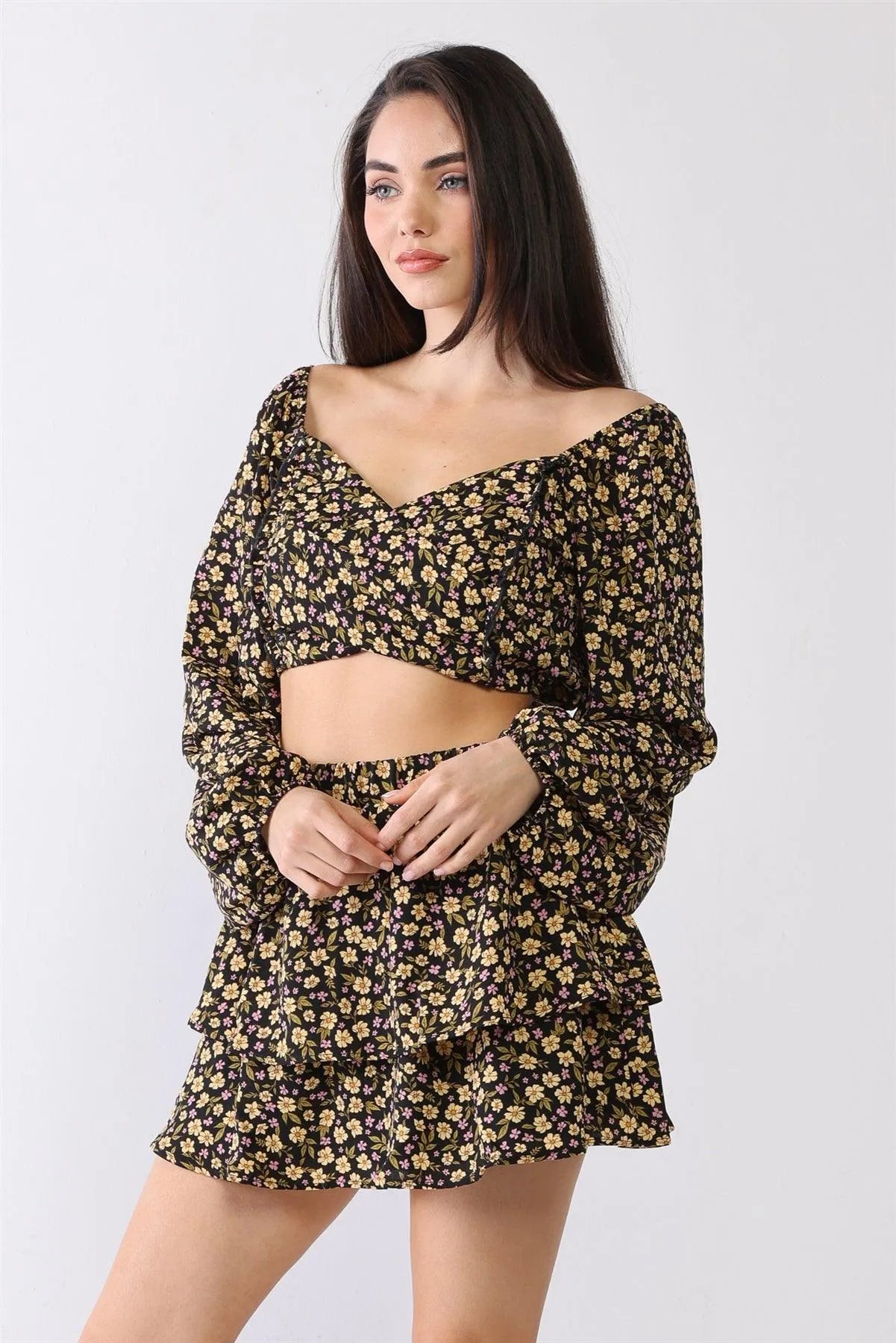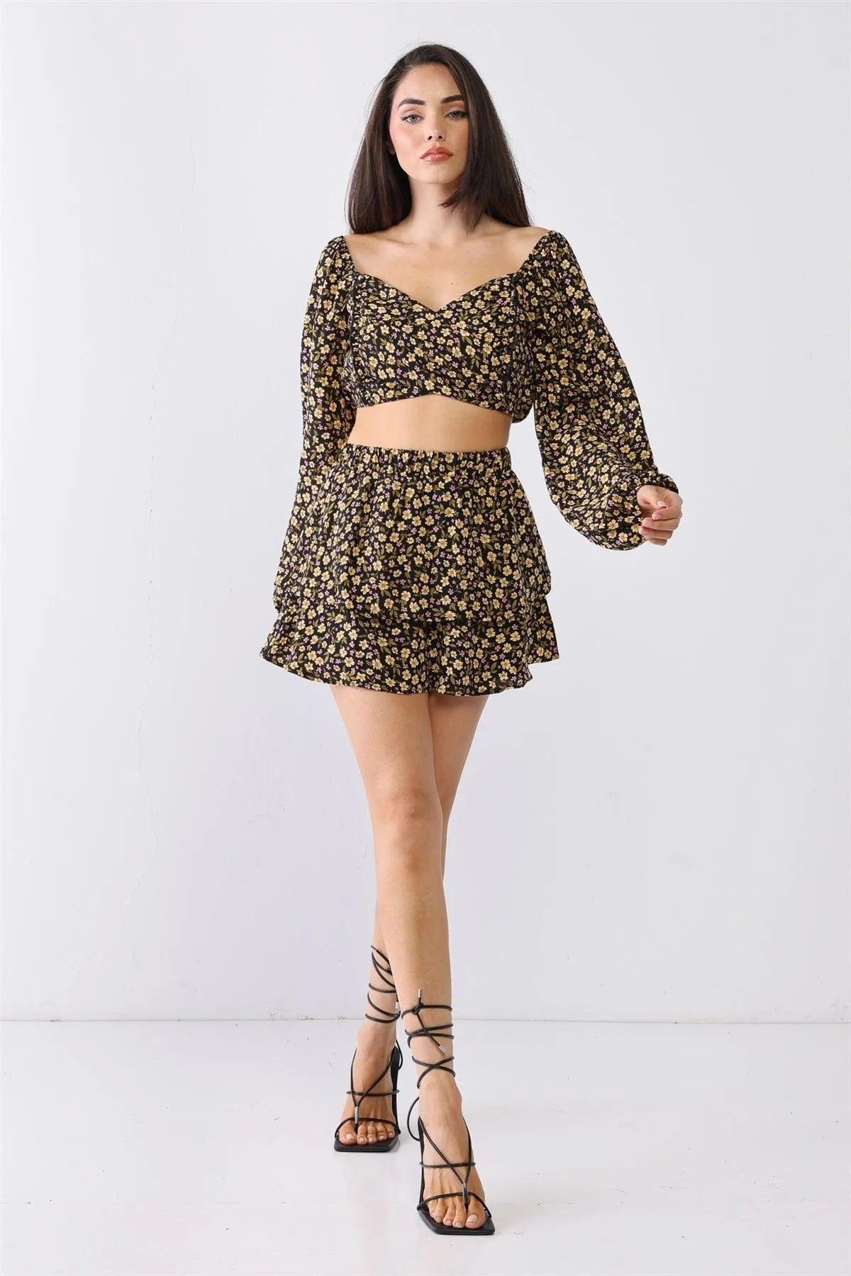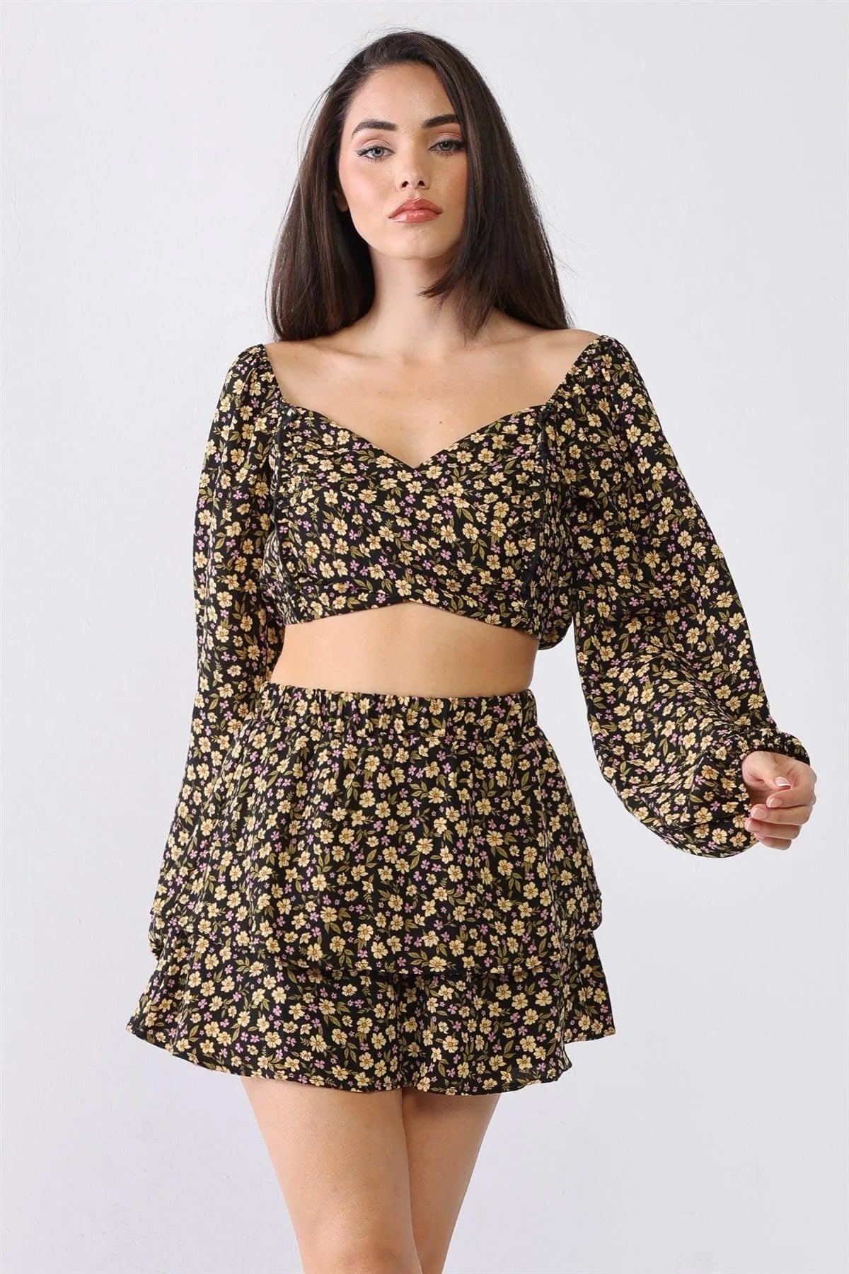 🖤 Item Features: Black & yellow, floral print, sweetheart wrap neckline, puff balloon long sleeves, cropped length top, high waist, layered, elasticized waist, flare hem, mini length skirt, semi-stretchy, lined, not see through, casual, cute, girlish, must-have.