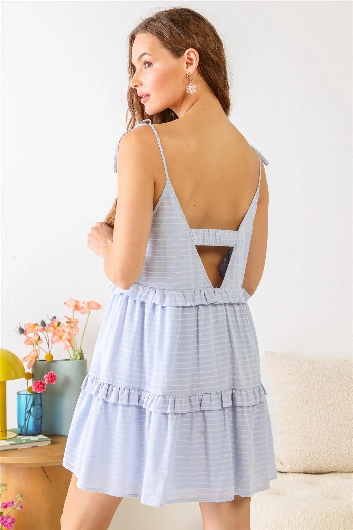 🖤 Item Features: Blue, cotton material, lines print, ruffles, flare hem, self-tie straps, back cut-out detail, mini length, semi-stretchy, lined, non-sheer, cute, girlish, trendy, must-have