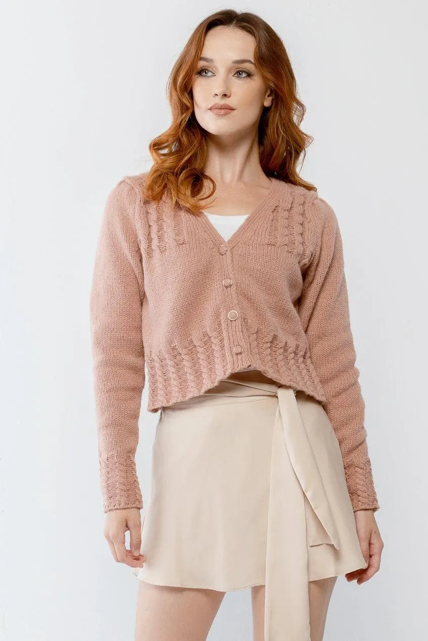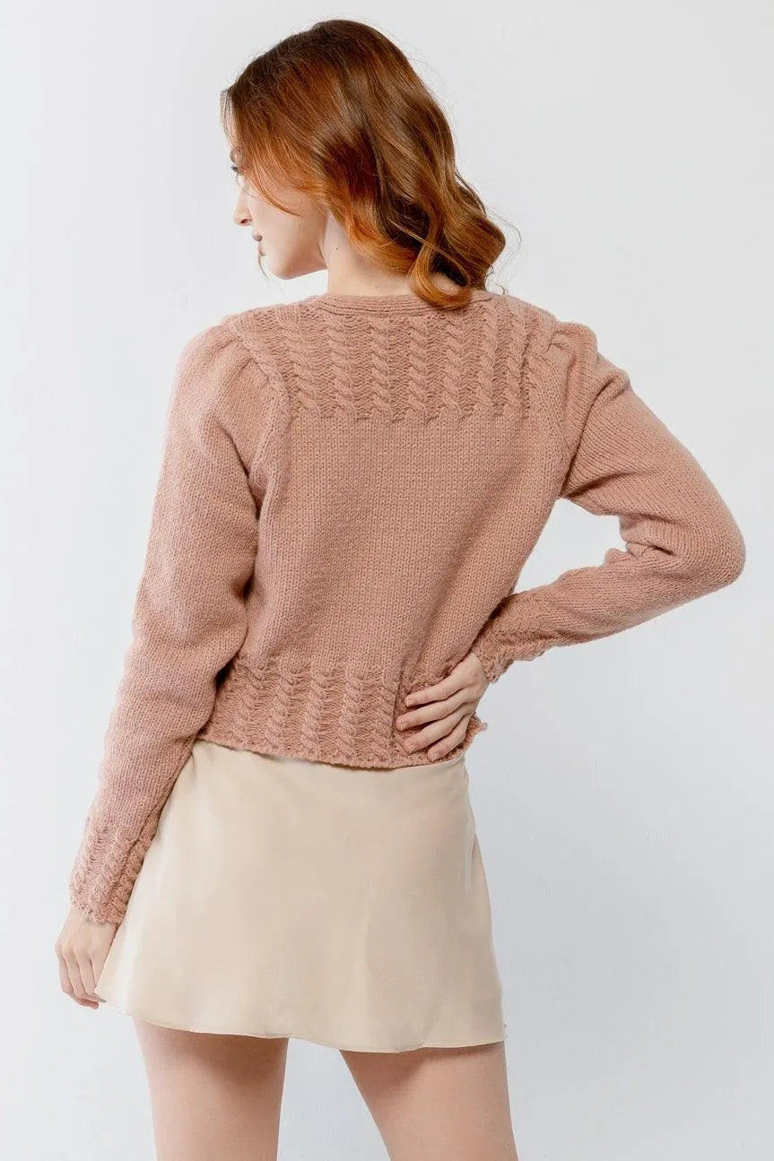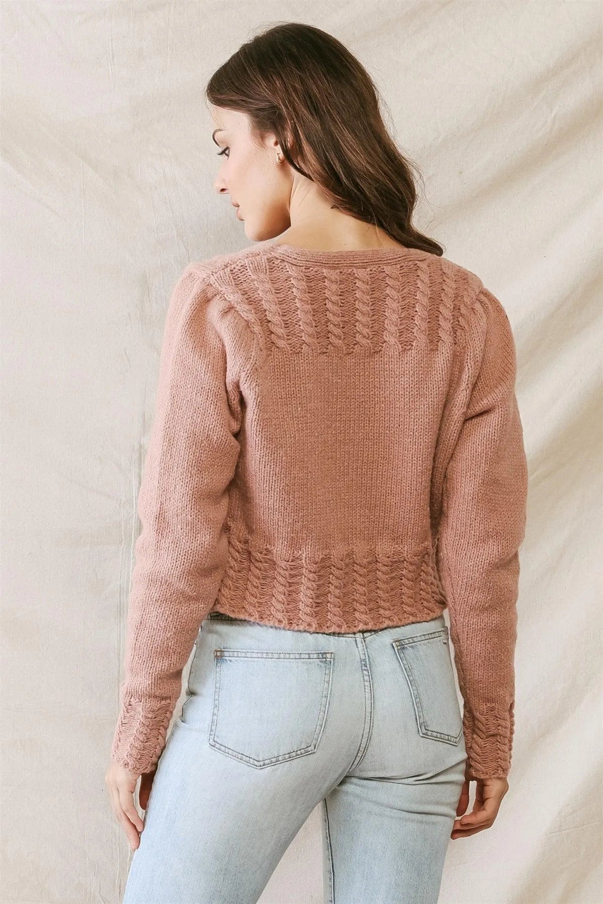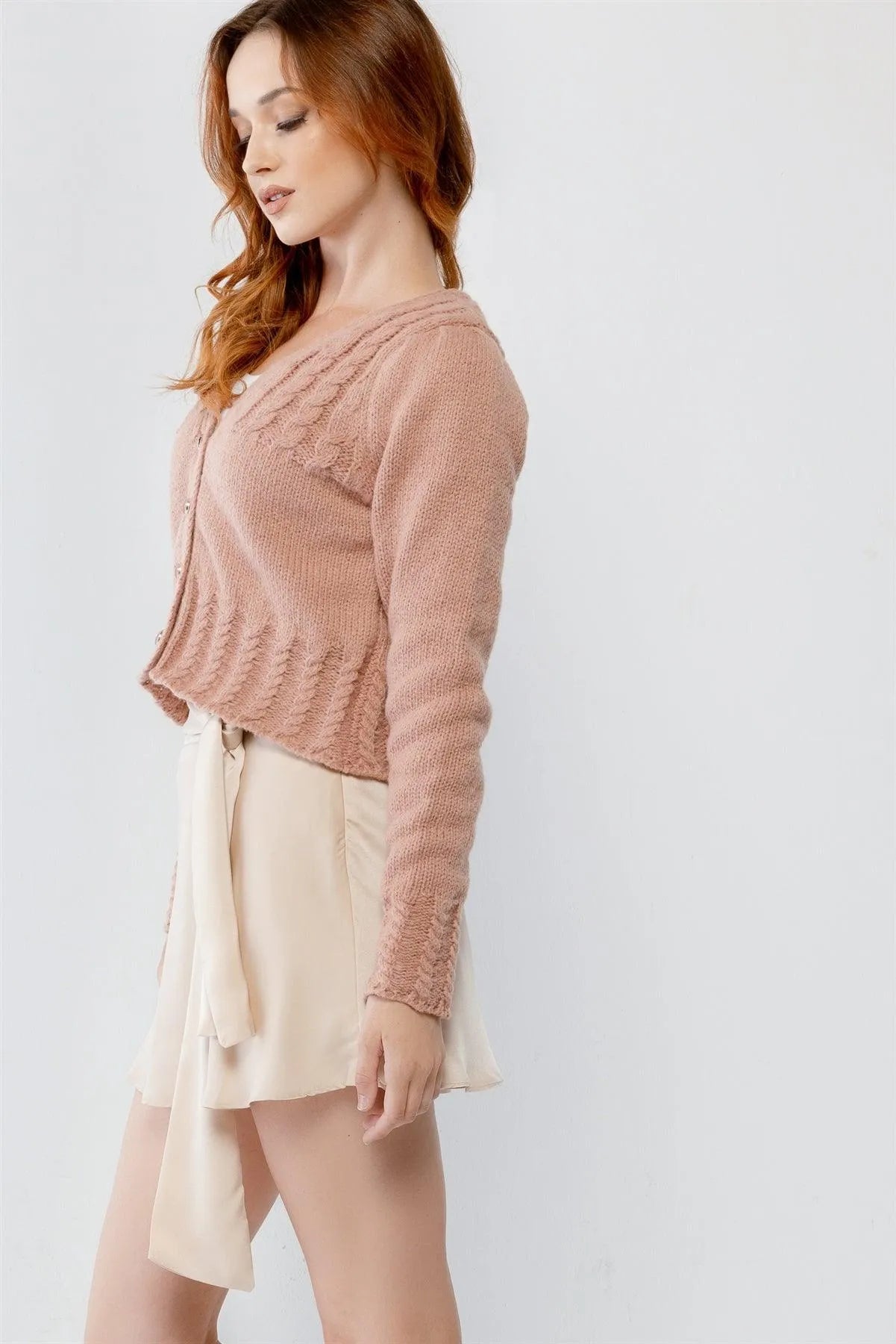 Blush Cable Knit Front Button-Up Long Sleeve Cropped Sweater /2-2-2
