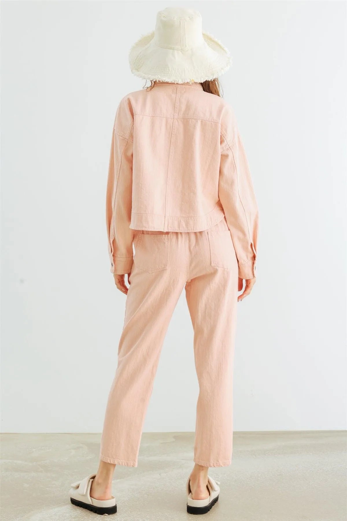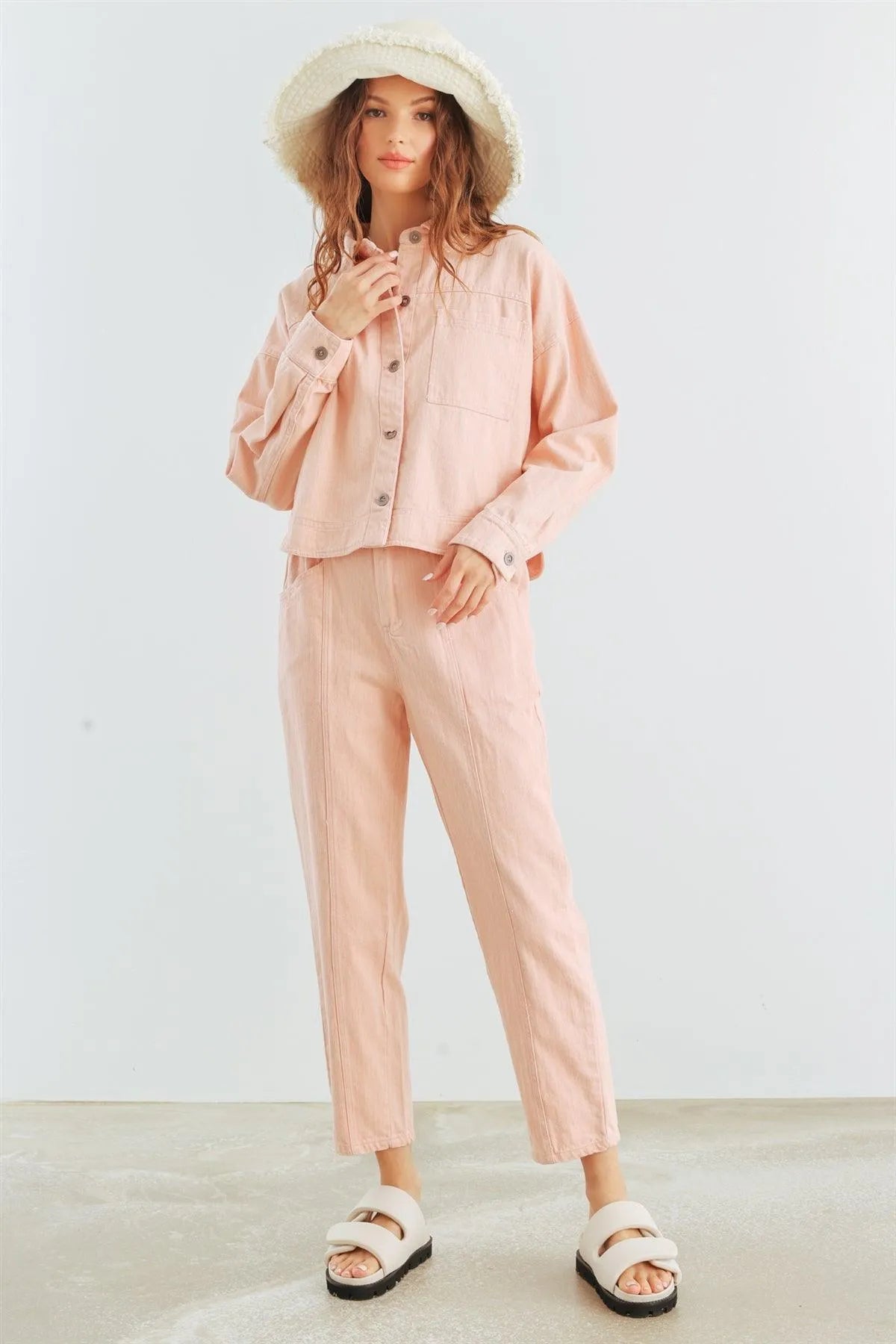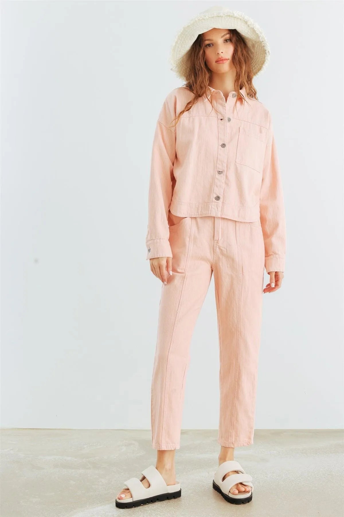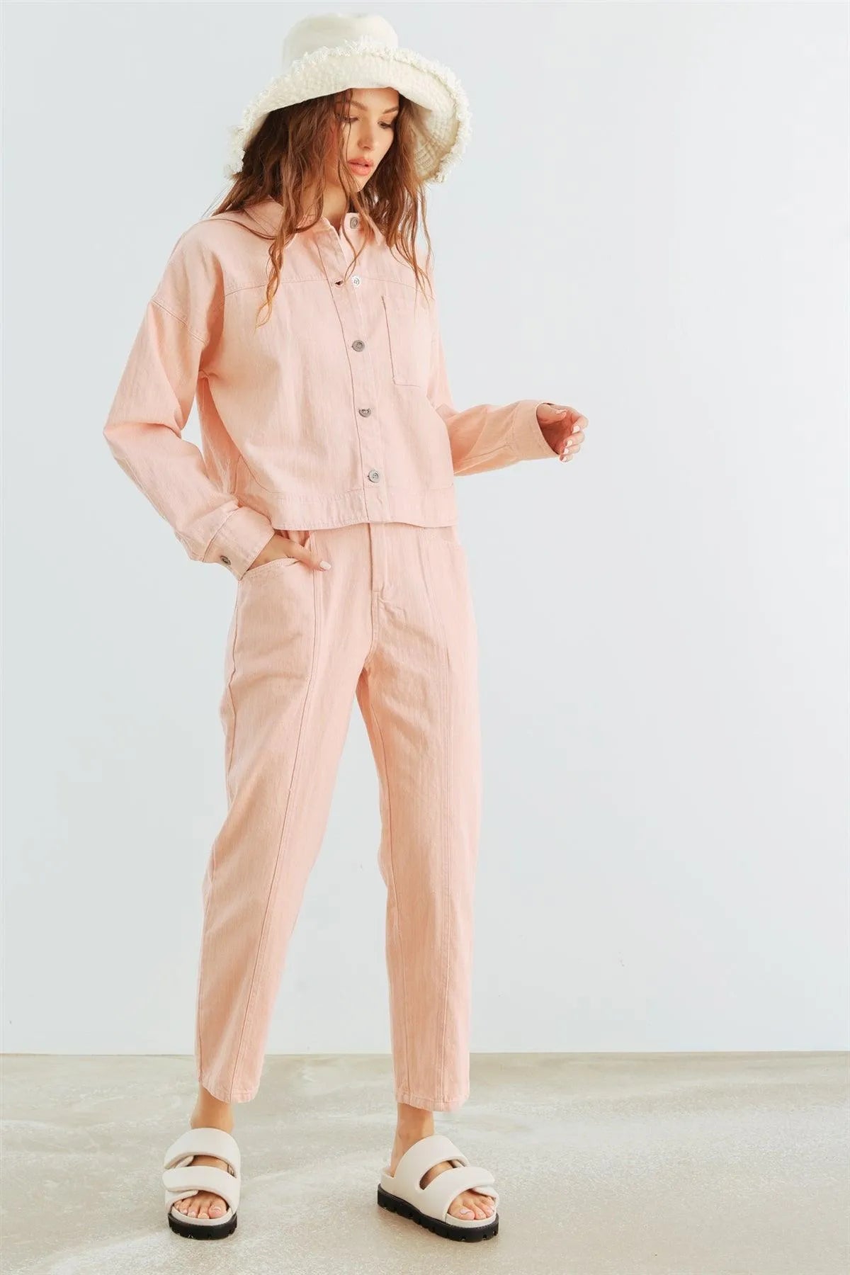 Blush Denim Cotton Button-Up Collared Neck Jacket & High Waist Pants Set /2-2-2