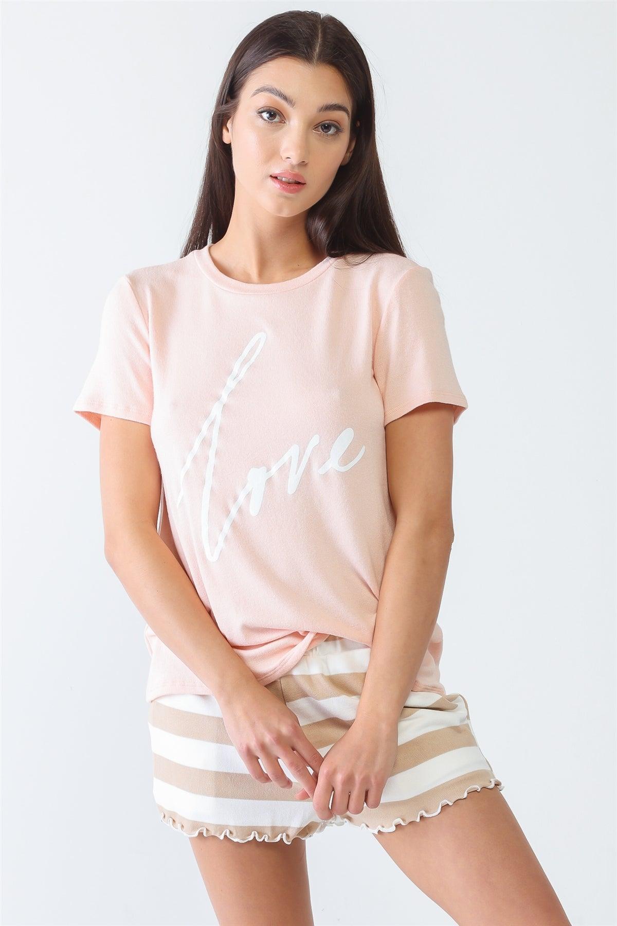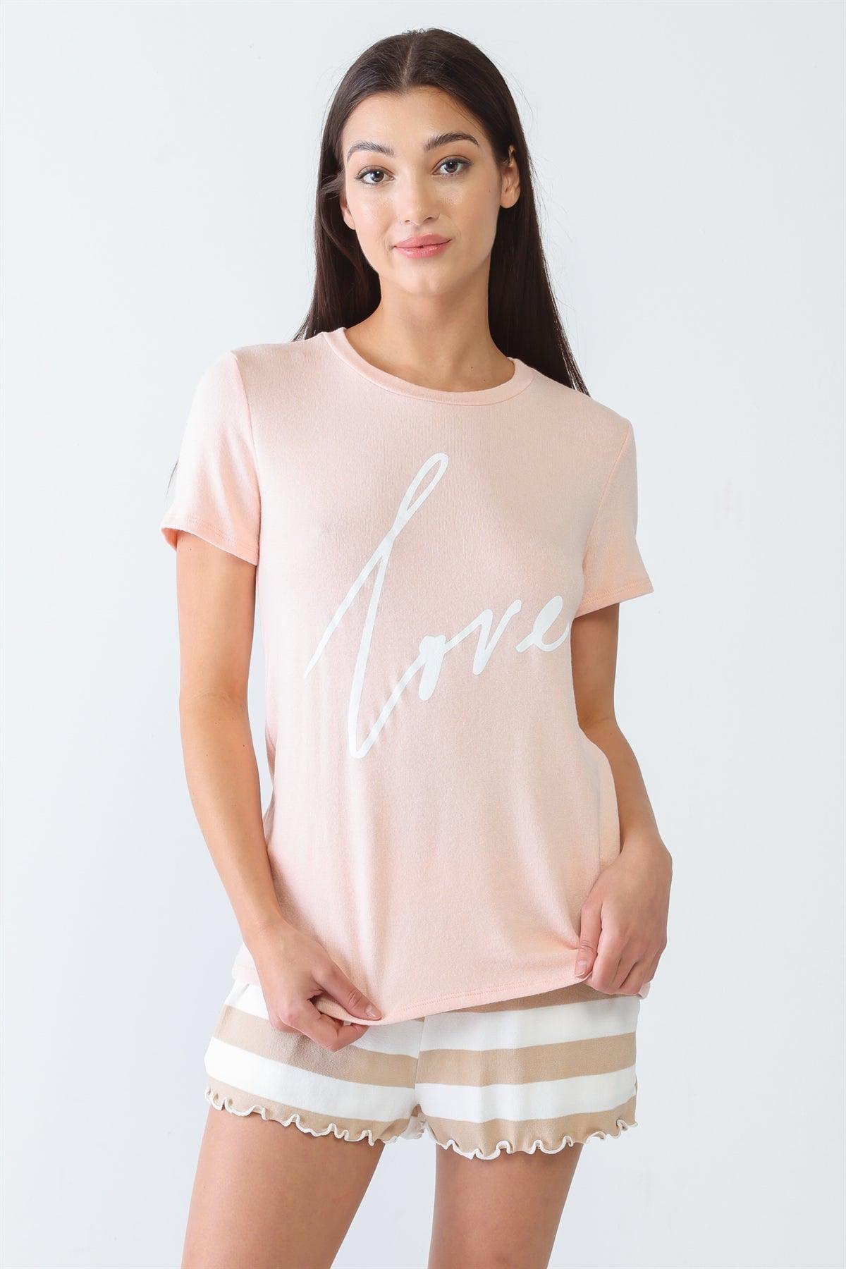 🖤 Item Features: Blush, "Love" print, short sleeves, crew neckline, relaxed fit, semi-stretchy, unlined, not see through, casual, cute.