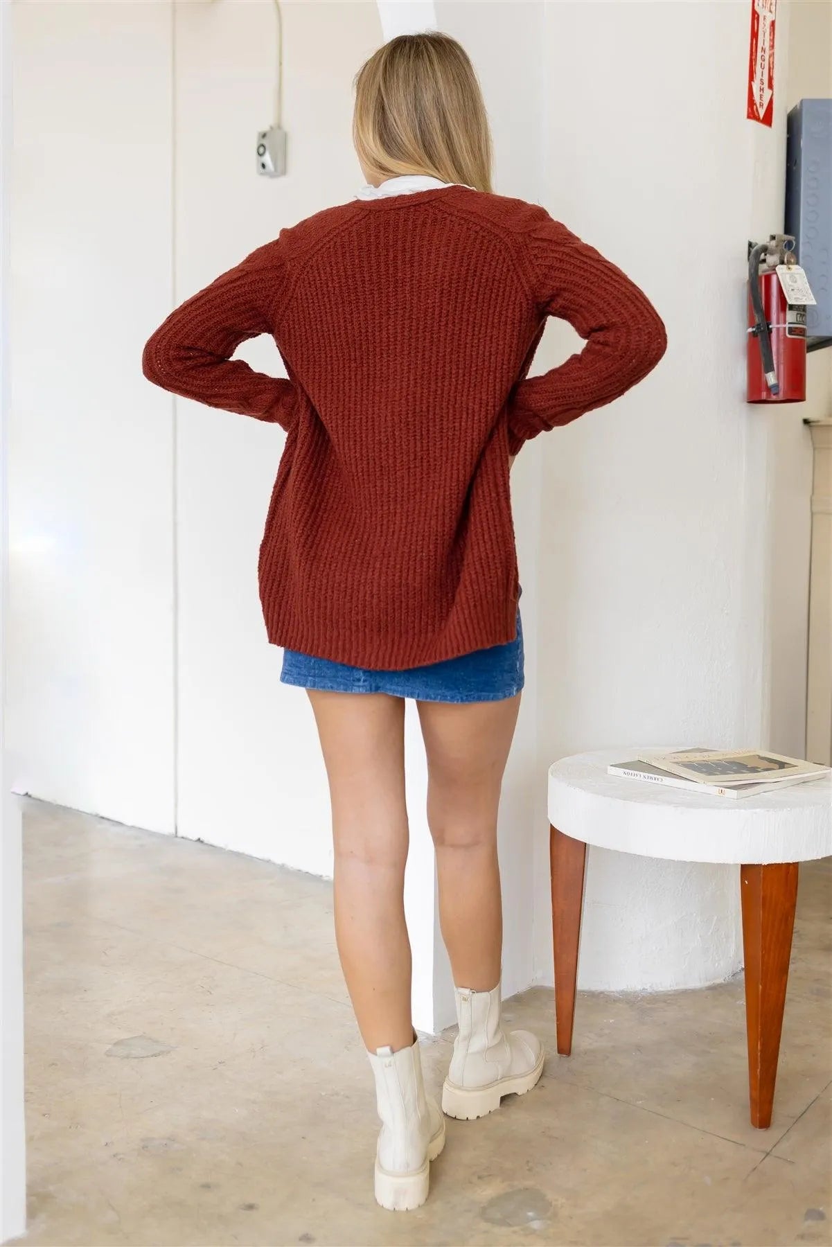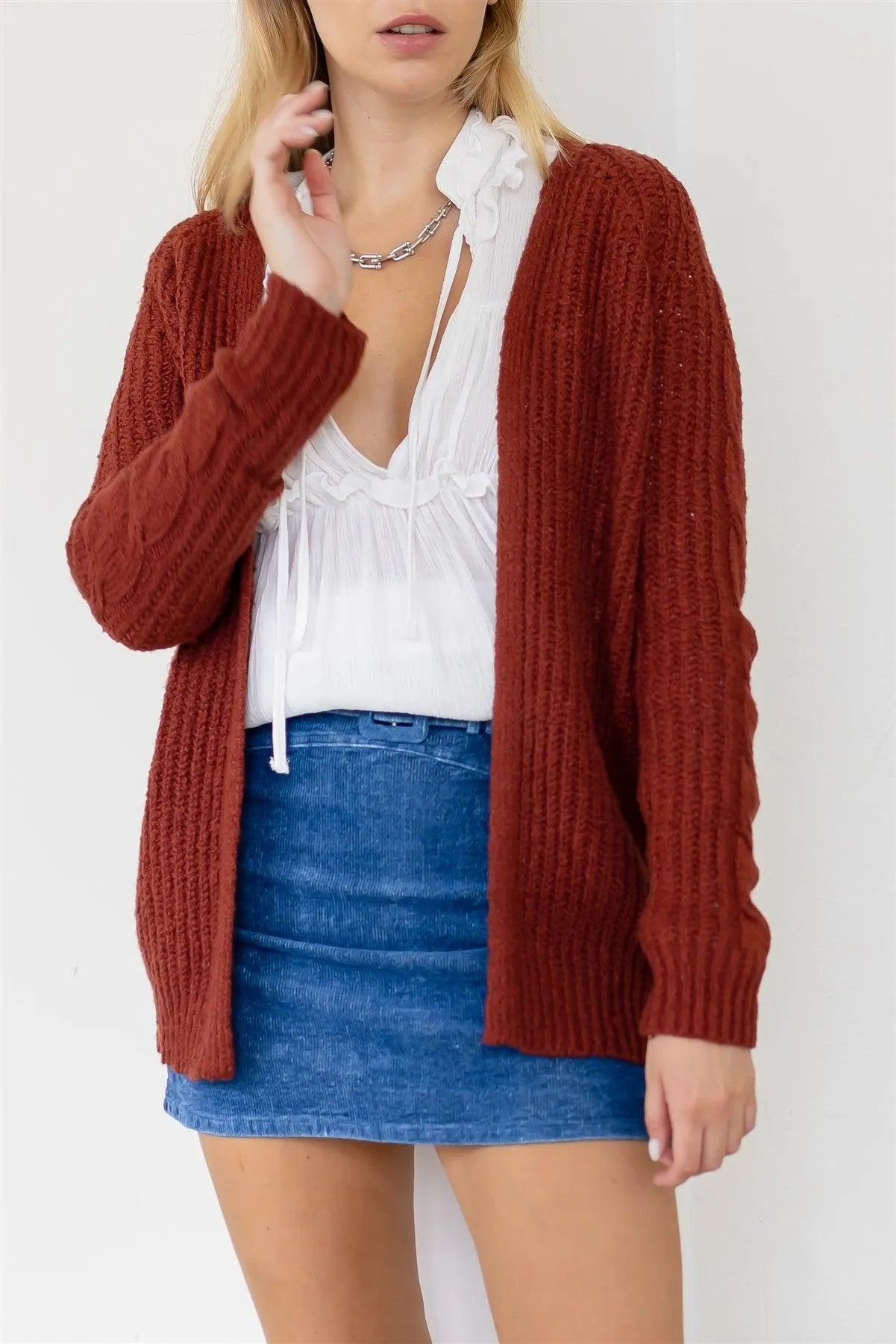 🖤 Item Features: Brick, solid color, cable-knit cotton blend, open front, long sleeves, cuffed hem, relaxed fit, not see through, stretchy, unlined, comfy, super soft to touch, casual, chic, basic, fall/winter collection