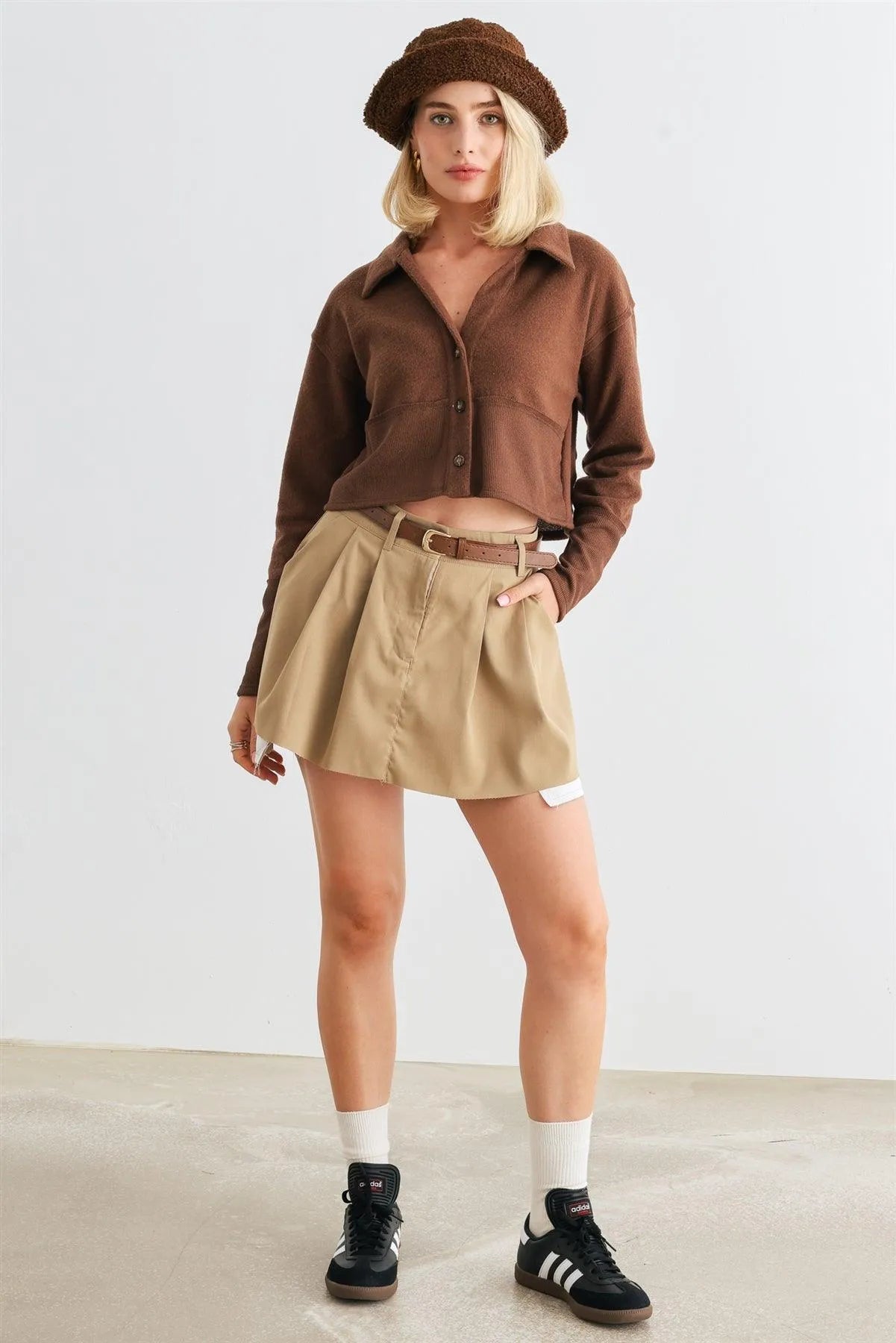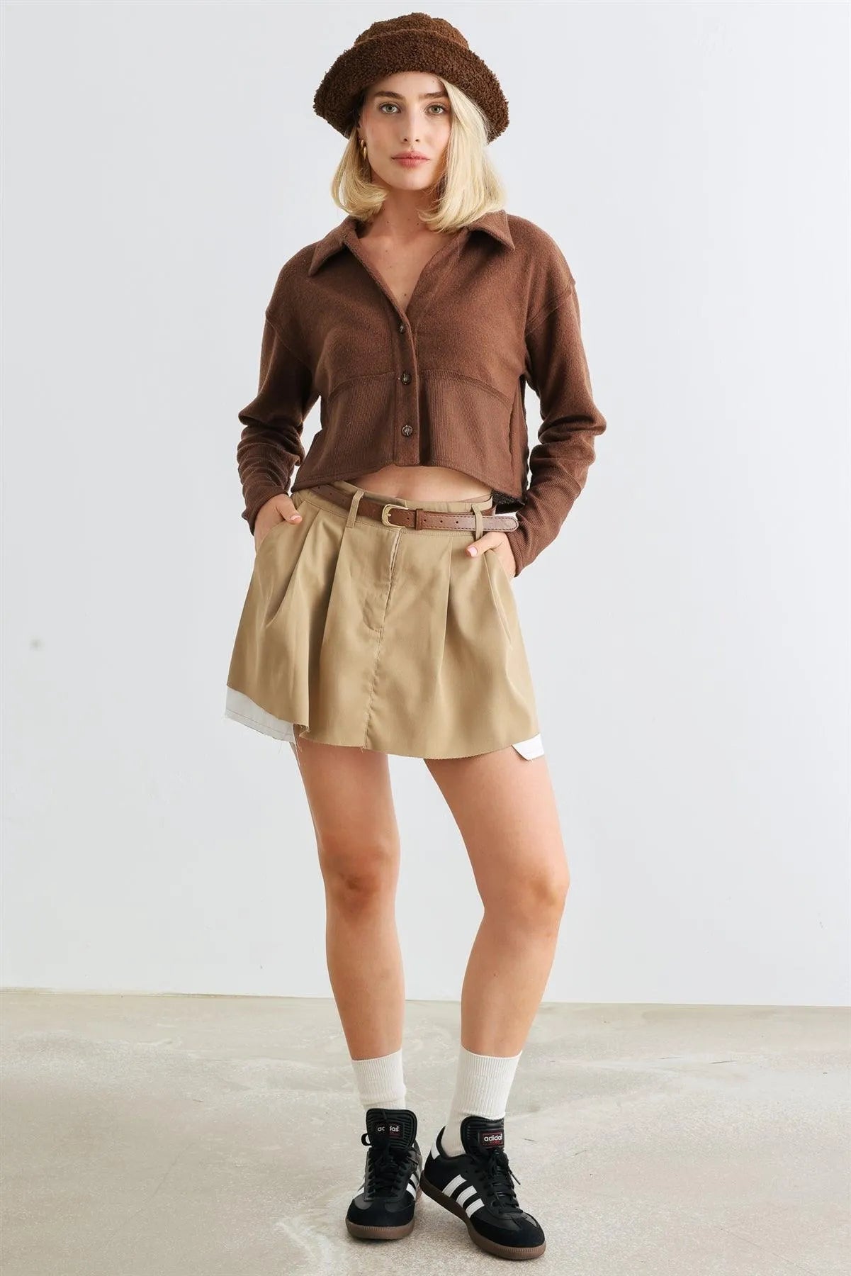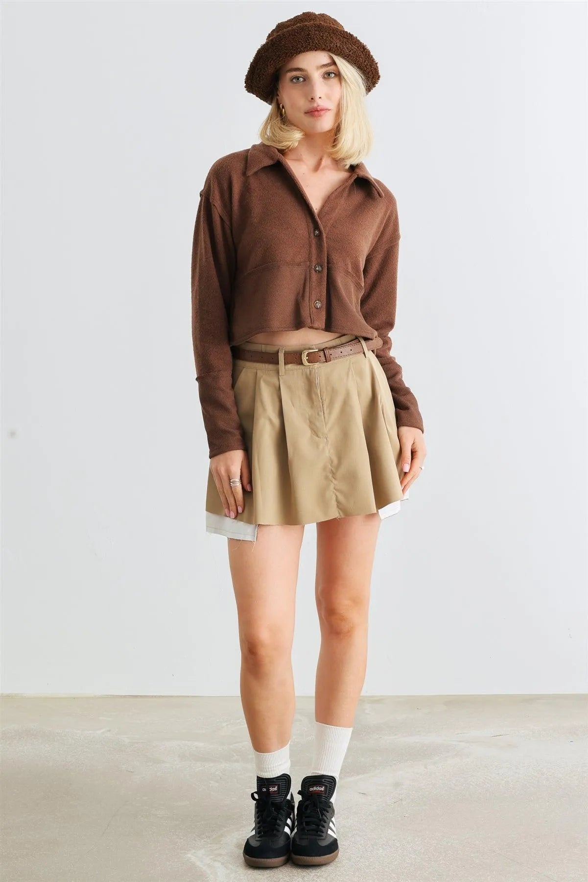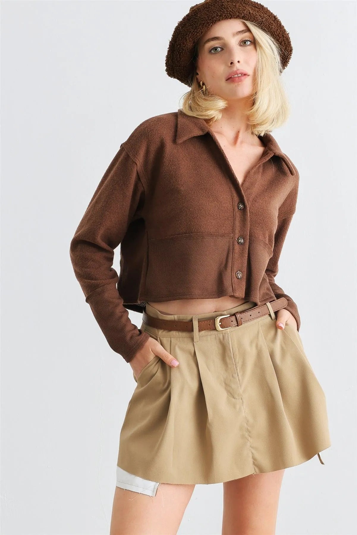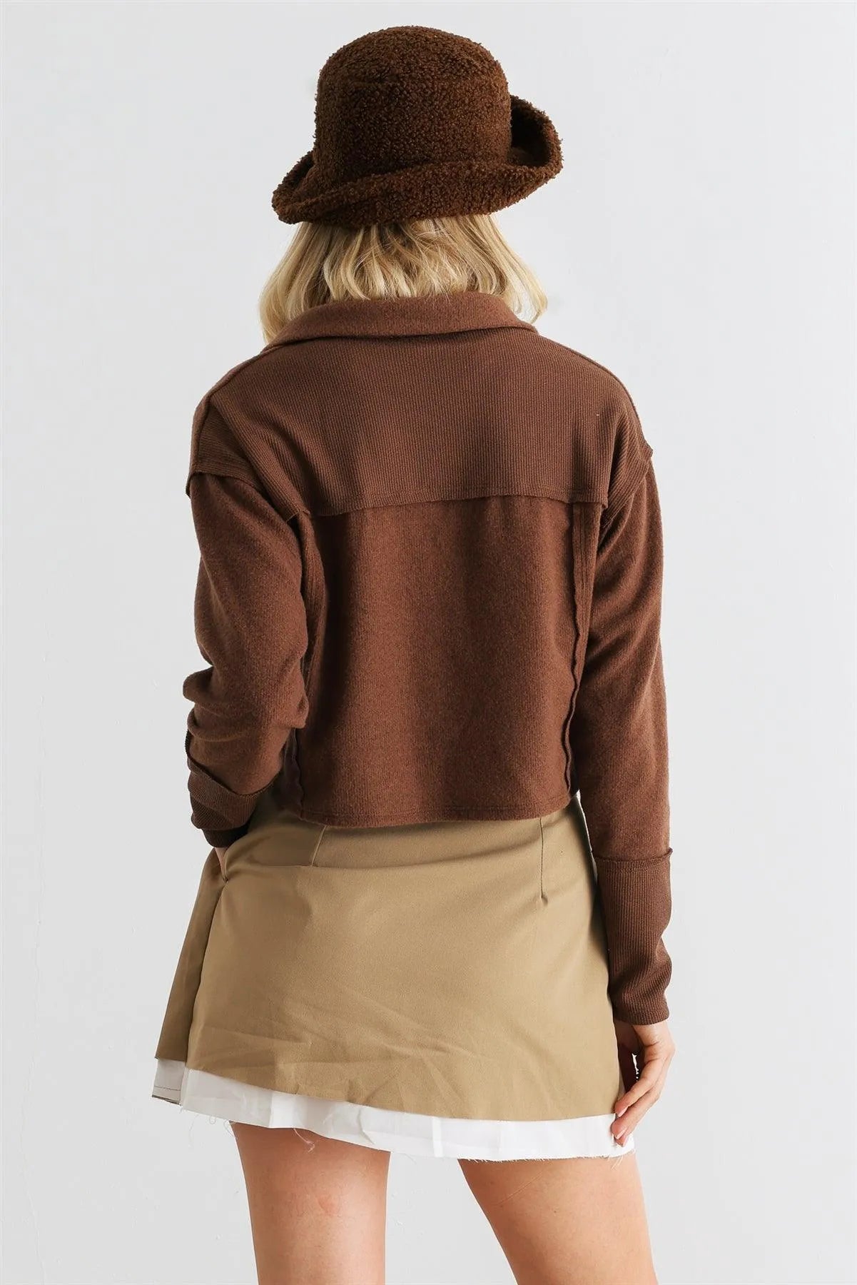 Brown Long Sleeve Button-Up Collared Neck Crop Top /1-2-2-1