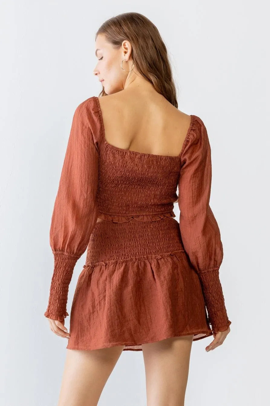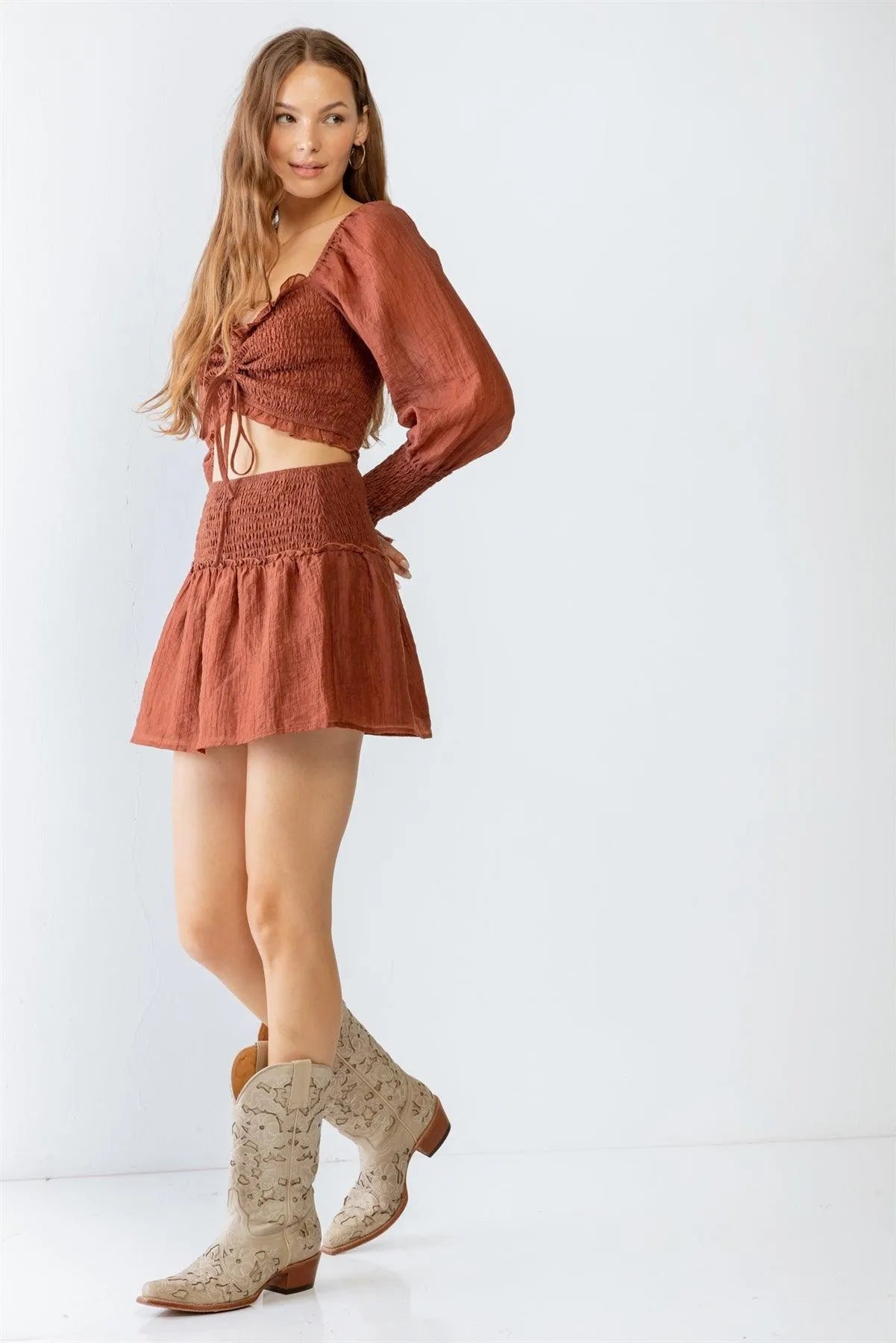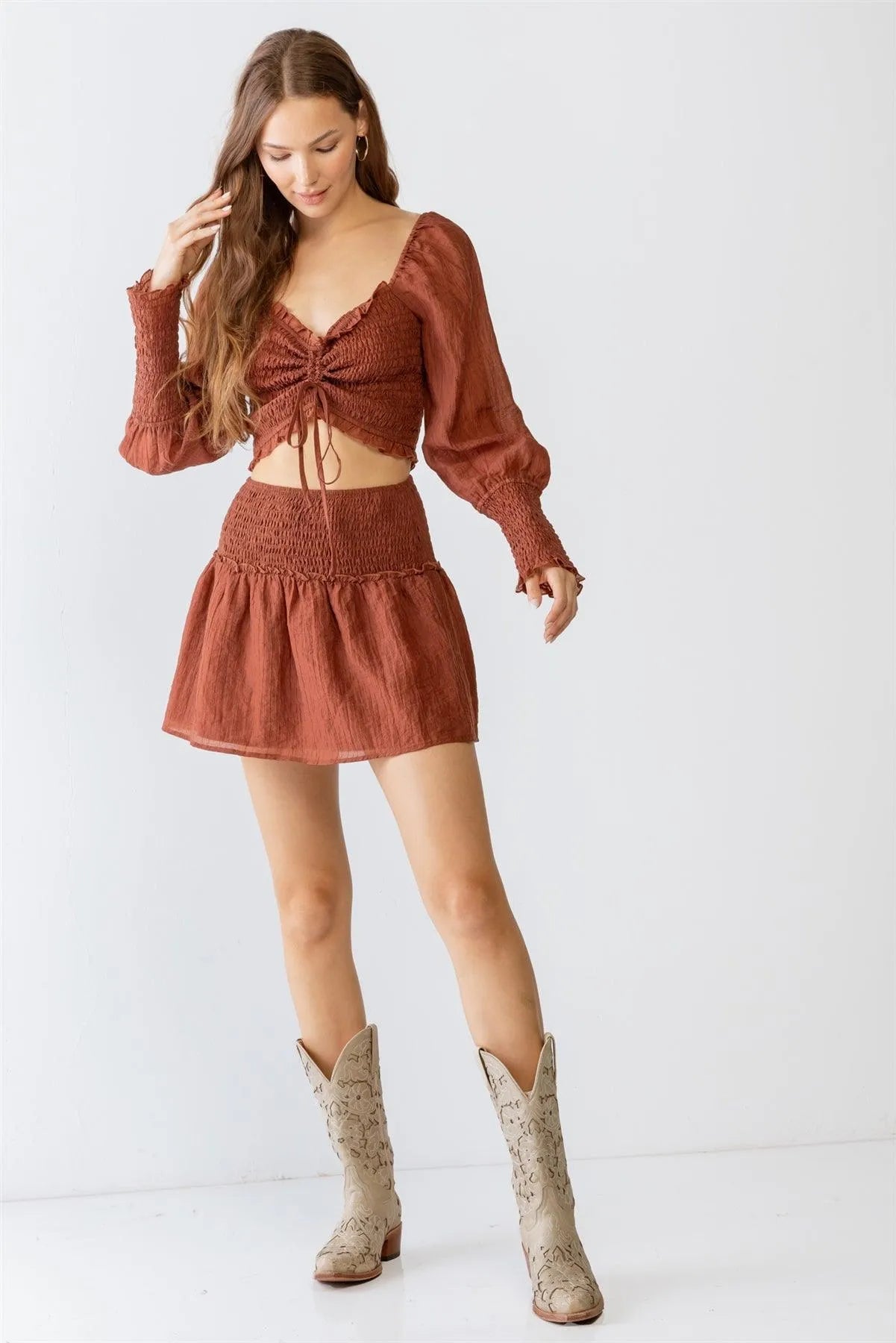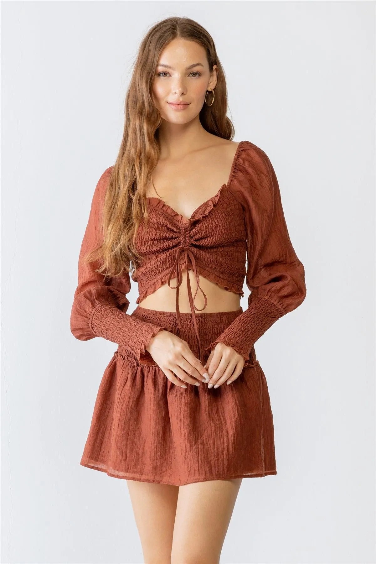 🖤 Item Features: Brown, crinkled material, smocked, front ruched detail with adjustable drawstring, riffle details, solid color, puff balloon long sleeves, cropped length top, smocked, mini length skirt, semi-stretchy, lined, non-sheer, casual, cute, lifestyle, girlish.