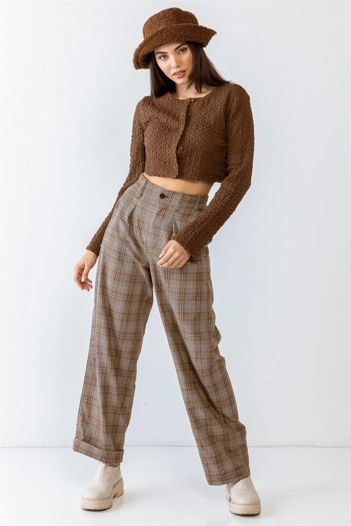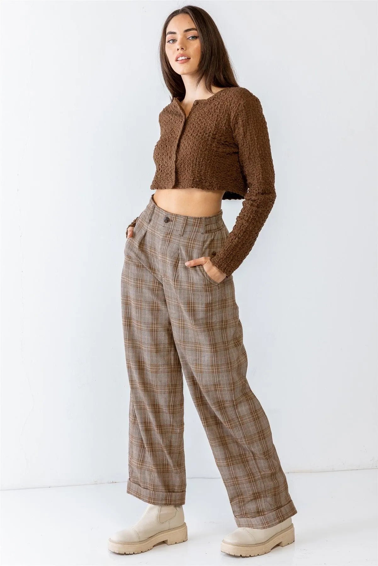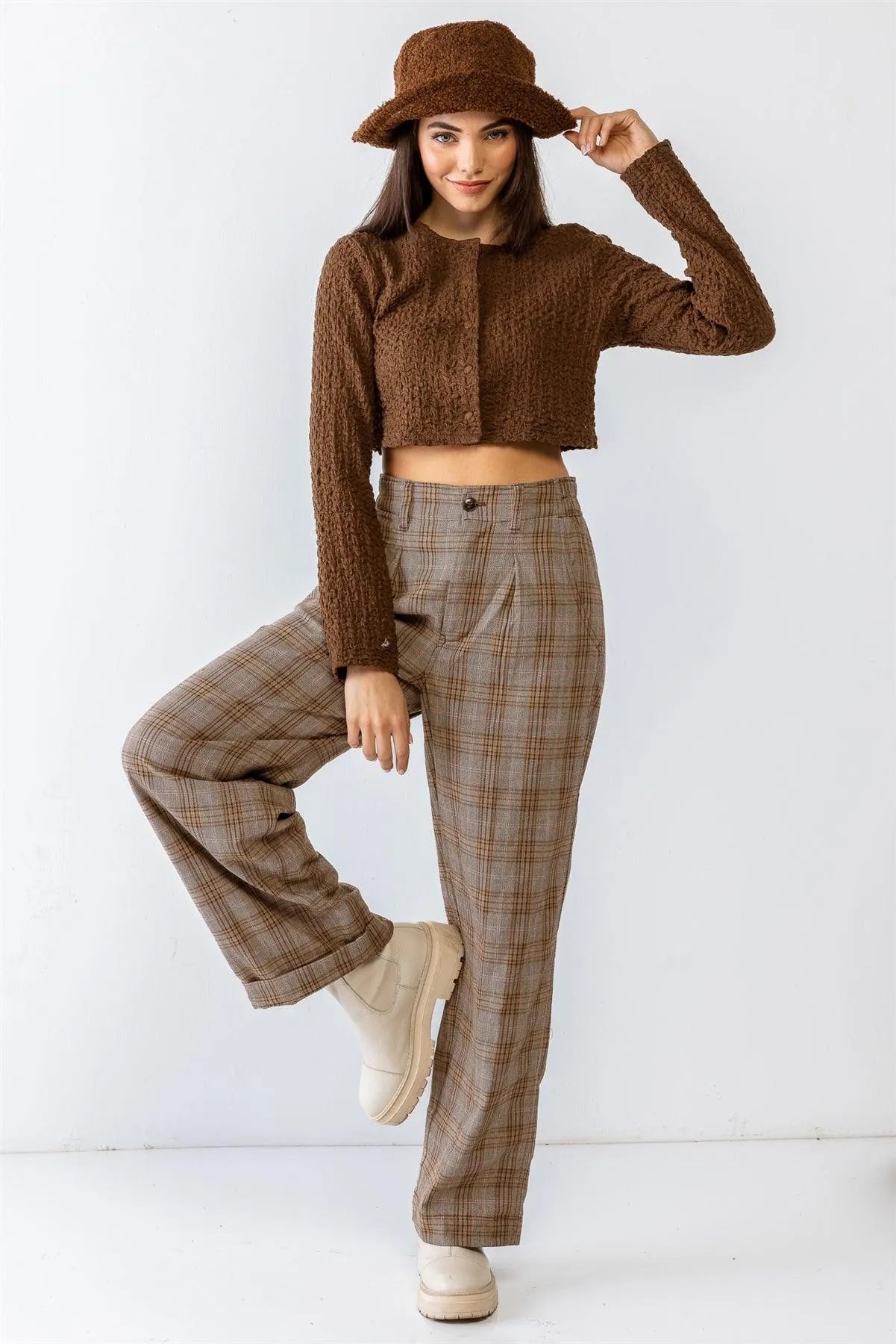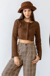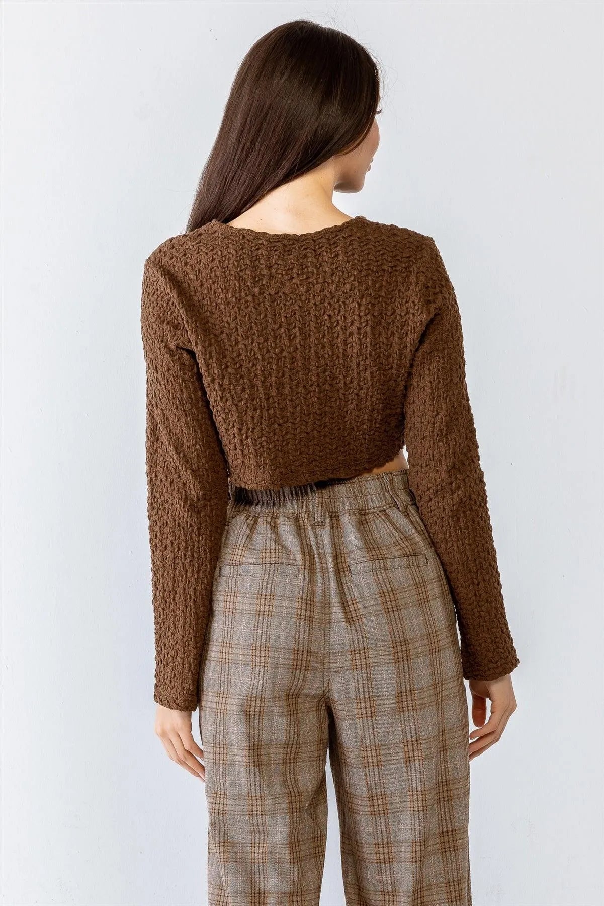 Brown Crumpled Button-Up Long Sleeve Crew Neck Crop Top /1-2-2-1