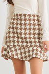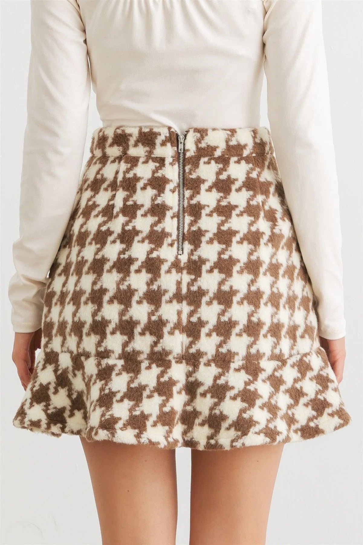 🖤 Item Features: Brown & ivory, abstract print, fluffy knit material, high waisted, back zip-up & eye closure, flare hem, mini length, non-stretchy, not see through, lined, cute, cozy, must-have, stylish