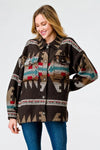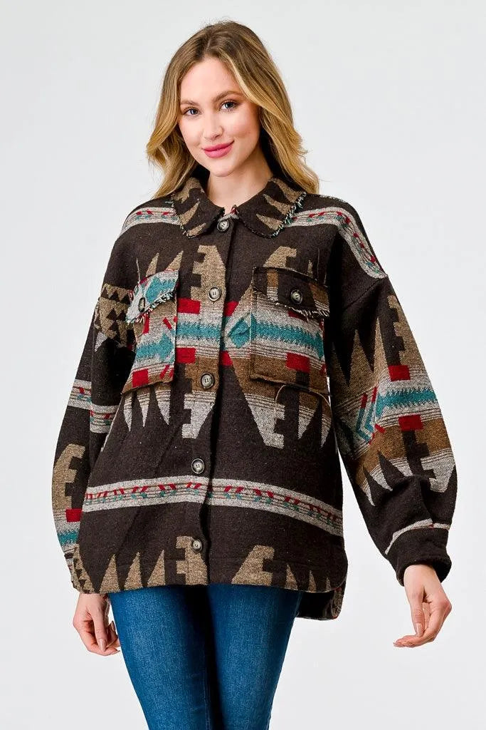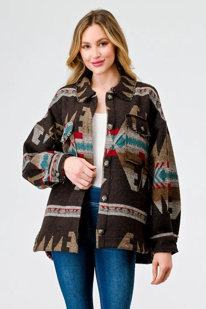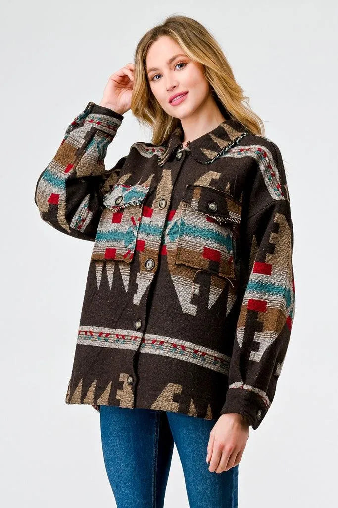 🖤 Item Features: Brown mix, tribal print, long sleeves, button-up, four pockets, collared neckline, trim, non-stretchy, unlined, casual, cute, warm, cozy